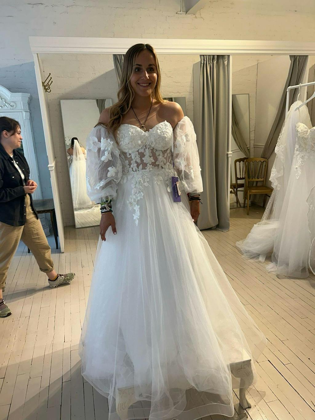 Please note that free shipping and in-store pickup are not available on this wedding dress due to the extra packaging and care it requires. This dress is subject to a $20 restocking fee on returns. To prevent these costs, we invite you to come and try on a demo model of this dress at Boudoir 1861 in Montreal. We also have an exclusive collection of bridal dresses to discover in-store.
