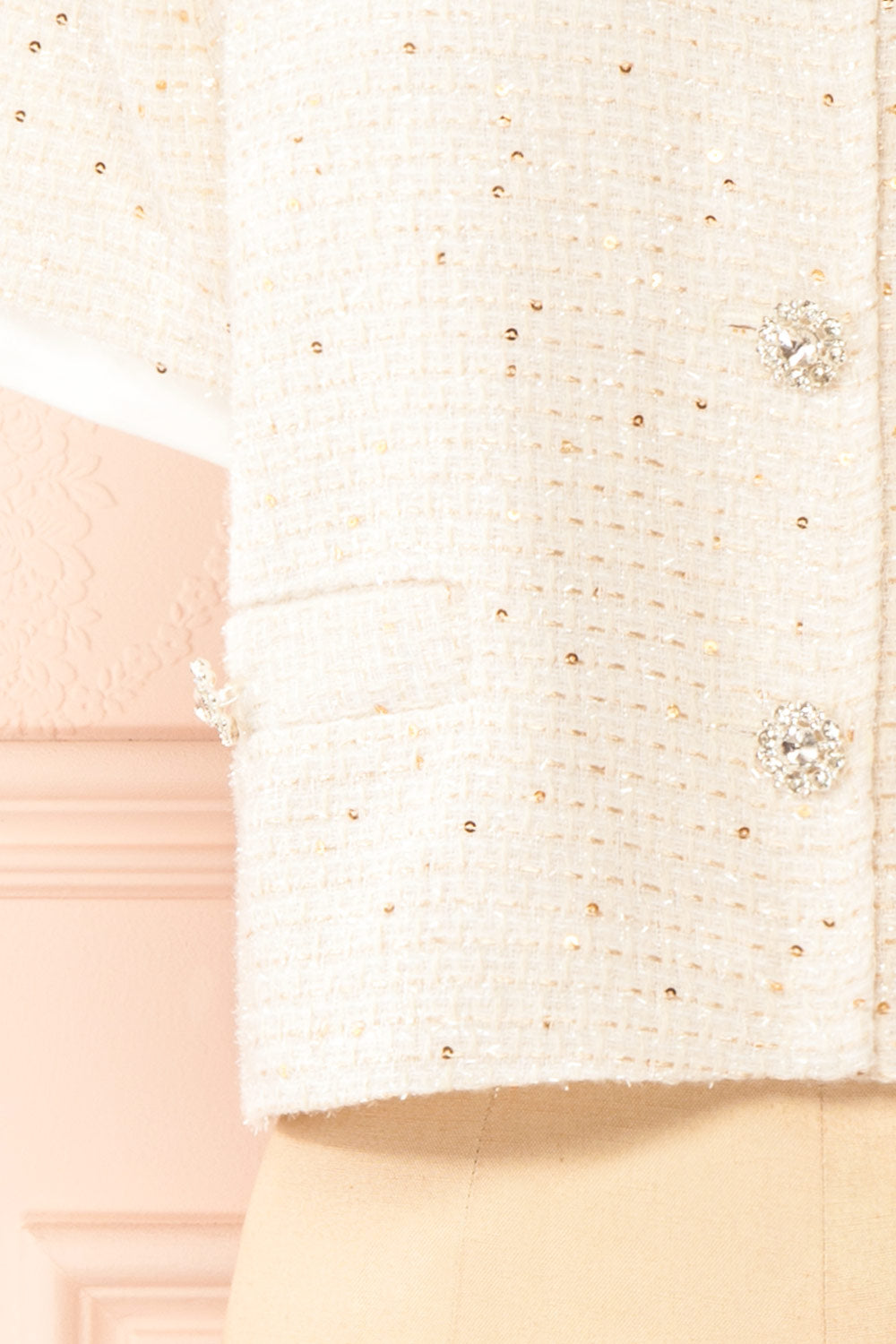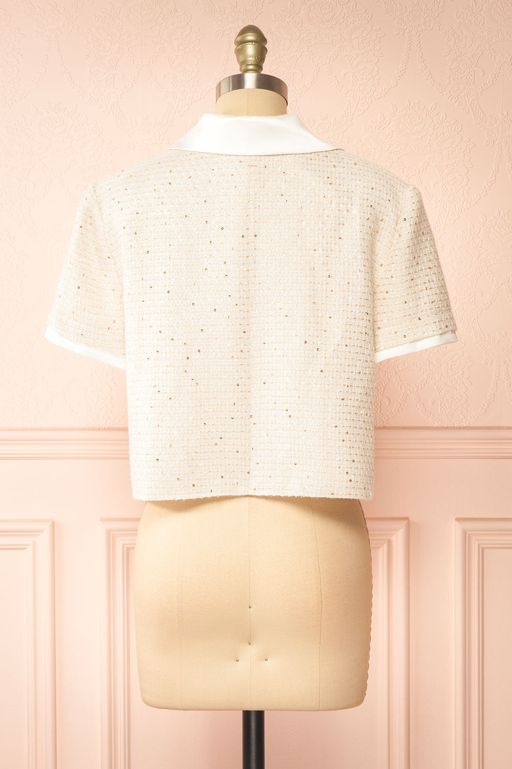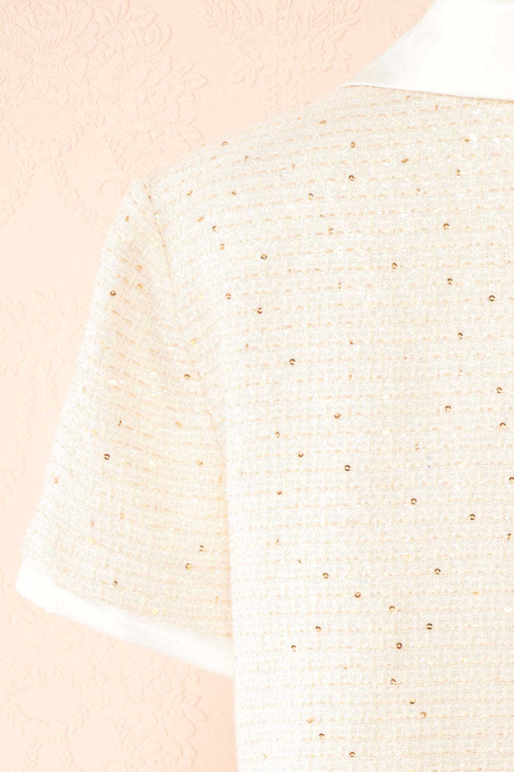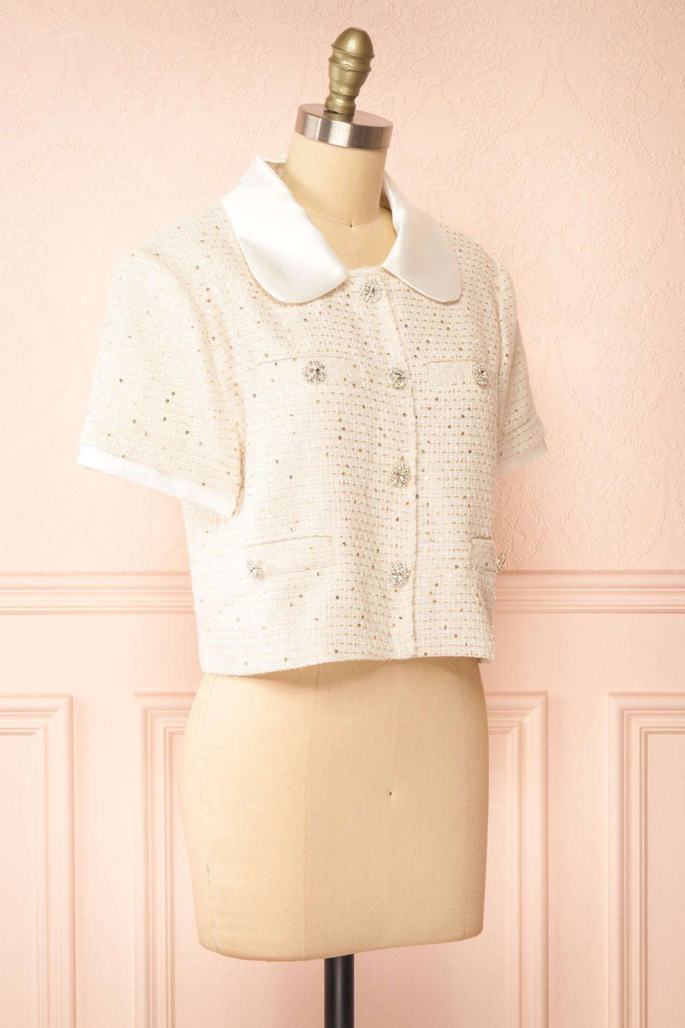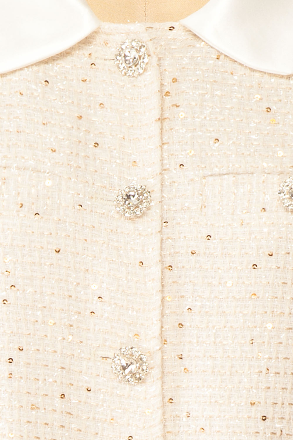 Indulge in luxury in this beige cropped tweed top, elegantly designed with short sleeves and a sweet Peter Pan collar trimmed in white satin. Glittering gold thread accents weaves through, creating a stunning visual appeal alongside the chic silver buttons featuring sparkling crystals. Complete with four decorative pockets, this top is the ideal complement to the MISKILEE skirt, ensuring your style remains effortlessly sophisticated and striking.