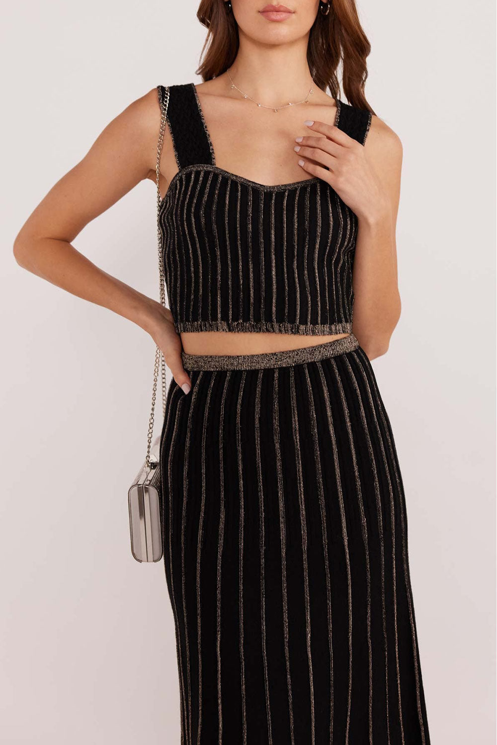 It's time to sparkle and shine in this black crop top and we celebrate the successful year coming to a close! You’ll love the sweetheart neckline, braided touch on the straps while the fitted cut hug your curves. This timeless piece is perfect for special occasions and where you want to add that touch of glamour to your ensemble. Style with the matching skirt MOZYZ, golden accessories to complete the look.