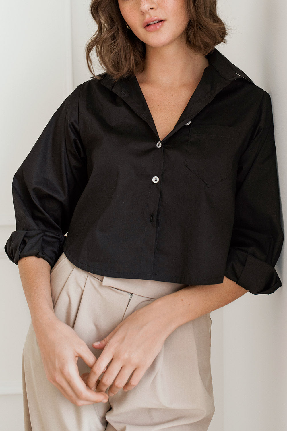 Step into the colourful leaves season in this oversized button-up black shirt, a dreamy essential crafted from cozy cotton. This versatile cropped piece effortlessly pairs with any bottoms, making it a must-have for your fall wardrobe. Embrace the spirit of renewal and lightness by adorning yourself with this enchanting top, perfect for cool, sunny days as well as bright evenings.