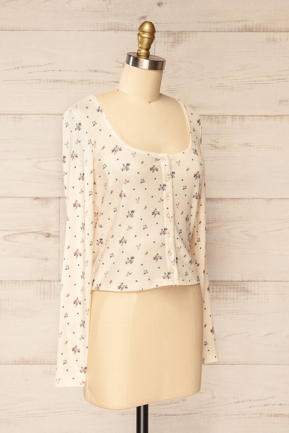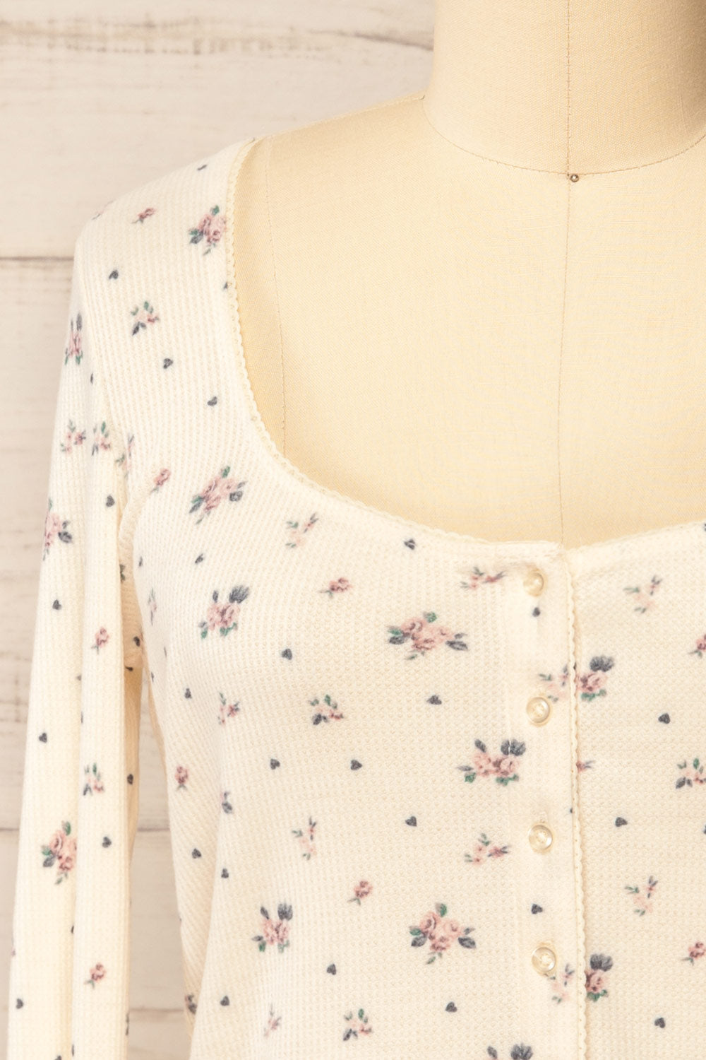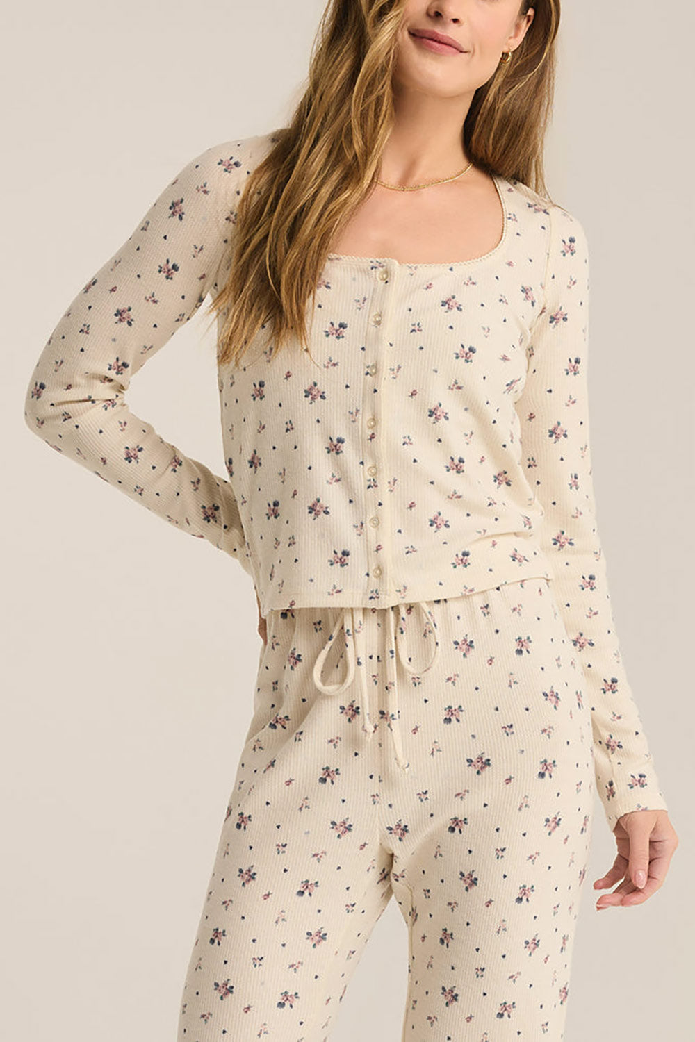 Unwind in this lounge long-sleeved top, designed with a button placket detail and a flattering scoop neck. Made from light waffled fabric with a cute ivory ditsy floral print, it provides cozy comfort all season long. To complete the set, you can wear it with the matching bottom PANTONA!