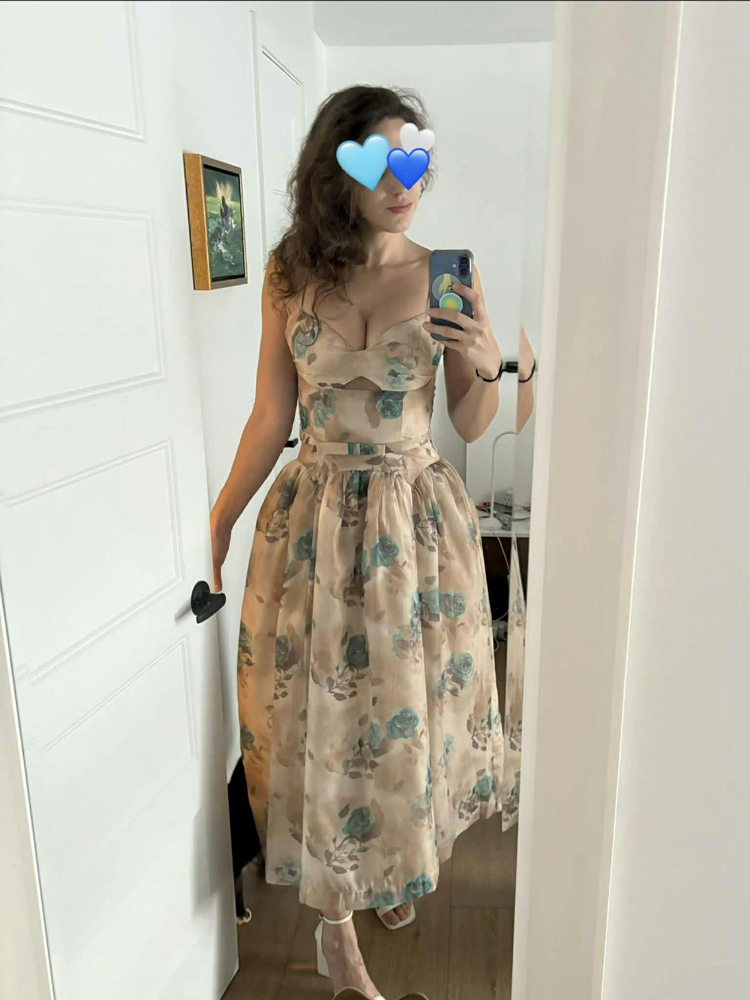 Let yourself be enchanted by the charm of this long dress adorned with softly hued blue roses. Its thin adjustable straps frame a sweetheart neckline bodice, while a lovely belt with a bow ties at the back to highlight the waist. The flowing, airy skirt sways with each step, carried by a light fabric with a romantic print. An invisible back zipper and a ruched elastic section add comfort and a perfect fit. It feels as if it came straight out of a floral dream.