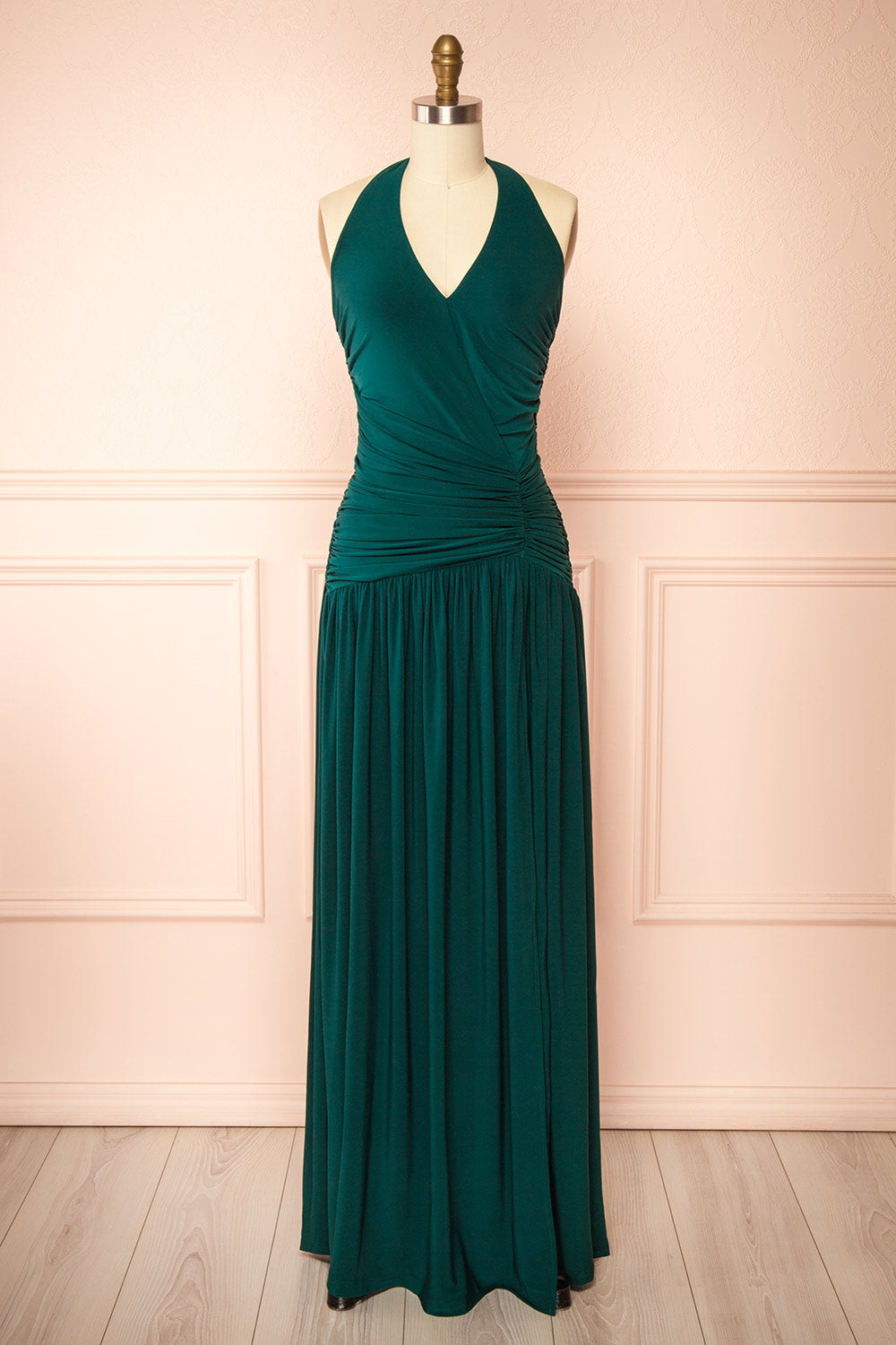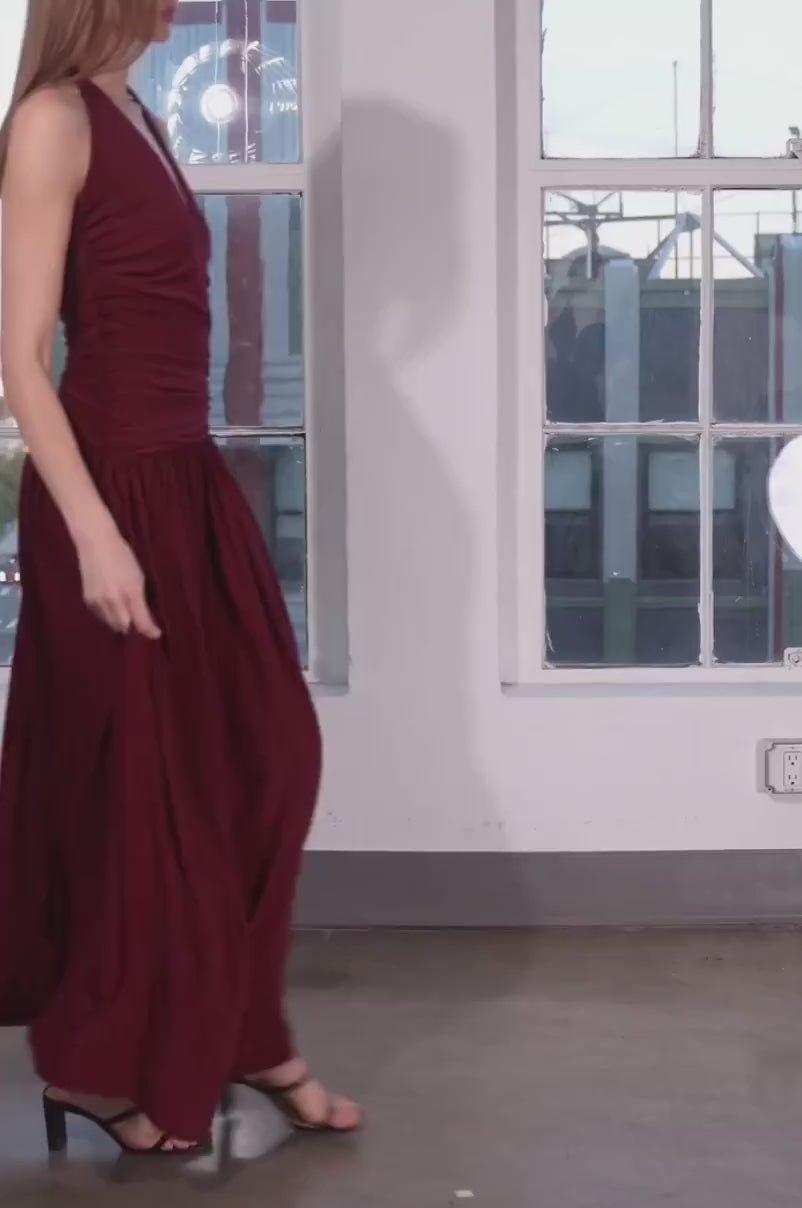 Gracefully designed, this exquisite maxi dress features a flattering drop waist accentuated by ruched fabric, beautifully highlighting the hips with a touch of sophisticated allure. The deep halter neckline elevates the elegance, while the high slit and pleated skirt ensure effortless movement and a captivating silhouette. Crafted for ease, it requires no zipper, allowing for quick and comfortable wear. Perfect for refined occasions, this dress seamlessly combines timeless charm with modern comfort.