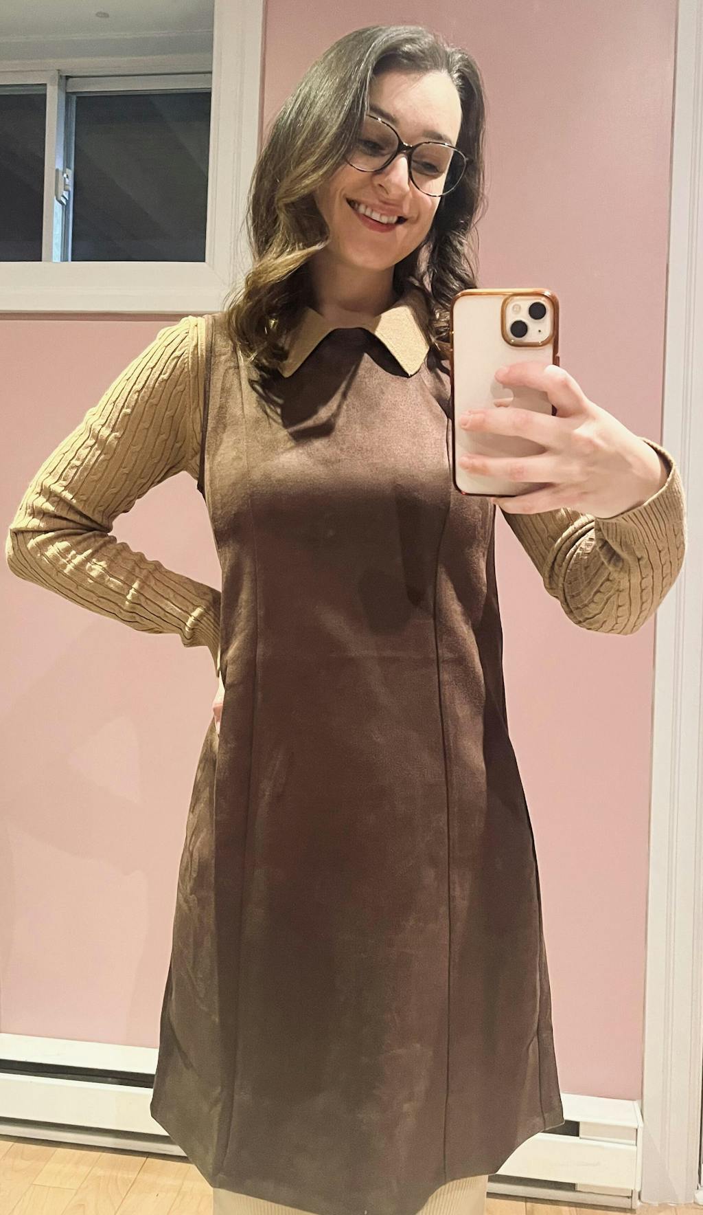 This dress is the perfect transition piece to welcome cooler seasons in style. Crafted from a brown suede-like fabric, it offers a soft texture and a rich colour, ideal for fall. Its straight, sleeveless cut makes it incredibly versatile: you can wear it on its own during mild weather, or layer it over a long-sleeved turtleneck for colder days. Pair it with boots, and it will instantly become a wardrobe staple for the season.