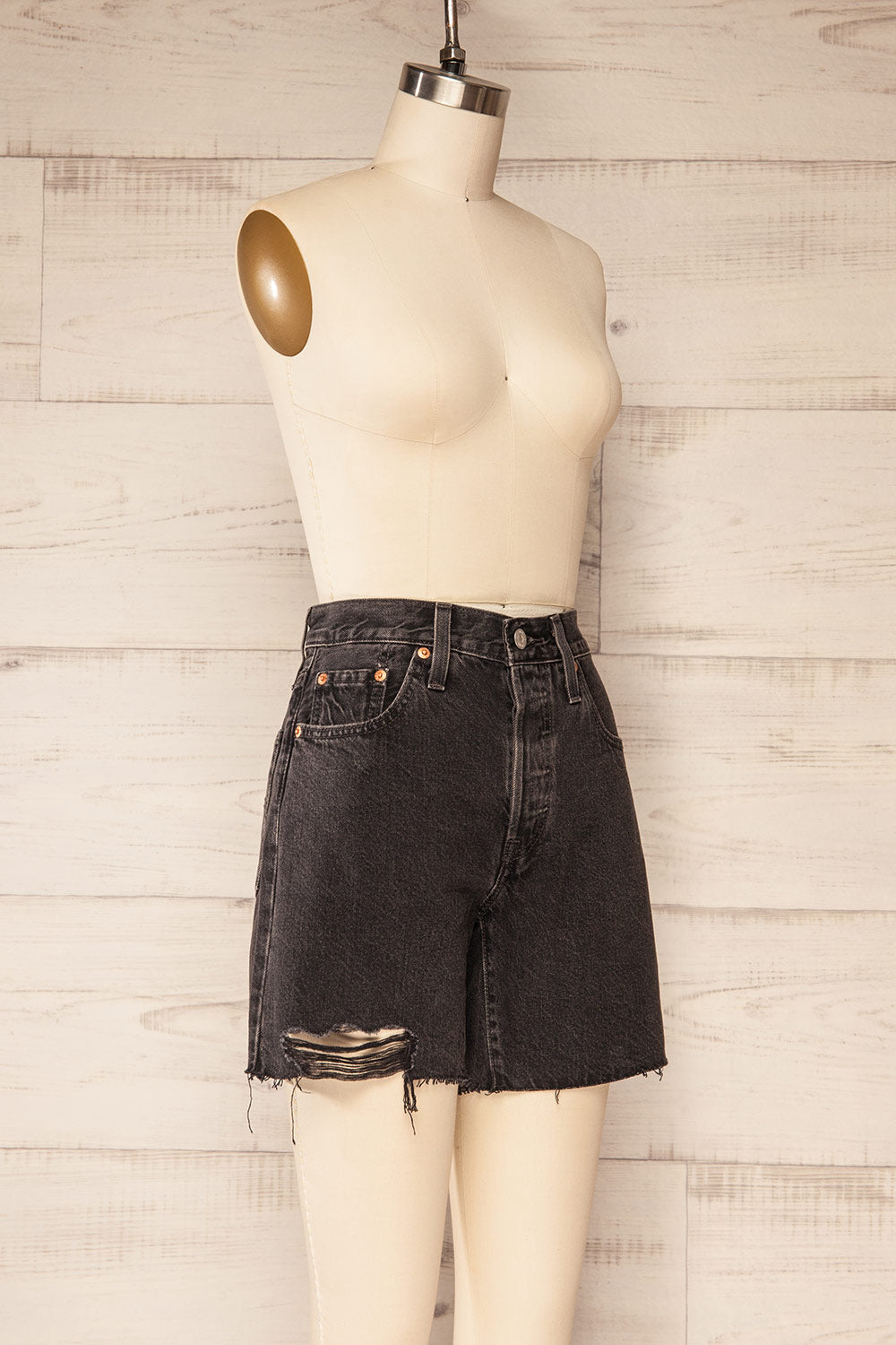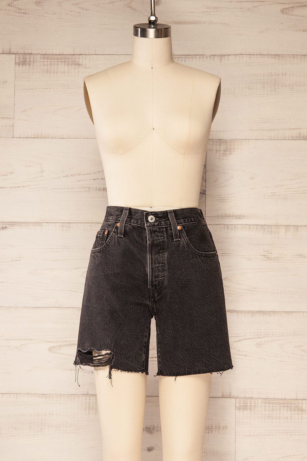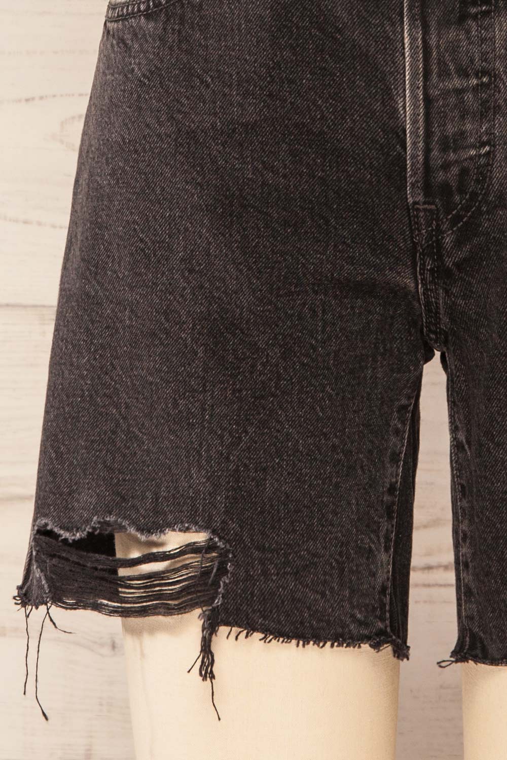 These black denim shorts were made with an iconic vintage-inspired fit, a flattering high rise, and a longer inseam, to this day they have never gone out of style and they never will. A universally flattering summer's essential that features a cut-off hem to bring more character to your style!