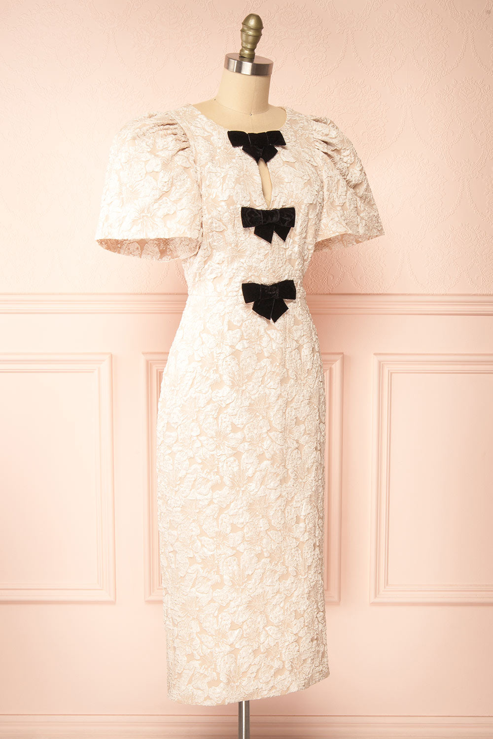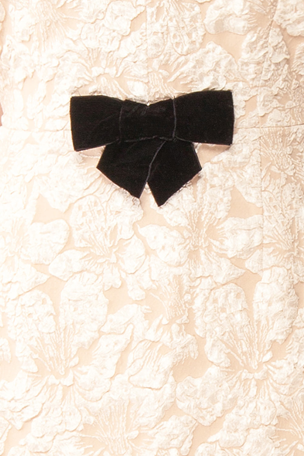 Célébrez l'amour dans un moment de conte de fées avec cette robe midi beige, un choix parfait pour les fêtes des fiançailles et les célébrations intimes. Le motif floral texturé apporte une sophistication subtile, tandis que les manches courtes bouffantes ajoutent une touche coquette à votre ensemble. Avec sa silhouette flatteuse et ses charmantes boucles noires, cette robe capture magnifiquement l'esprit romantique. Cette robe promet de rendre les souvenirs précieux encore plus enchanteurs!