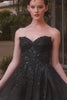 Cette robe de soirée offre une coupe ligne A ample et un bustier à l'encolure en cœur pointue. Le corsage est finement orné d'applications florales à sequins. La jupe se compose de tulle superposé qui scintille subtilement. Un bustier structuré assure un maintien parfait, complété par des bretelles transparentes amovibles.