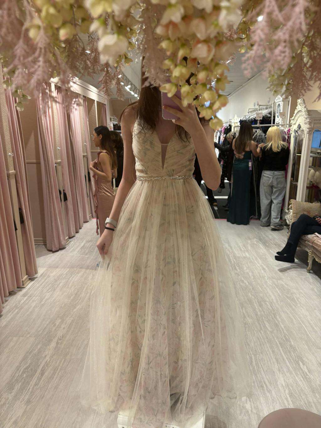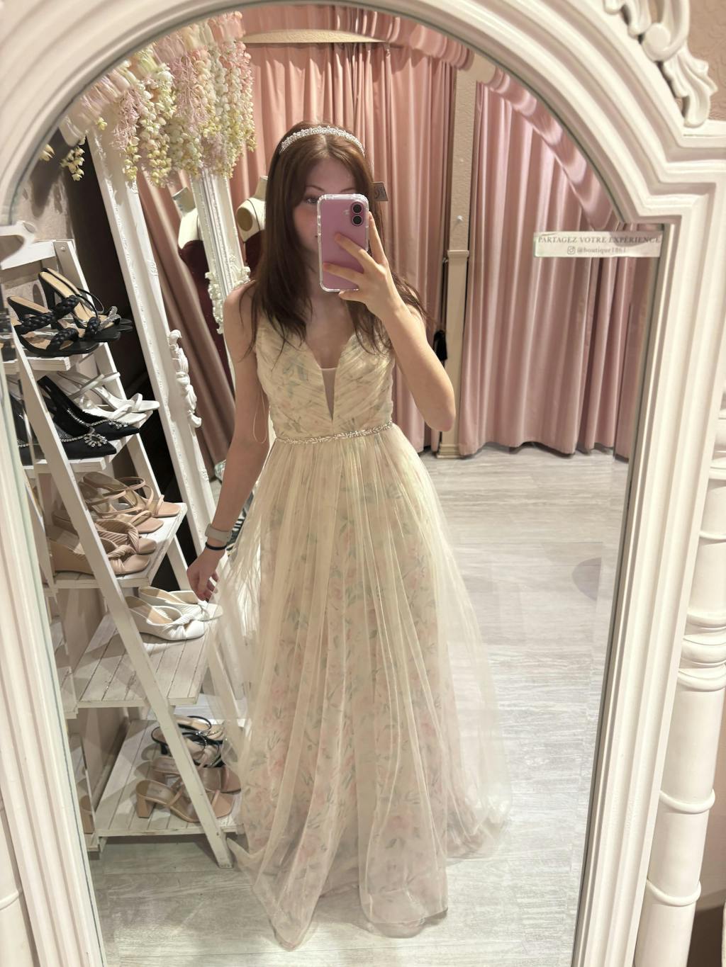 Entrez dans le royaume de l'enchantement avec cette robe longue à fleurs éthérée, où un décolleté profond et une silhouette ligne-A rencontrent la magie fantaisiste du tulle superposé. La doublure douce assure un port confortable, tandis que les fines bretelles réglables offrent un ajustement personnalisable. Pendant que vous tournez, les couches de tulle de la jupe semblent danser autour de vous, comme les murmures d'une fée au vent. Cette robe vous fera certainement sentir comme une princesse!