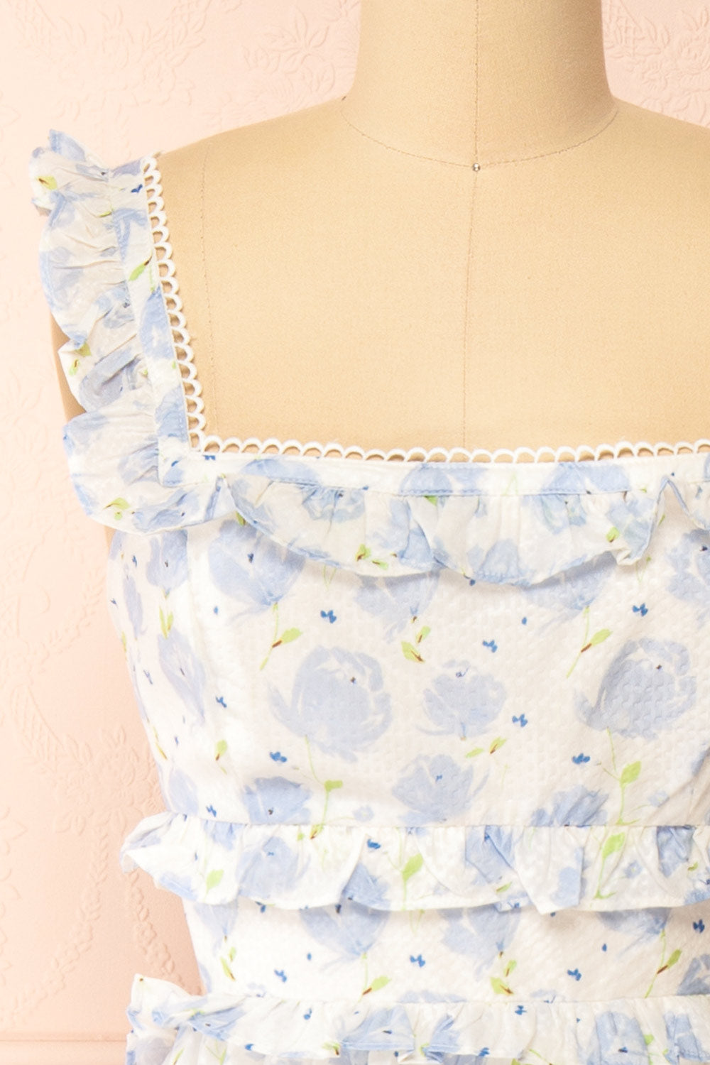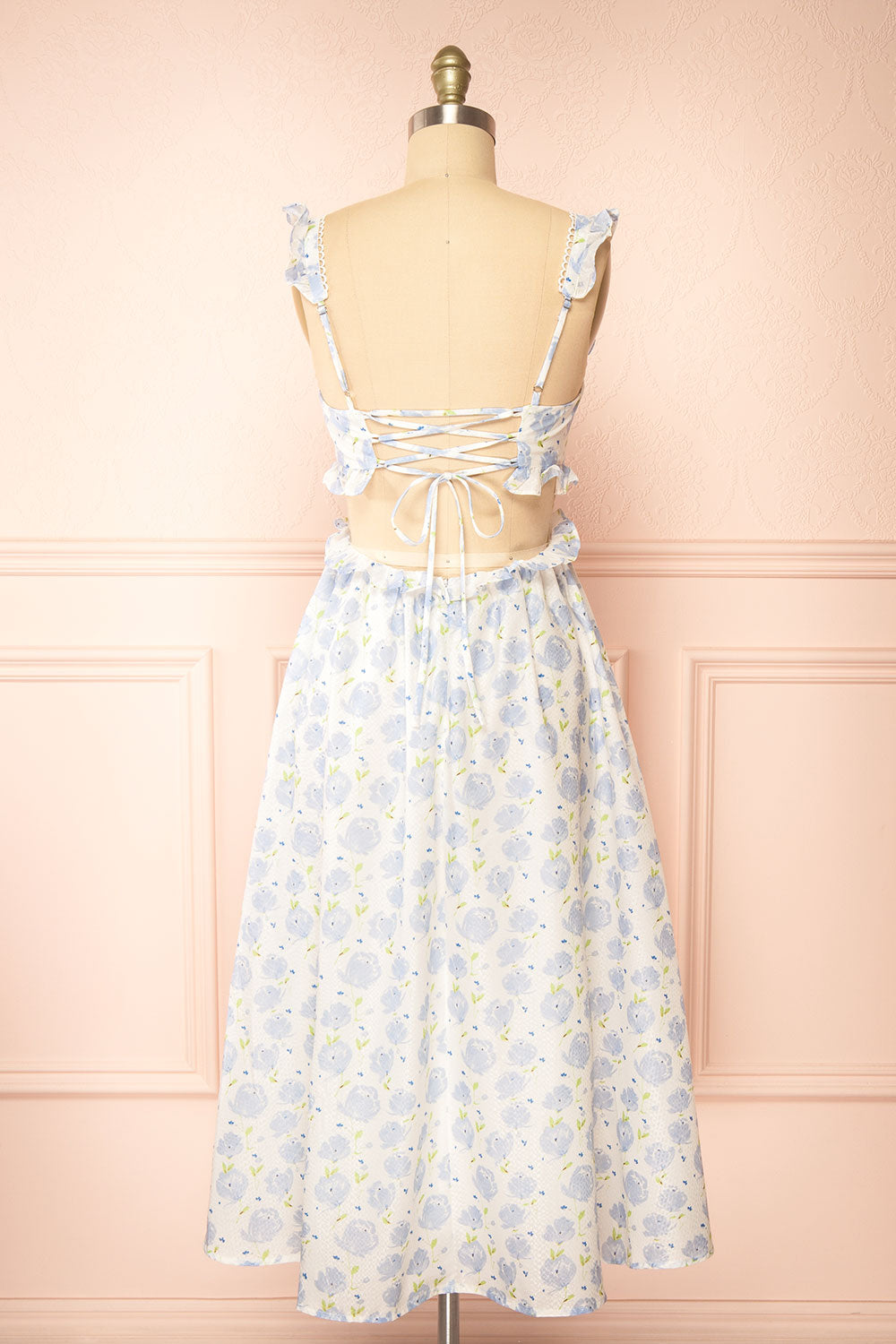 Préparez-vous à faire tourner les têtes dans cette captivante robe blanche, ornée d'un superbe motif floral bleu. L'encolure carrée est joliment encadrée de volants, ajoutant une touche féminine à ce joli design. Avec son dos ouvert à lacets et ses bretelles ajustables, vous vous sentirez comme une princesse lorsque vous vous promènerez durant les chaudes journées d'été. La fermeture à glissière invisible au dos assure une finition en toute simplicité.