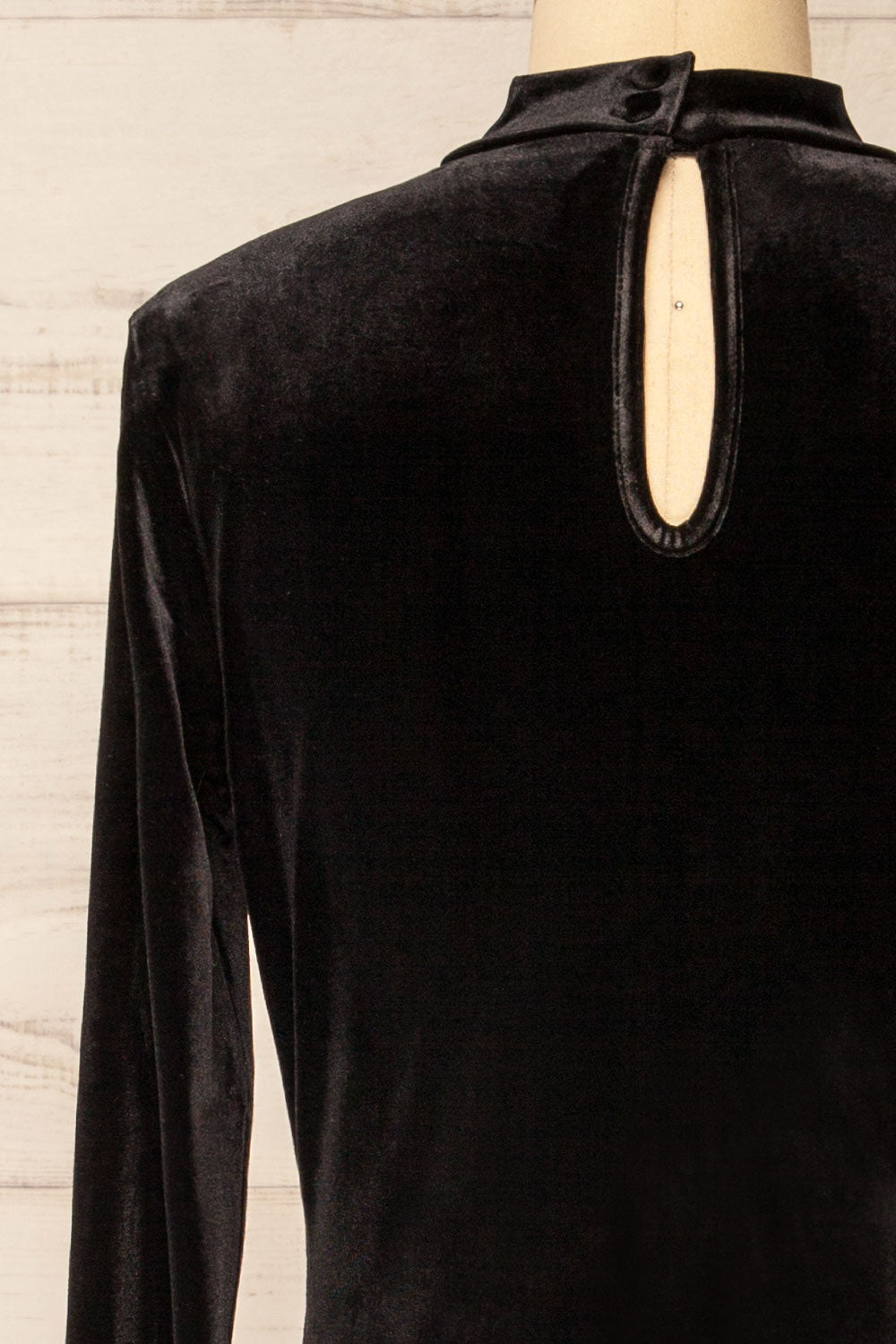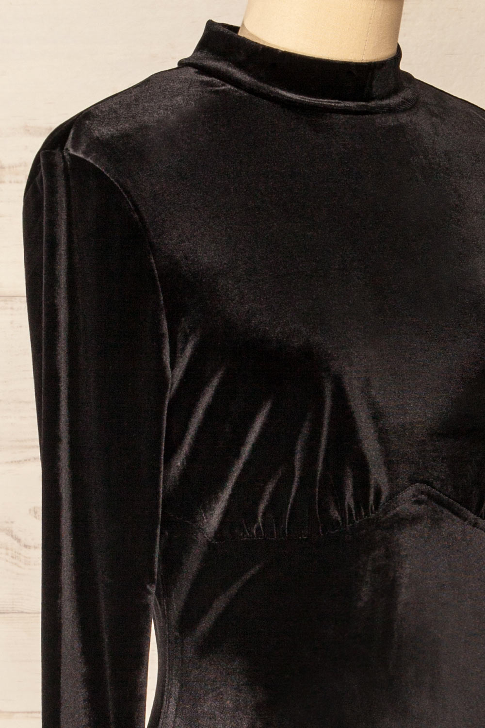 Cette jolie robe en velours noir vous ira comme un gant! Son tissu extensible complimentera à merveille vos courbes tandis que ses manches longues et son col montant seront de bons atouts par temps plus frais. Agencez la à un long manteau et vos bottes longues favorites pour la parfaite tenue de sortie!