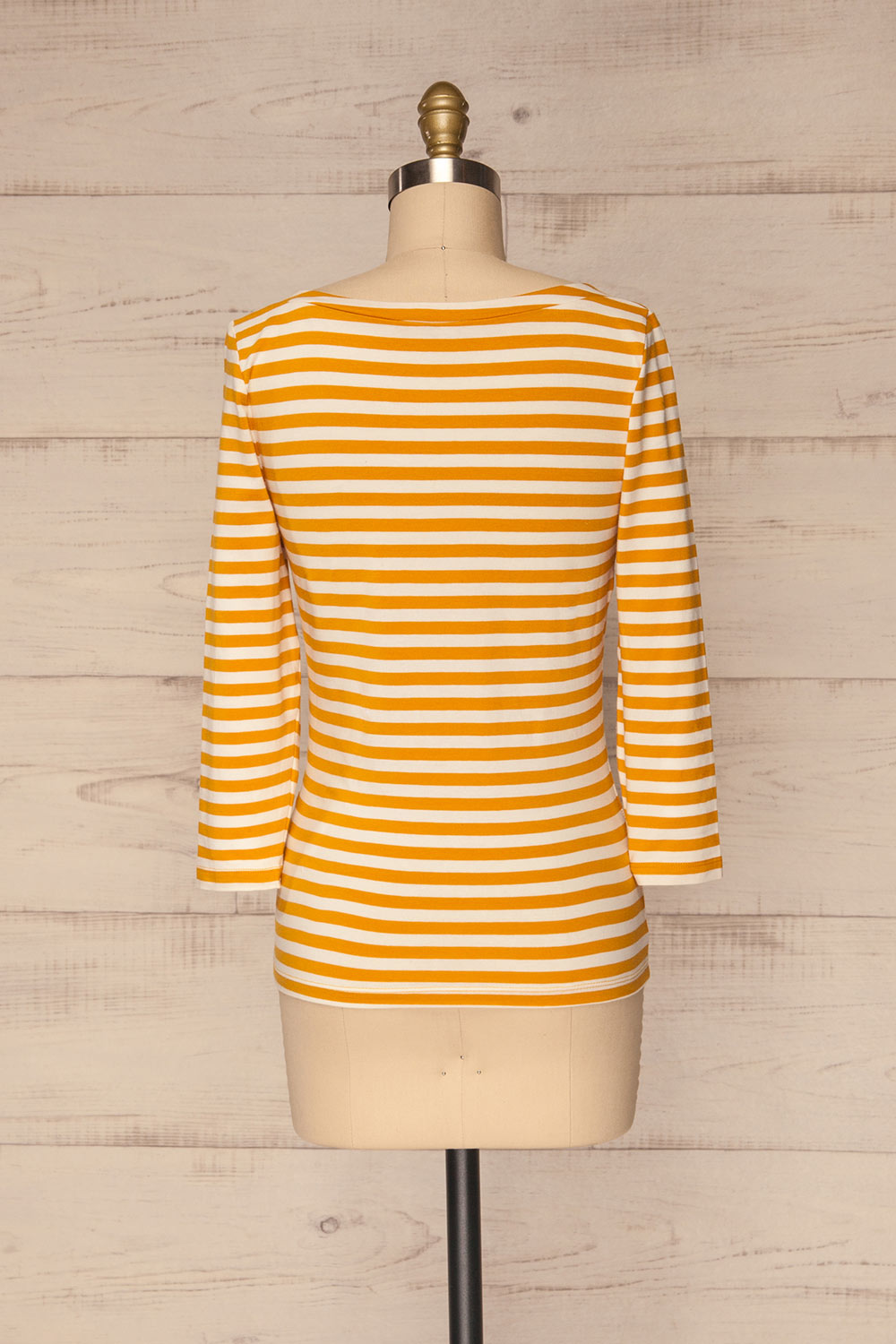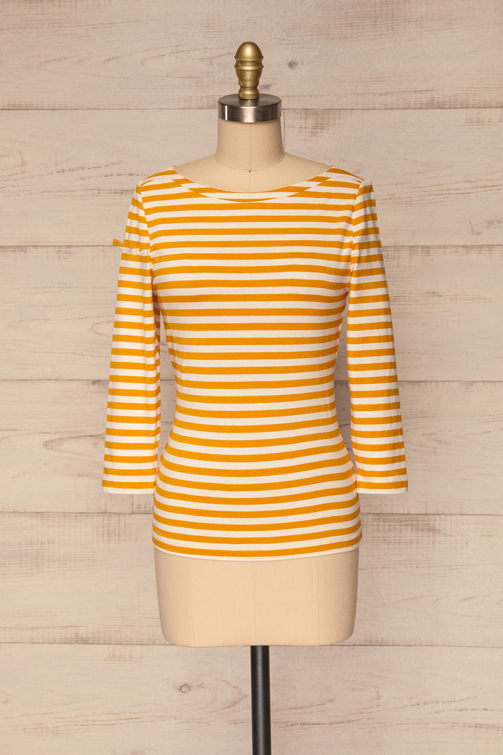 You'll get the best of both worlds with this stylish and comfortable top! Its stretch fabric will hug your figure, while its boat collar and 3/4 sleeves make it original. Pair it with a skirt and booties for an adorable casual outfit!
