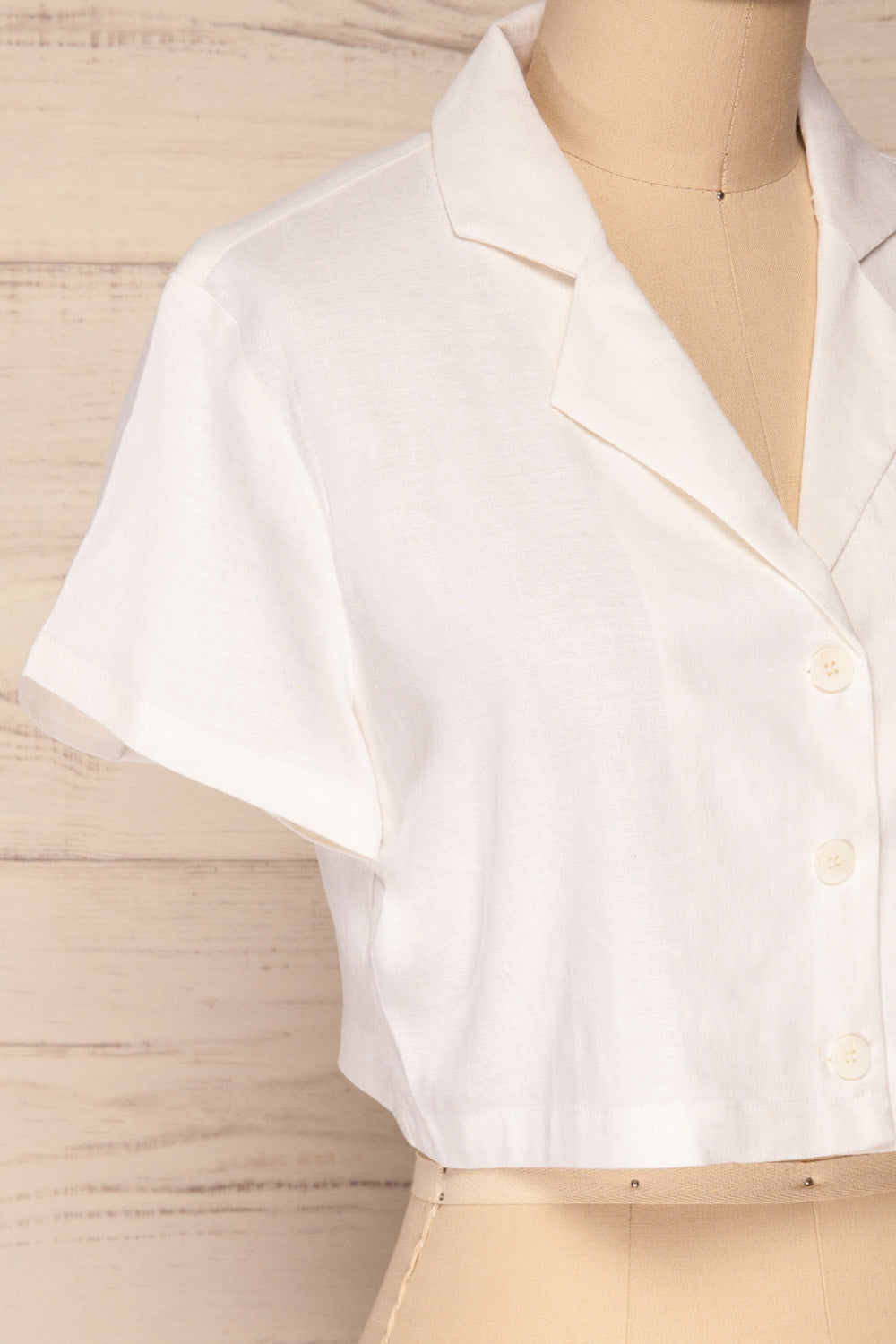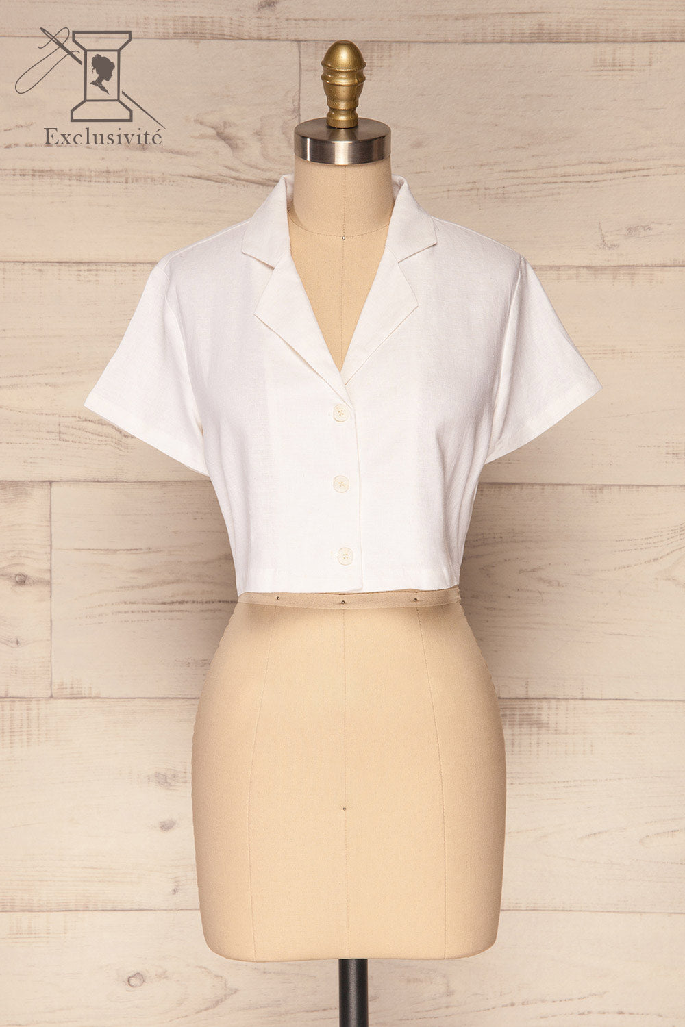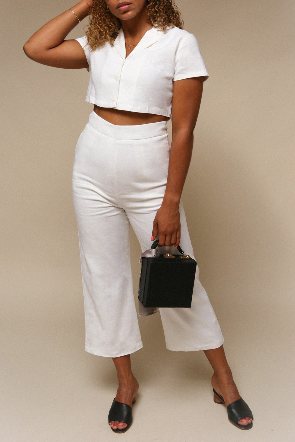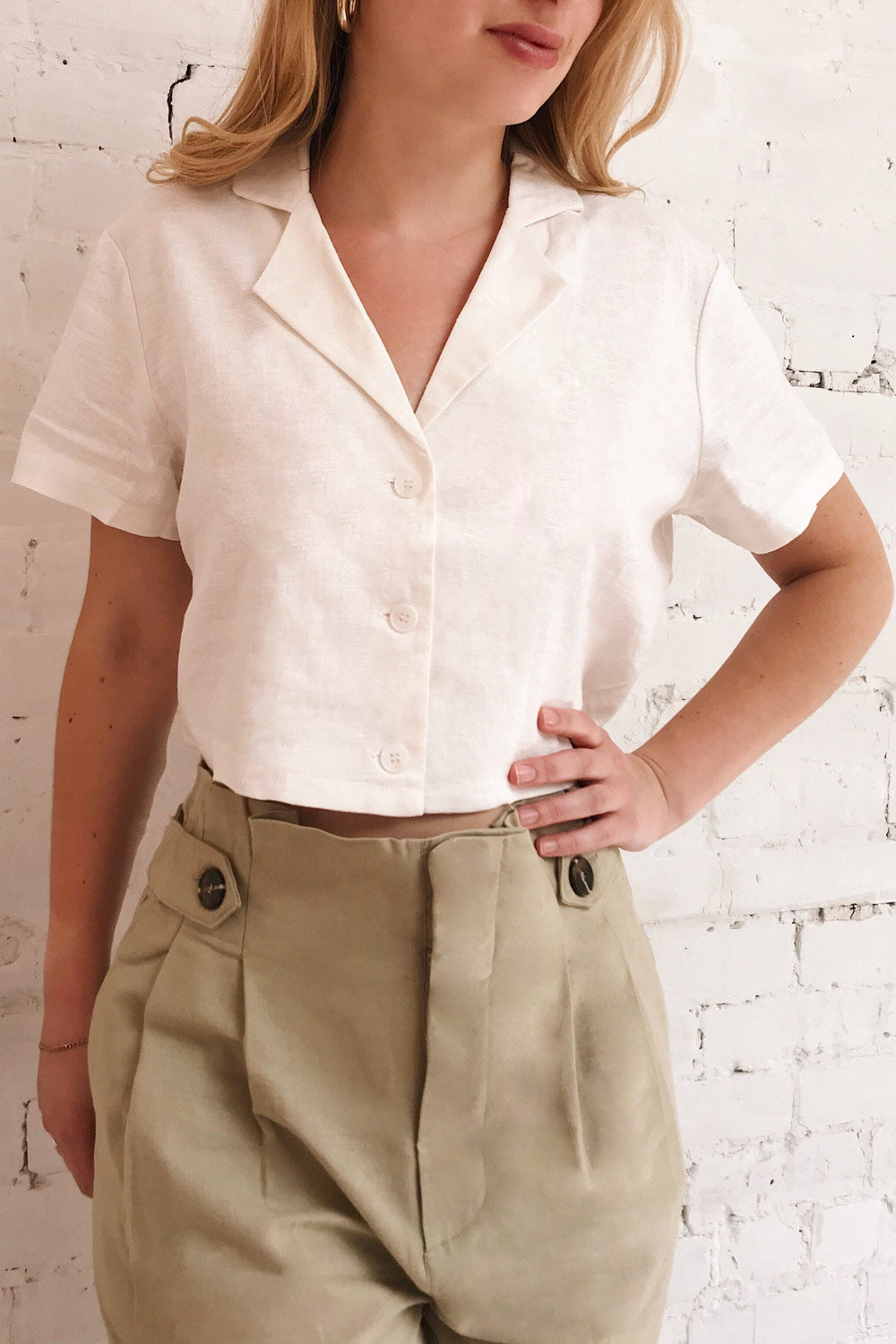 Ce haut écourté exclusif à La Petite Garçonne deviendra votre morceau de prédilection pour la saison à venir! Une version moderne d'un classique; il vous habillera avec classe. Le mélange de lin est léger et confortable, alors que les boutons et les manches courtes sont pratiques. Pour une superbe tenue soignée, agencez-le du pantalon AGOYAN, de souliers plateformes et de grosses boucles d'oreilles!