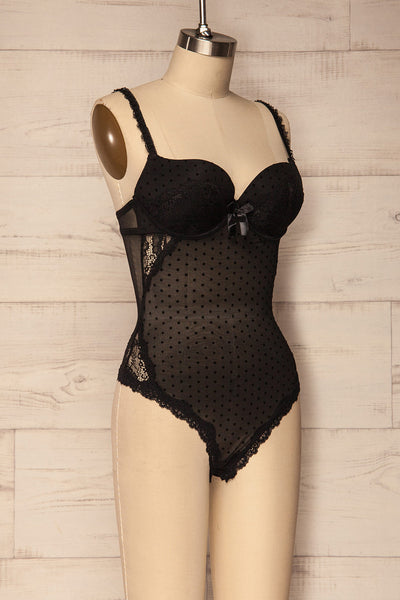 Ce magnifique justaucorps sublimera votre charme naturel. Son soutien-gorge pigeonnant intégré, ses bretelles ajustables et son joli dos ouvert se feront les complices de votre coquetterie! Les agrafes du soutien-gorge comprennent trois ajustements, tandis que la fourche est retenue par deux rangées de trois boutons pressions à l'entre-jambe. La coupe échancrée et le motif à pois vous plairont!