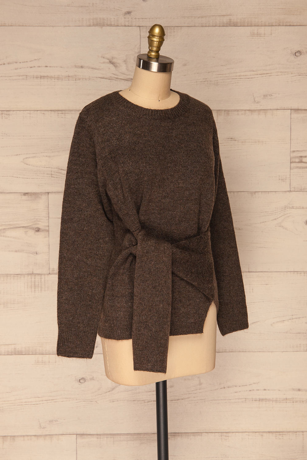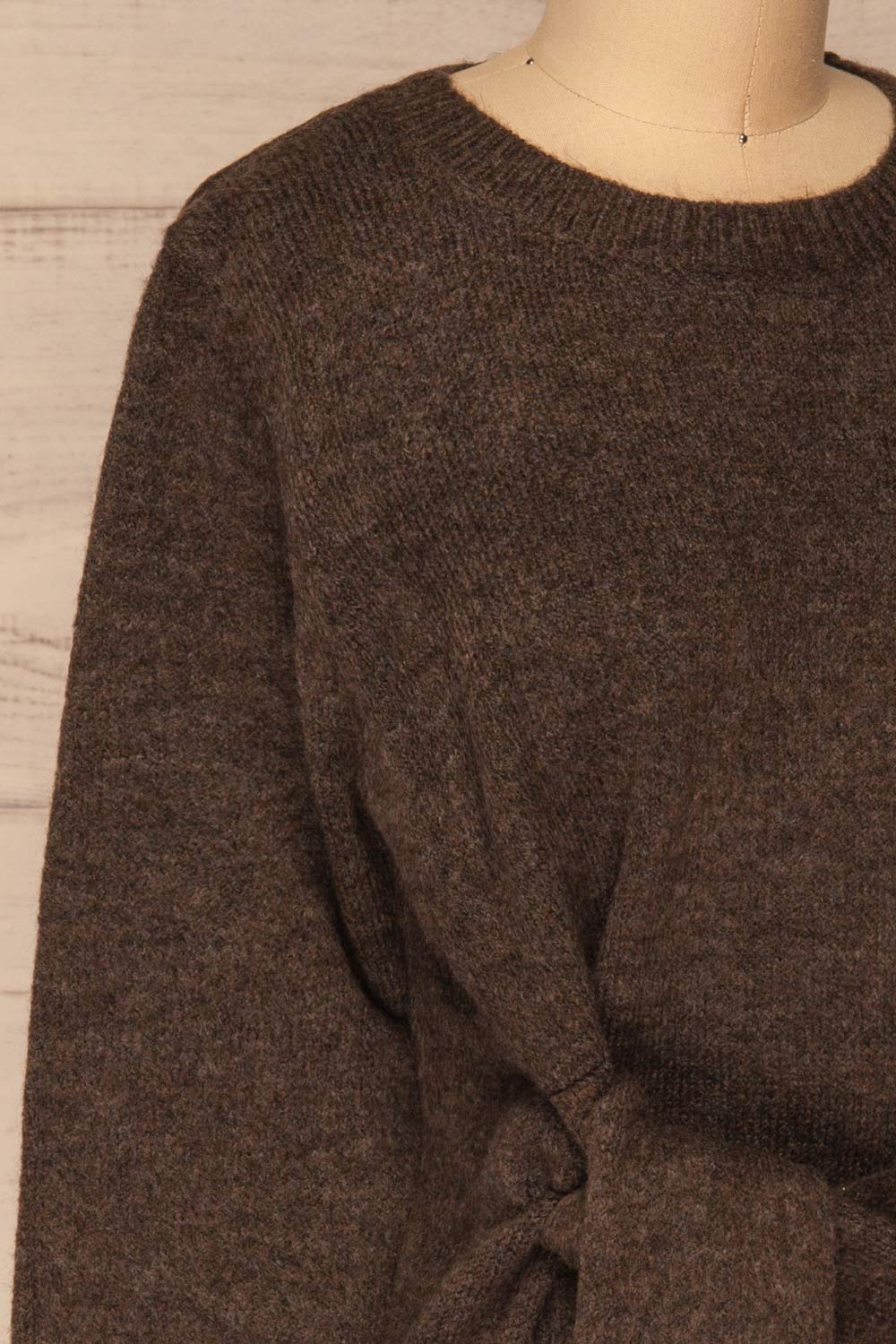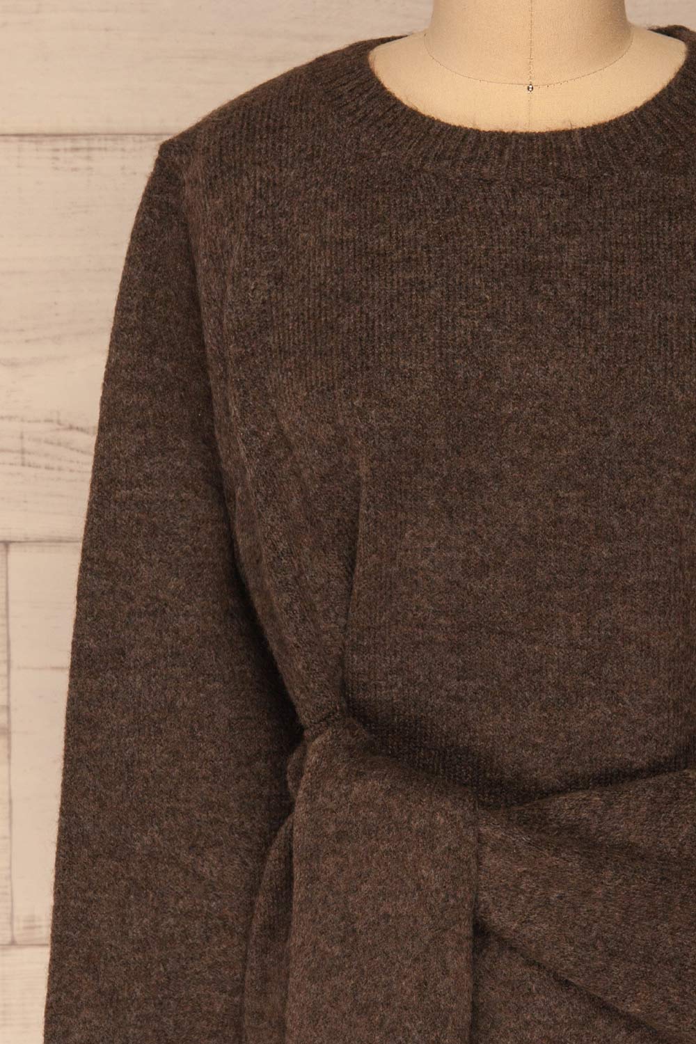 Ce chandail des plus douillets vous fera aimer les journées froides d'automne! Son tissu en tricot vous offrira un confort de qualité alors que sa coupe ample vous permettra de bouger en toute liberté. Vous adorerez la bande à nouer placée à la taille qui cintrera la pièce à votre goût.