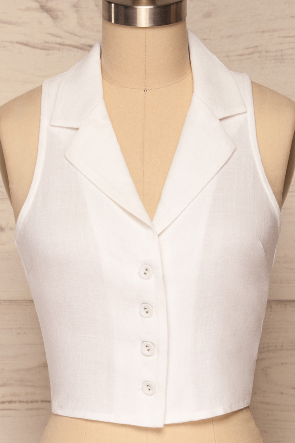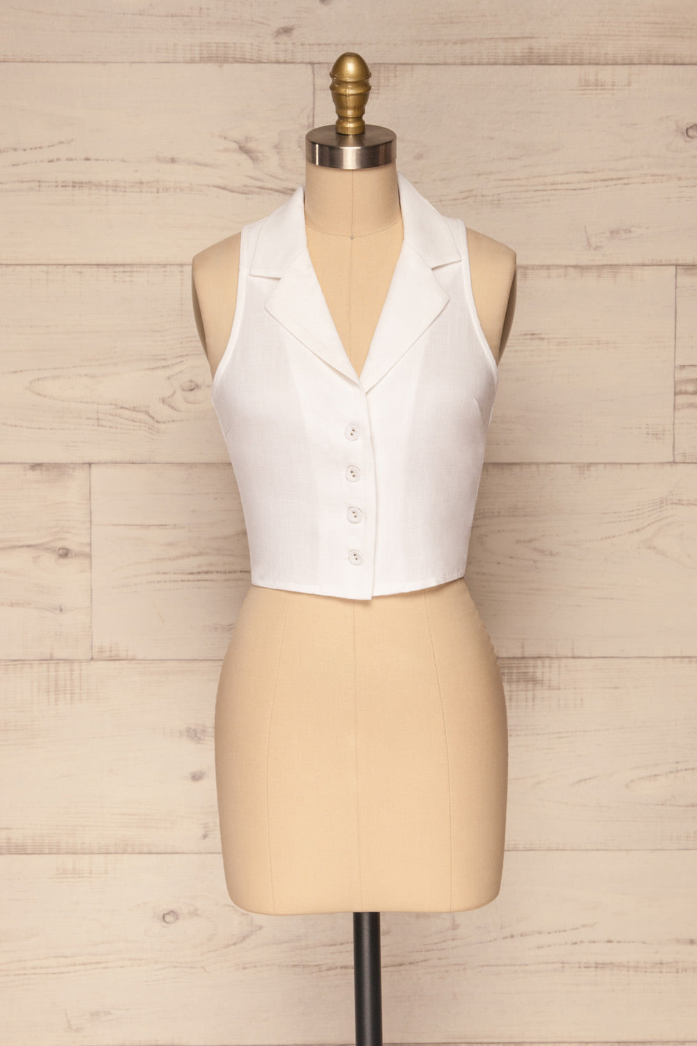 Cette blouse boutonnée vous charmera par sa simplicité et sa versatilité! Elle soulignera votre silhouette à merveille grâce à son col chemise ouvert. Sans manches, vous ne ressentirez aucune restriction dans vos mouvements. Sa coupe écourtée vous permettra de l'agencer avec tous vos bas à taille haute préférés.