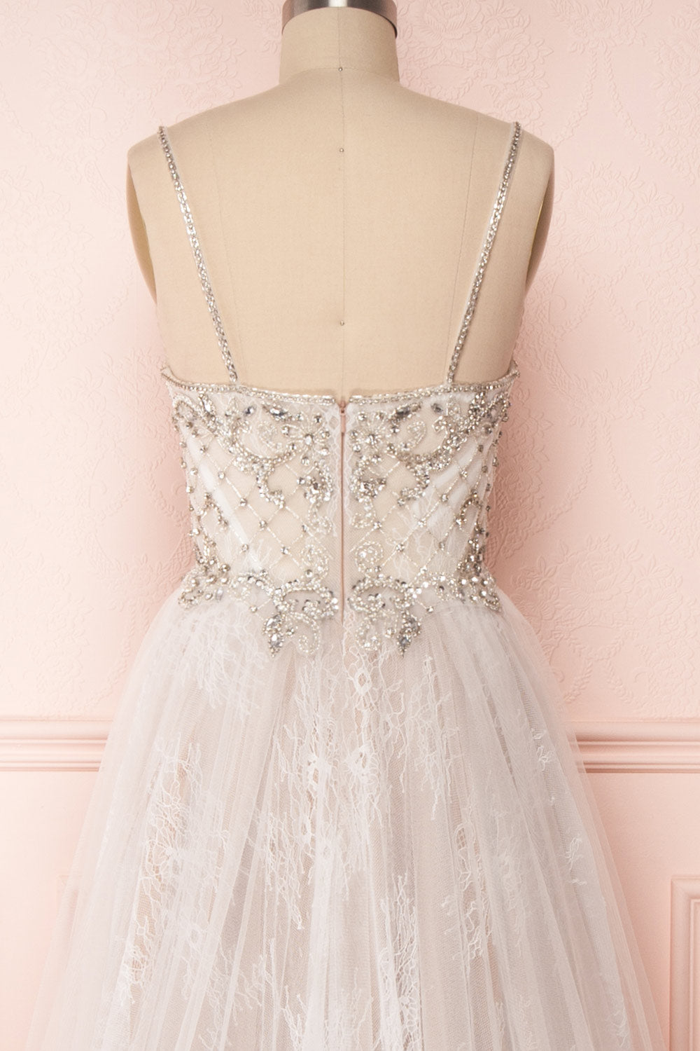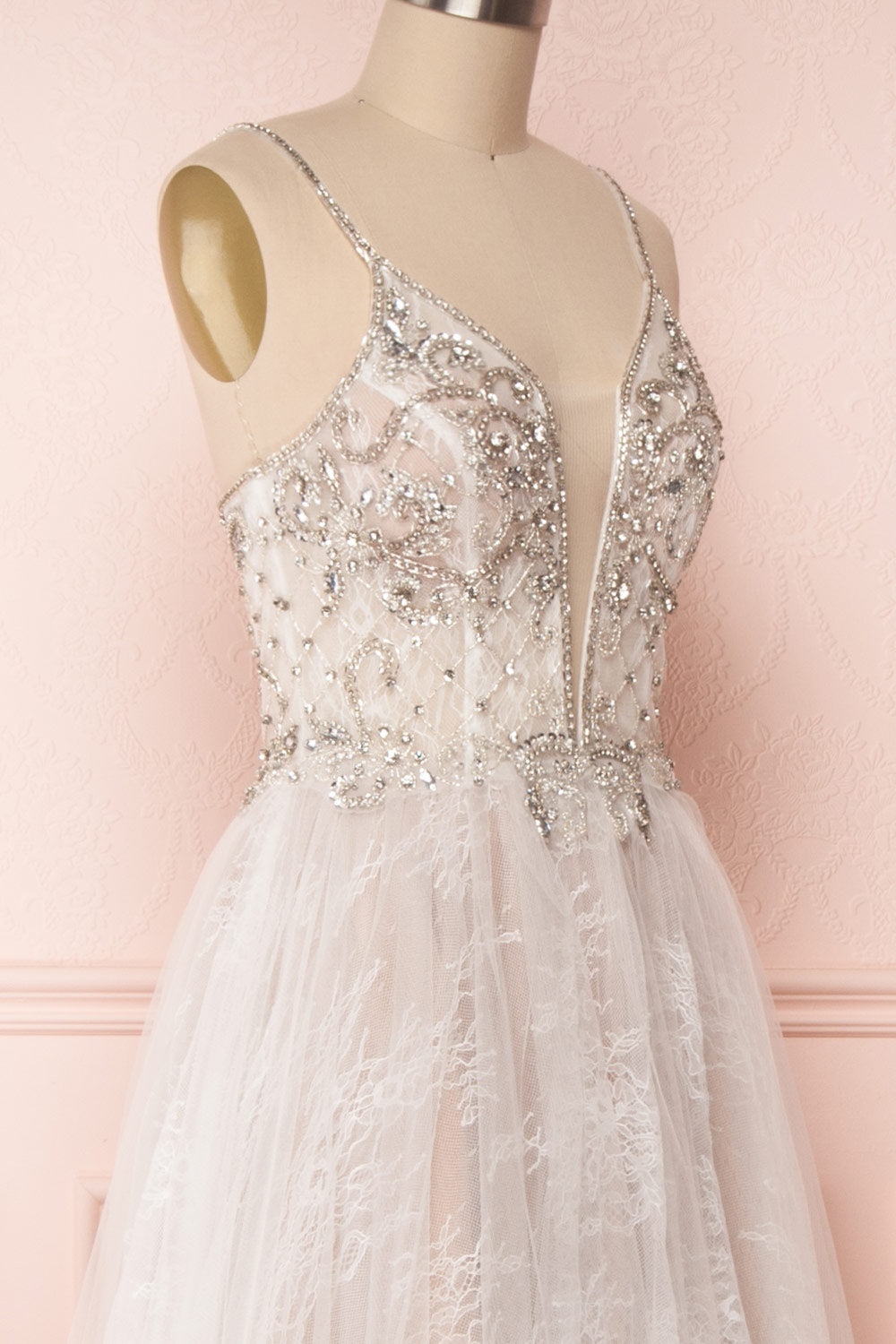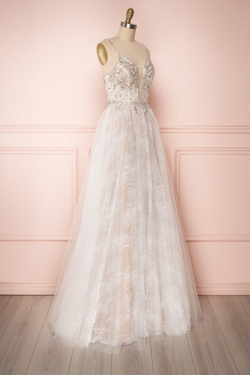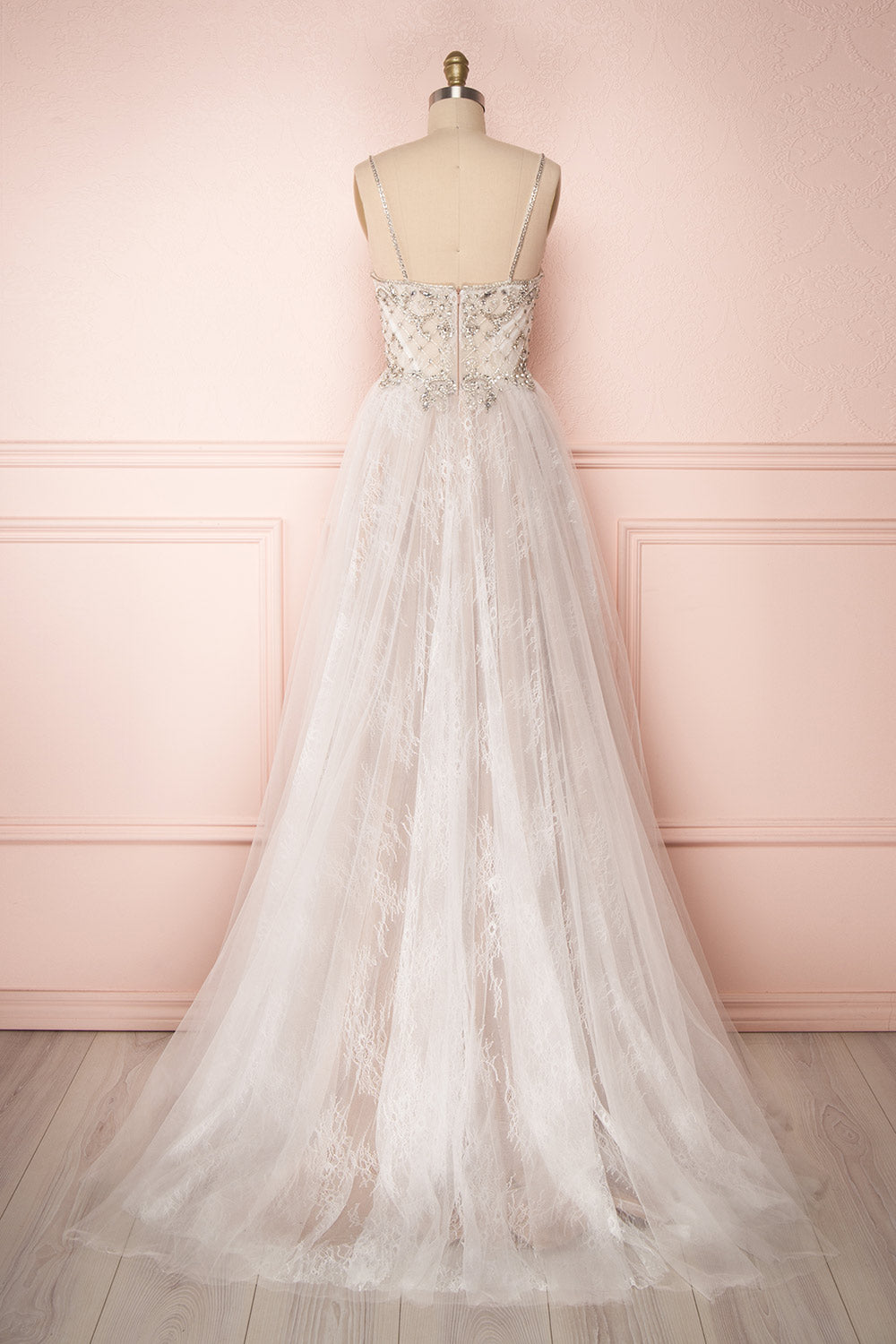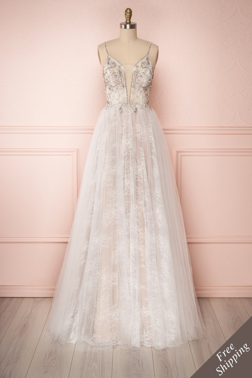 This sumptuous dress will make your admirers breathless! The A-line cut and the fitted bodice will enhance your figure. The skirt reveals layers of lace and tulle that will create a voluminous effect and facilitate your movements. The plunging neckline and lace bust decorated with sparkling crystals will reveal your skin, while the cups will offer you the necessary support and coverage. The back zipper and hooks will hold everything in place. A satin lining will keep you comfortable.