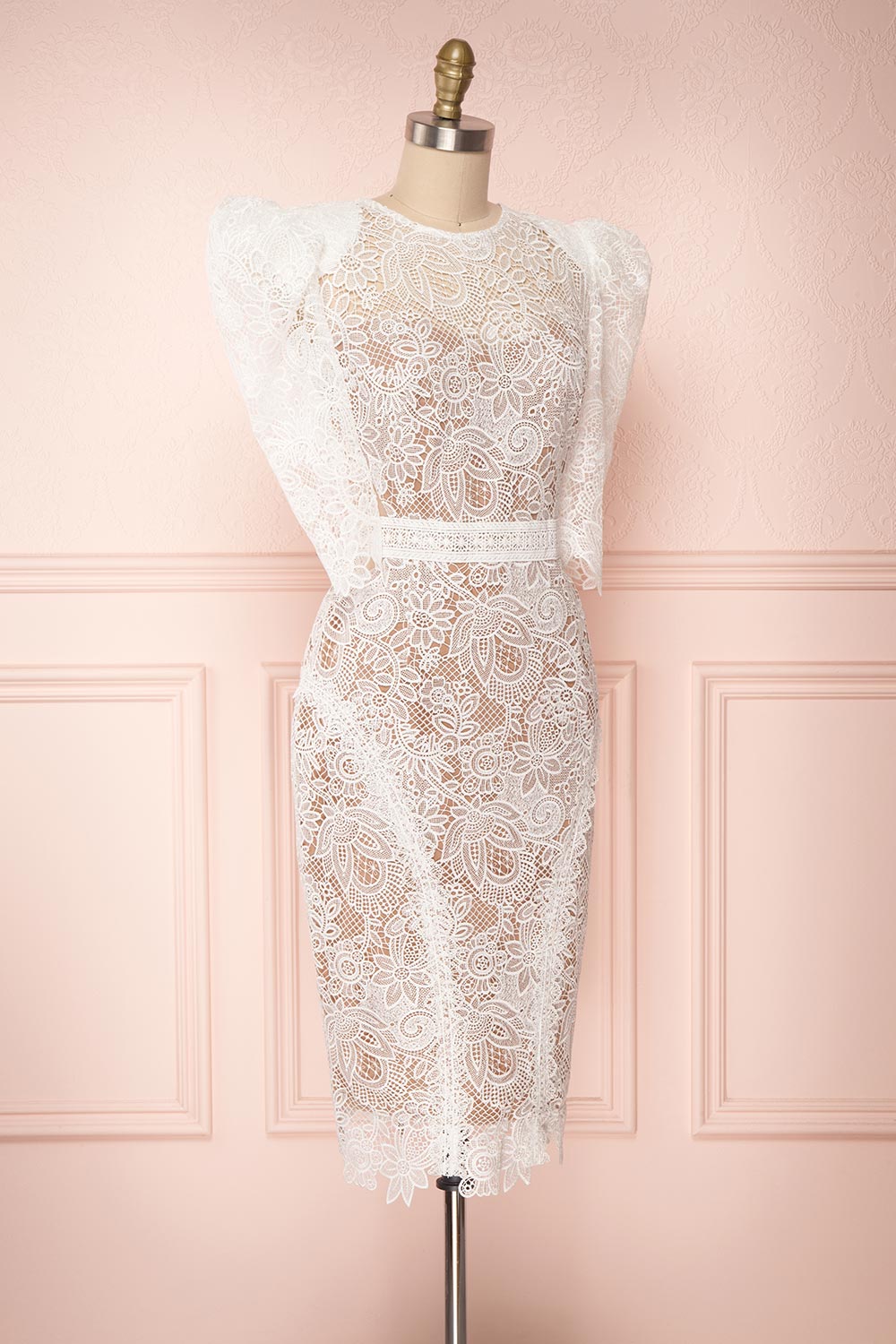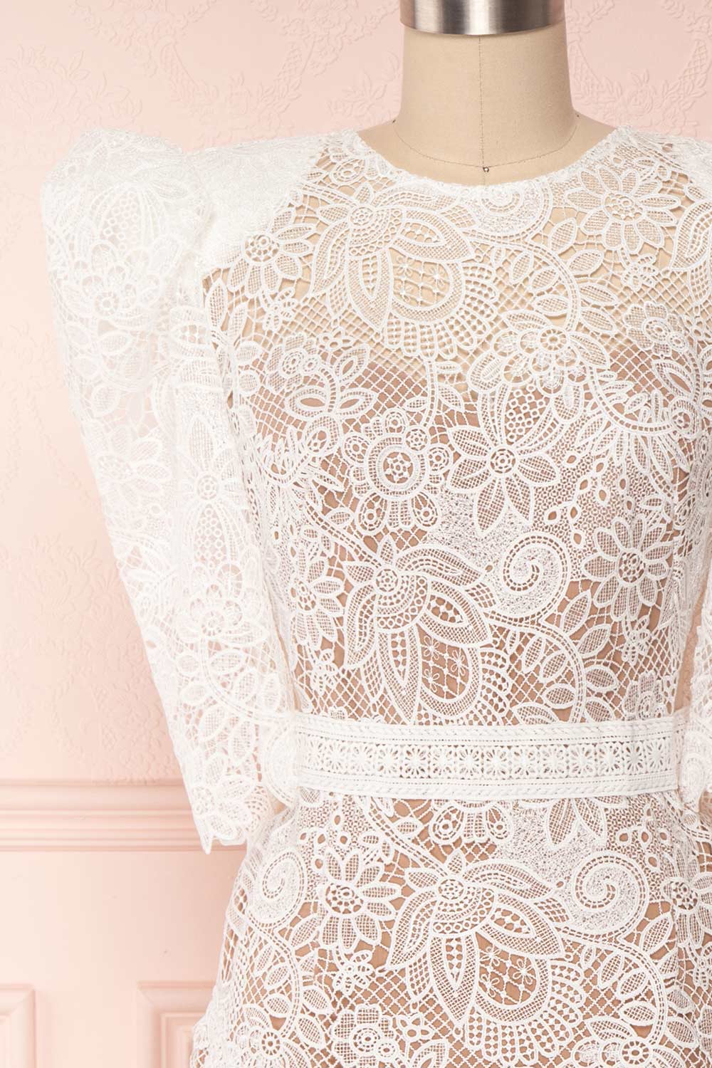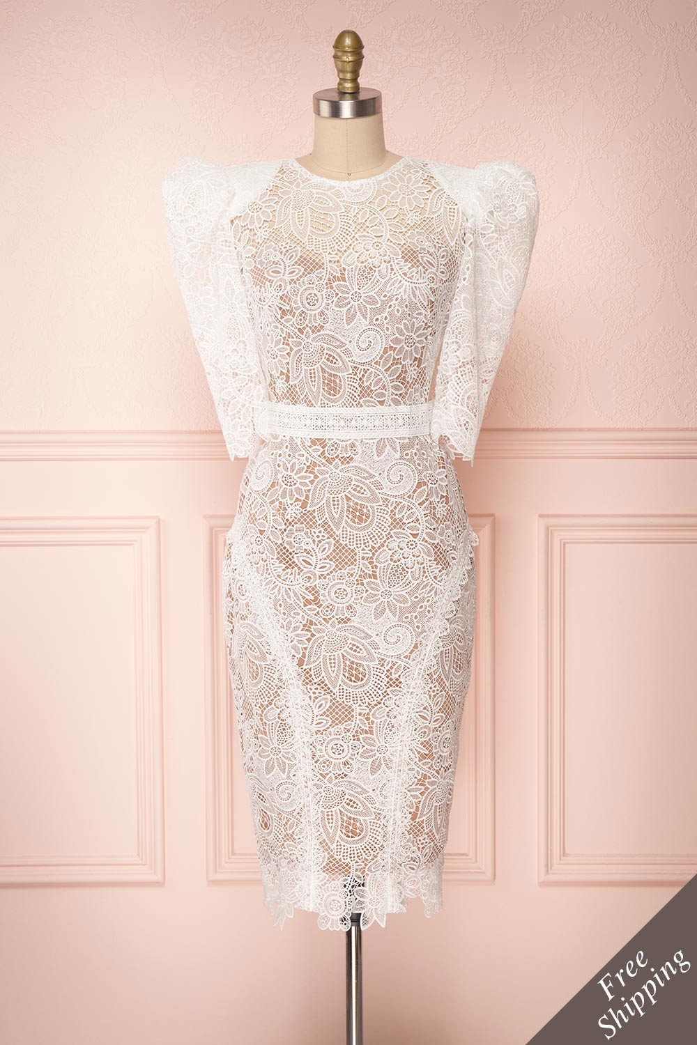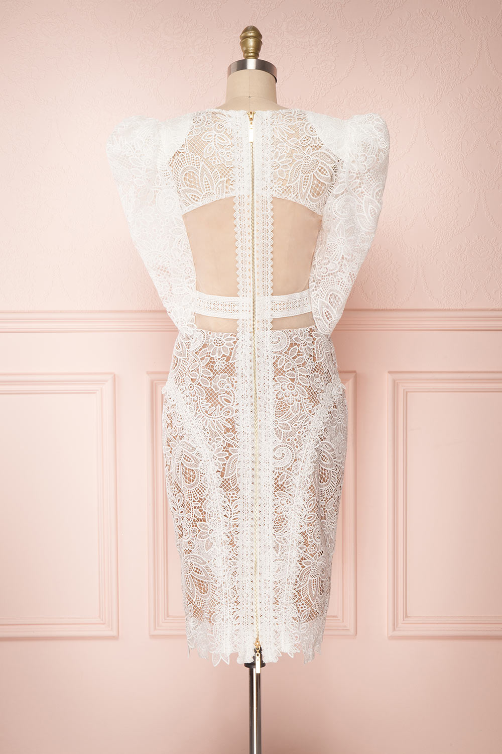 Vous serez certaine de faire une impression mémorable lors de votre grand jour grâce à cette unique robe! Vous adorerez ses détails audacieux tels que les manches bouffantes munies d'épaulettes, les découpes à la taille et le dos de filet transparent. La coupe ajustée recouvre une doublure lisse confortable, tandis que l'encolure de filet révèle un décolleté en coeur qui dévoilera votre peau. La fermeture éclair pratique au dos ajoute aussi une touche glamour grâce à son fini doré.