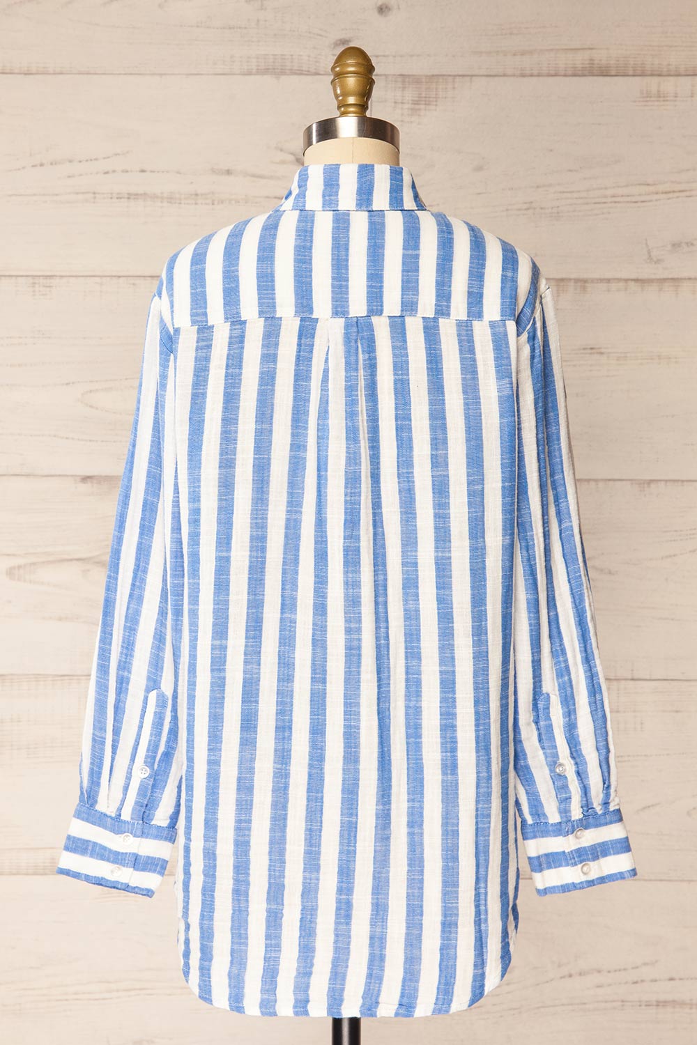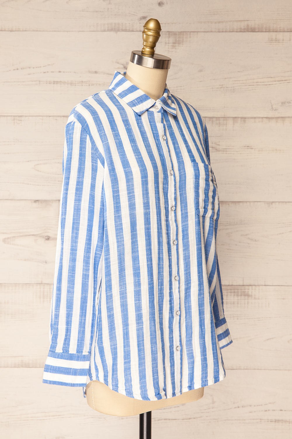 Accueillez le printemps avec cette chemise légère en coton à rayures bleues! Son tissu léger et translucide et sa poche avant sont parfaits pour les journées ensoleillées et les superpositions légères.