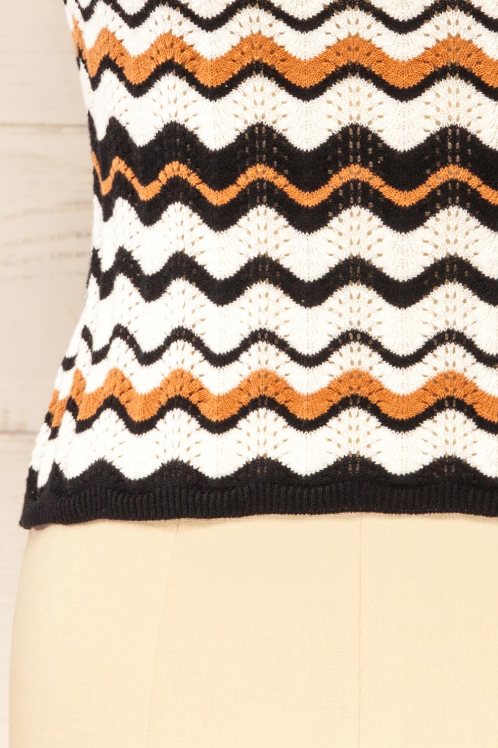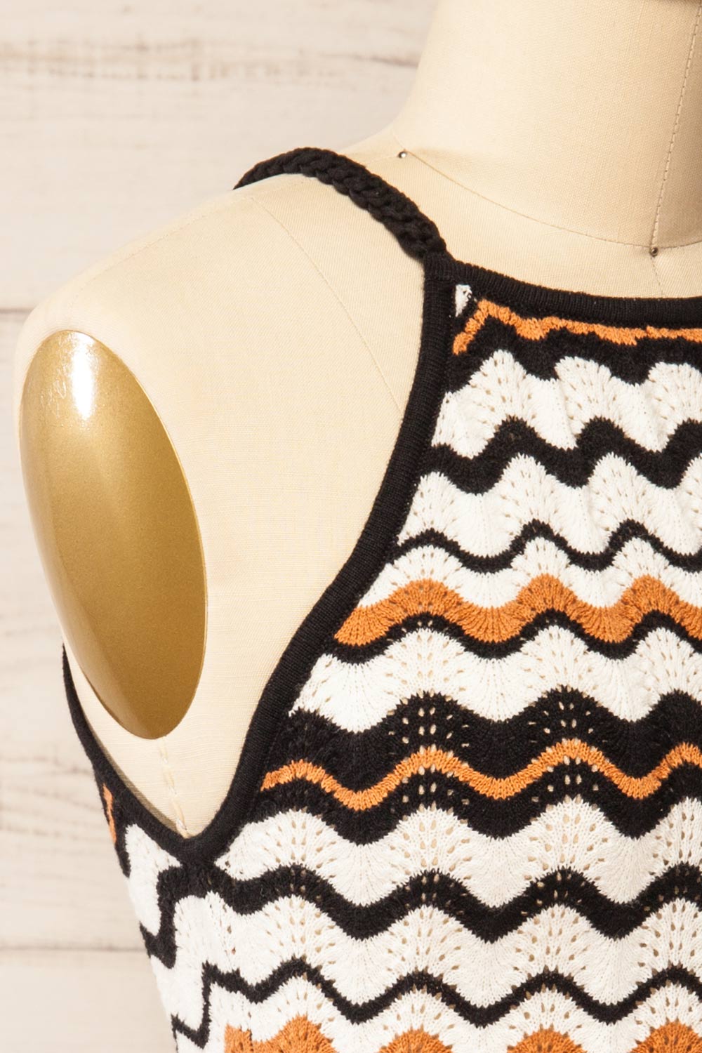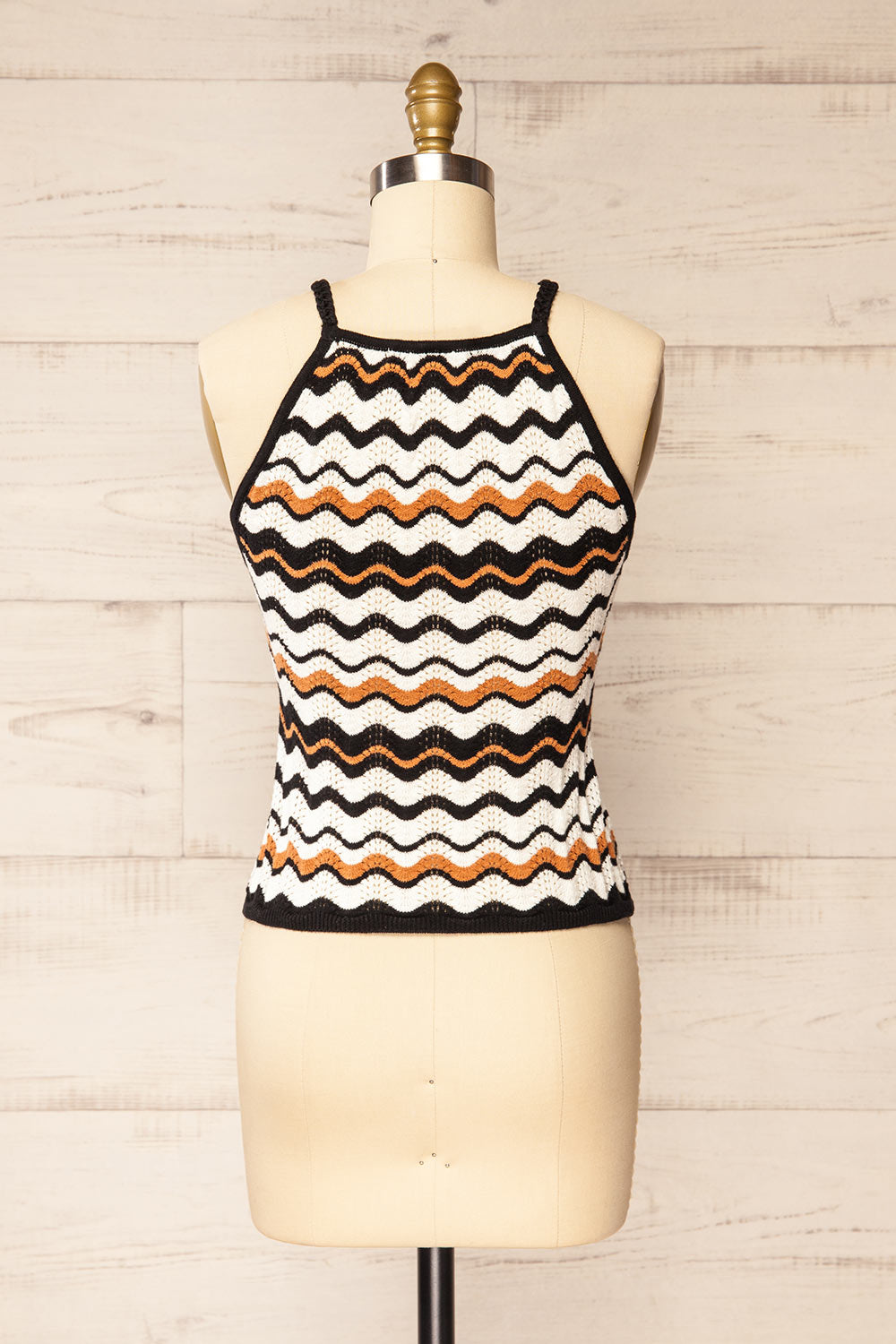 Préparez-vous à adopter le style estival avec cette camisole! Elle est faite de crochet avec des rayures ondulées de couleur neutre et des bretelles noires tressées qui ajoutent une touche de style bohème chic. L'encolure licou dégage une ambiance de vacances, ce qui en fait la pièce parfaite pour les journées à la plage et les aventures en plein air. Canalisez votre esprit libre intérieur avec ce superbe haut qui fera tourner les têtes tout au long de la saison.