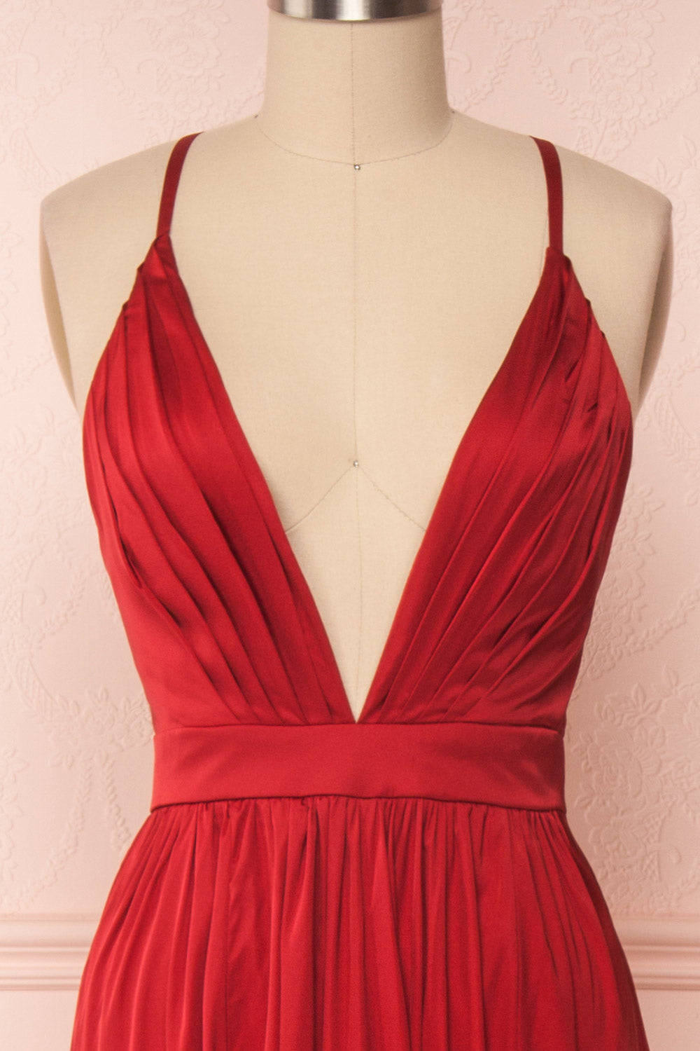 You'll make a memorable impression in this beautifully refined dress! The long ethereal silky skirt will gently rock with each step you take, while the plunging neckline and the open back are sure to turn heads. Features an invisible zipper and adjustable straps.