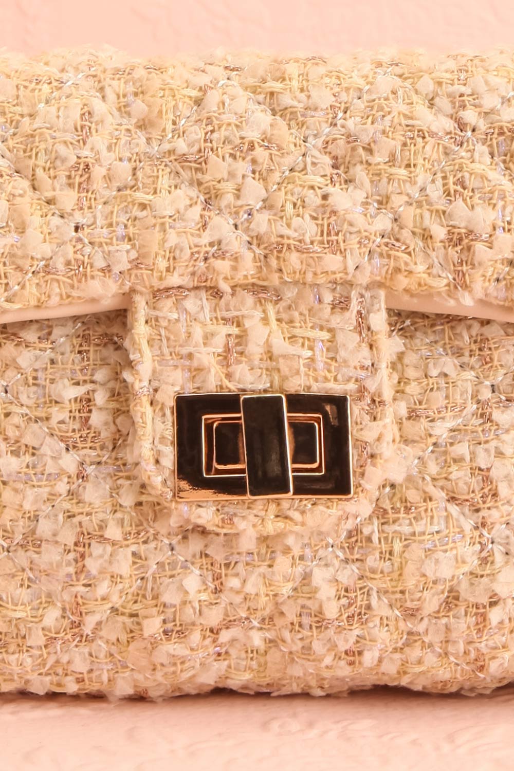 Vous tomberez en amour avec ce charmant sac à main! Petit et utile, vous pourrez y ranger vos essentiels dans son compartiment principal. Alors que sa bandoulière en chaîne amovible s'avèrera particulièrement pratique, vous serez charmée par ses accents dorés tels que son fermoir à boucle. Son tissu scintillant de style tweed le rend un accessoire classique intemporel et complètement unique!