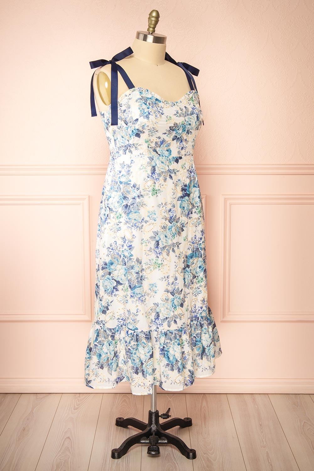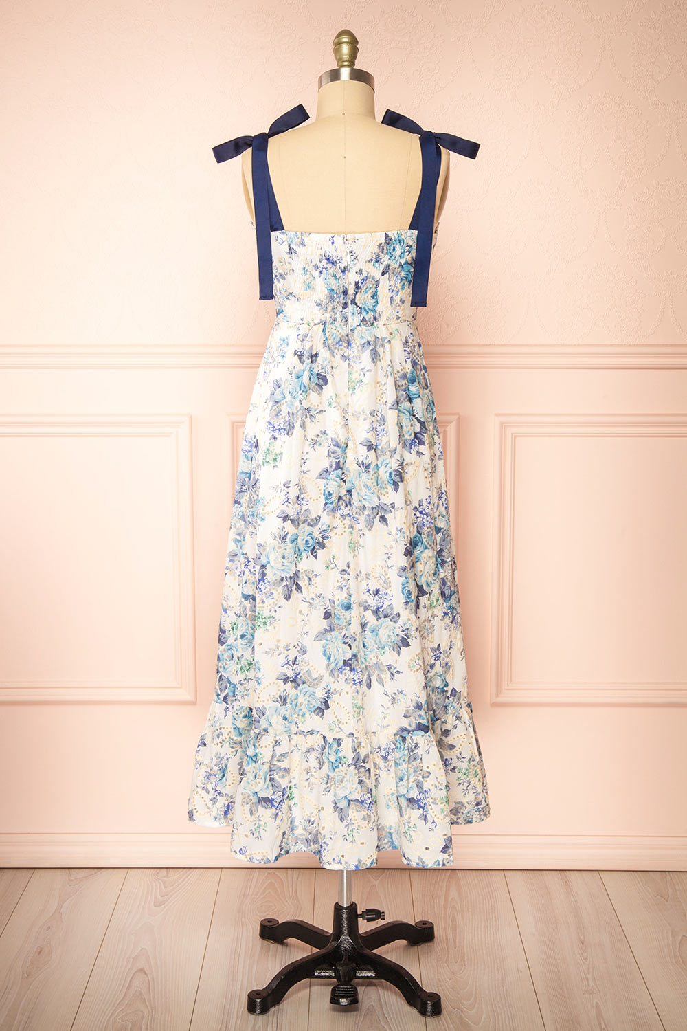 Craquez pour cette magnifique robe midi fleurie bleue et blanche! Son bustier dévoilera également votre peau tandis que la bande froncée élastique au dos la rendra confortablement à porter. Sa jupe à coupe ligne a définira légèrement votre belle silhouette, tandis que son ourlet à volants suivra gracieusement vos mouvements, donnant à la pièce corps et charme. Grâce à sa discrète fermeture à glissière dans le dos, elle s'enfilera facilement! Nouez les bretelles en une boucle délicate pour donner la touche finale à votre tenue.