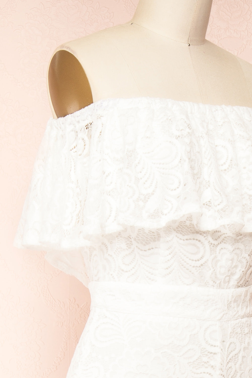 Cette combinaison unique est la quintessence du style et du glamour! Dotée d'une dentelle florale simple et de jolies jambes larges, sa simplicité vous charmera. Une bande à la taille et un corsage ajusté mettent en valeur votre silhouette. Vous allez adorer la façon dont l'encolure à épaules dénudées révélera délicatement votre peau tandis que le volant en dentelle ajoute une qualité délicate. La doublure douce et la fermeture éclair invisible au dos sont des détails que vous apprécierez!