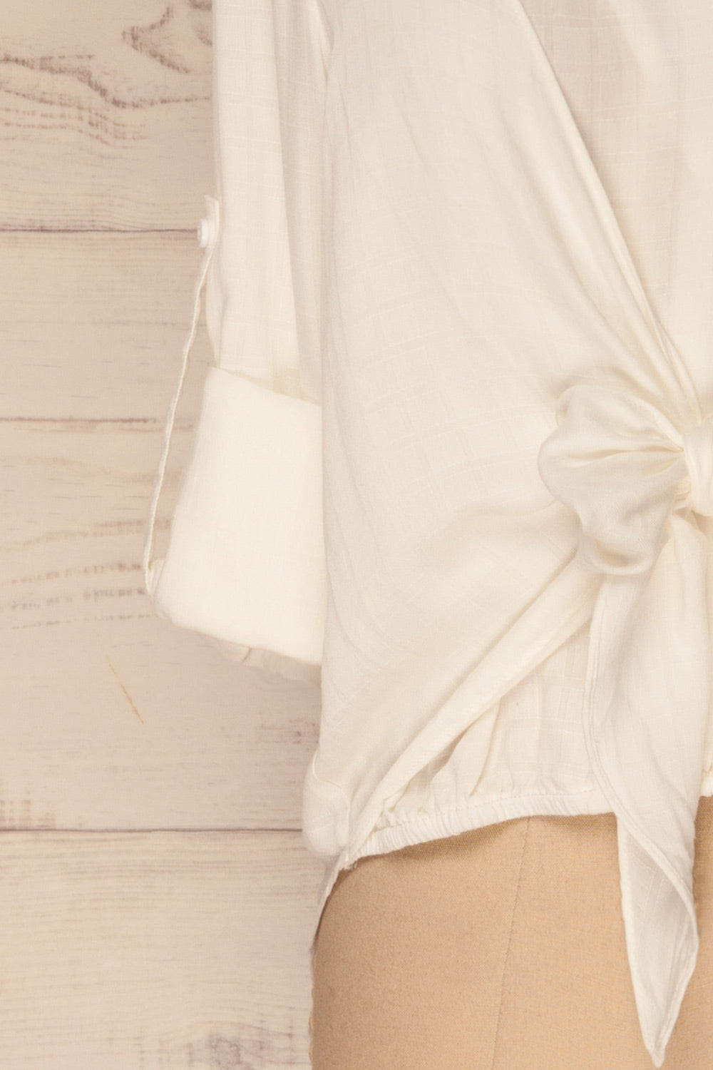 This lovely blouse will be a great addition to your professional wardrobe! Smooth and lightweight, the translucent material will drape beautifully over your figure. Dainty details such as the wrap neckline with snap closure, the high-low cut, and the tie detail make this a unique piece. Practical elements you'll appreciate include the buttons at the cuffs and elastic at the front of the waist.