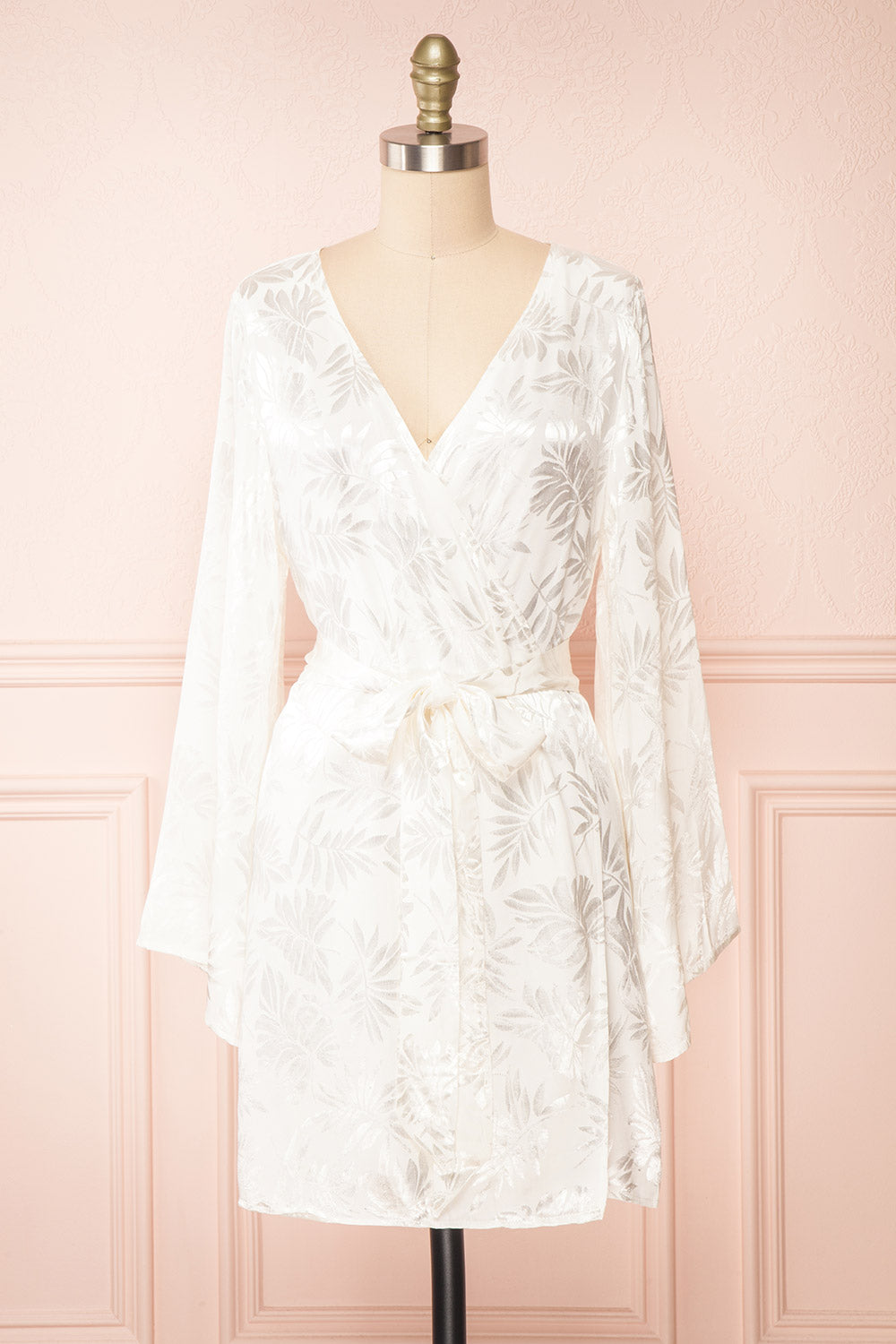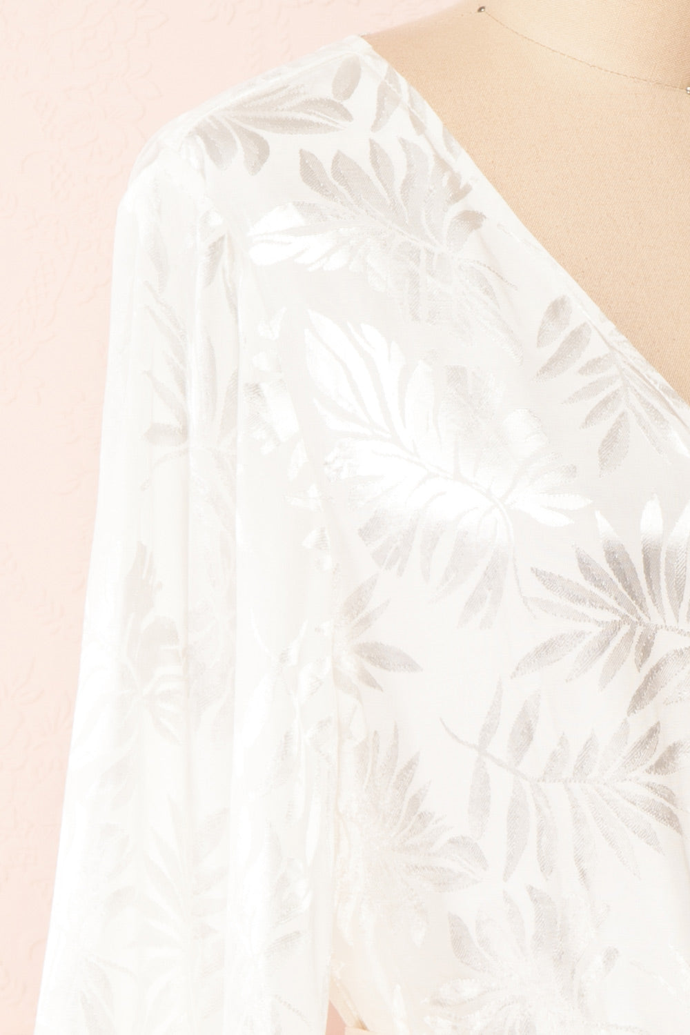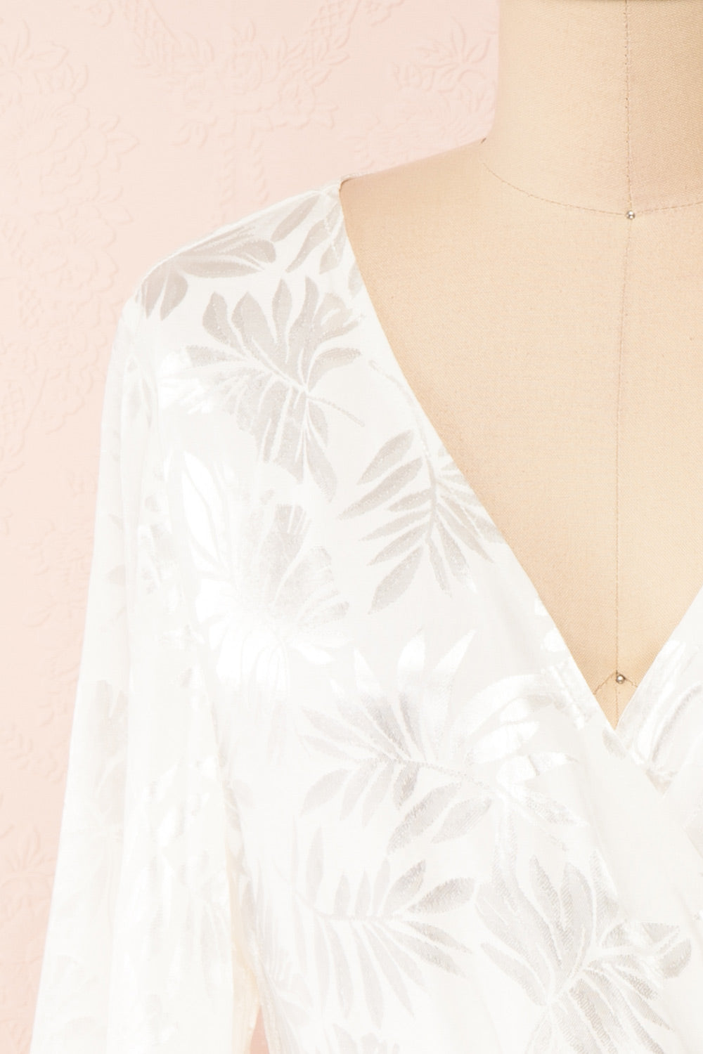Cette jolie robe portefeuille vous offrira le style séduisant que vous désirez! Vous pourrez l'ajuster confortablement, tout en soulignant vos courbes, grâce à sa ceinture de taille en tissu. Son tissu léger et satiné ainsi que sa doublure en chiffon vous offriront liberté de mouvement et confort. Vous aimerez également son imprimé délicat à motif de feuilles ainsi que son encolure en V qui révèlera votre peau!
