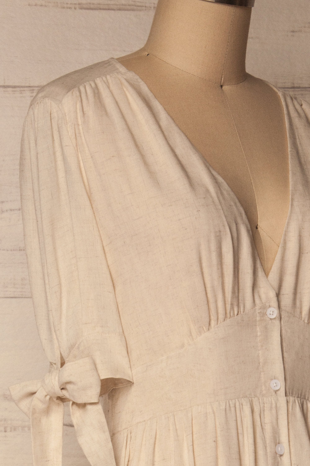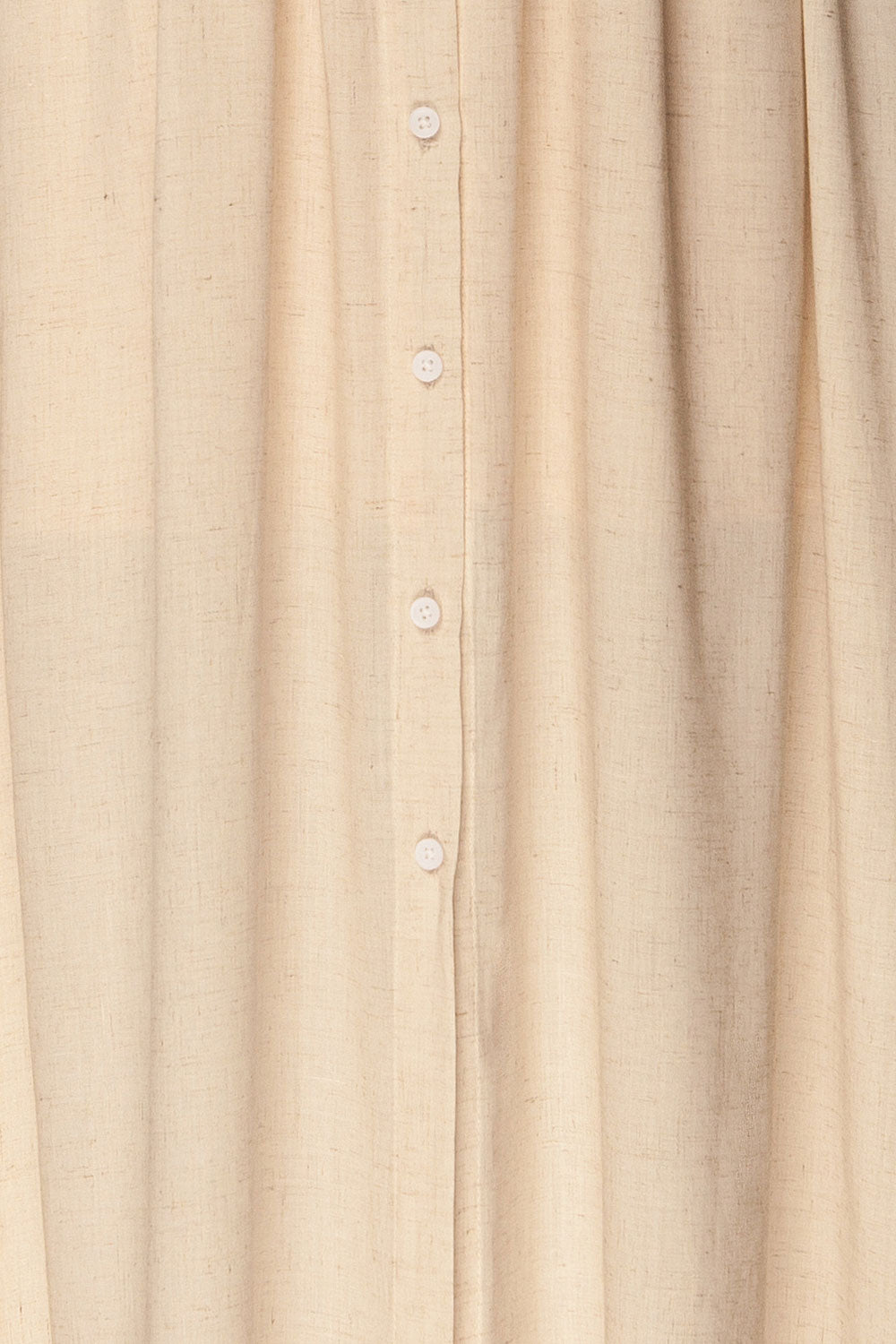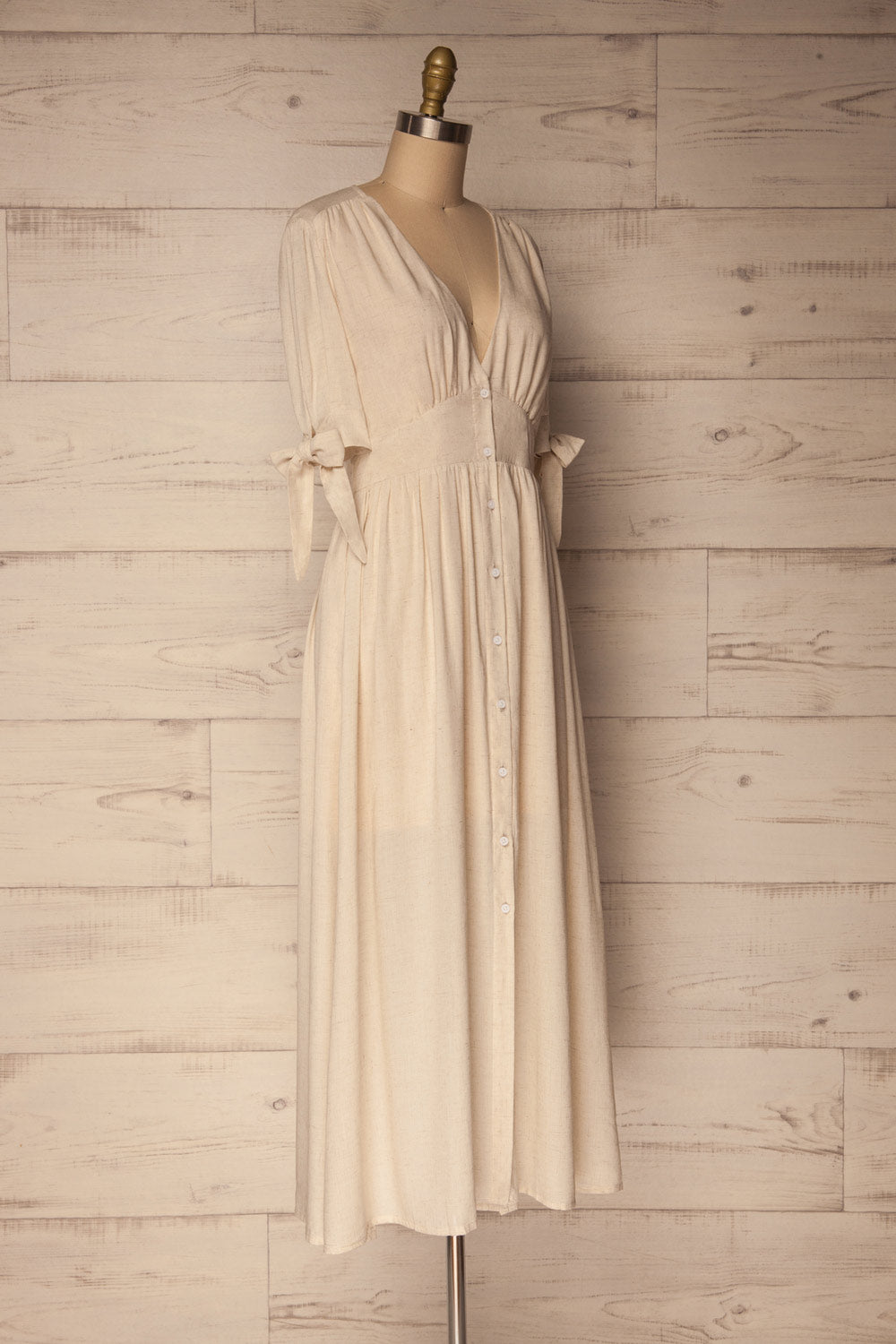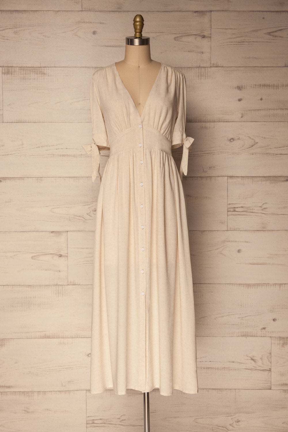 Fall under the charm of this superb buttoned maxi dress! You'll adore its flowing A-line cut, as well as its sleeves decorated with pretty bows. Its knee-length lining will keep you comfortable. Pair it with little leather sandals and a hat for a trendy summer outfit!