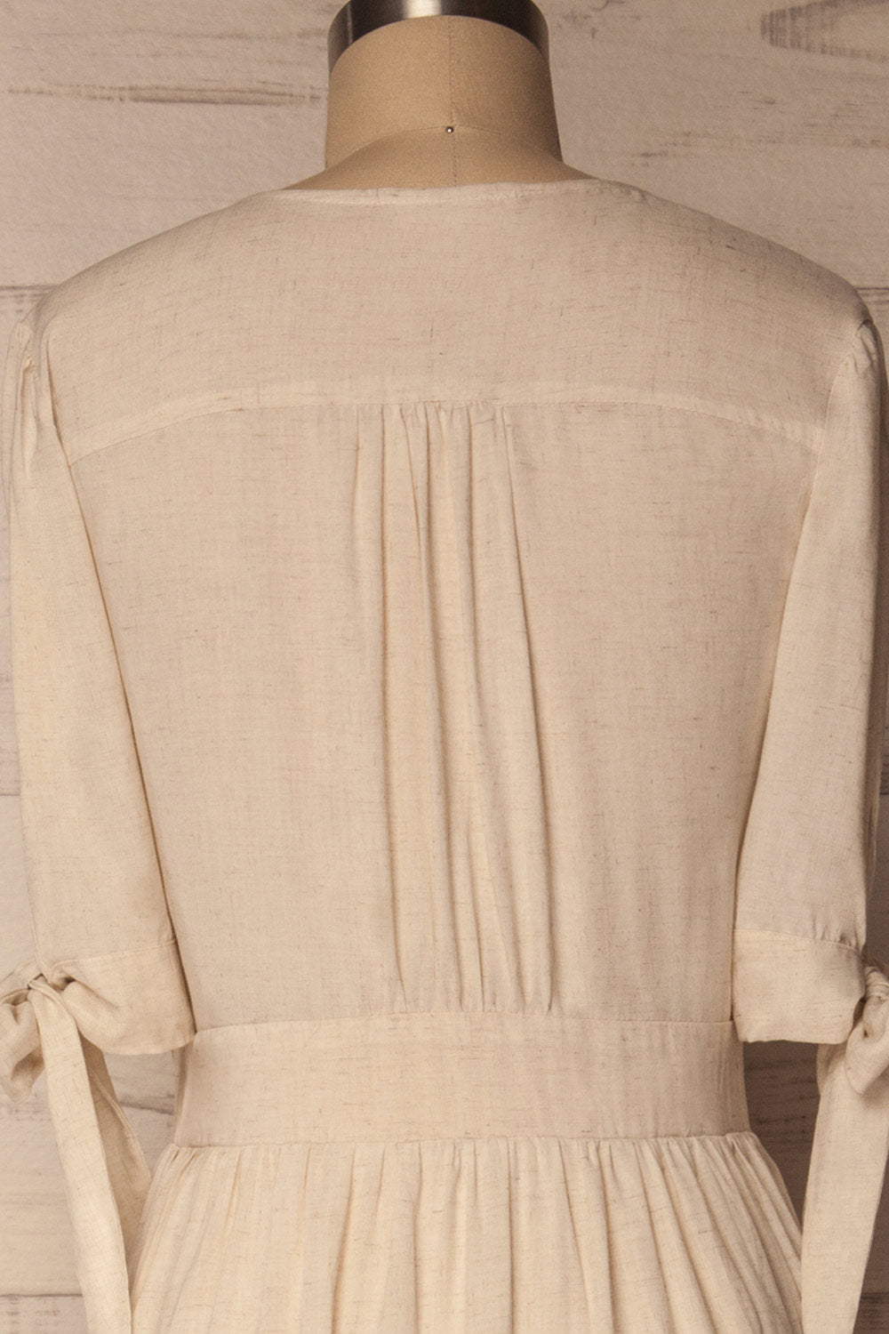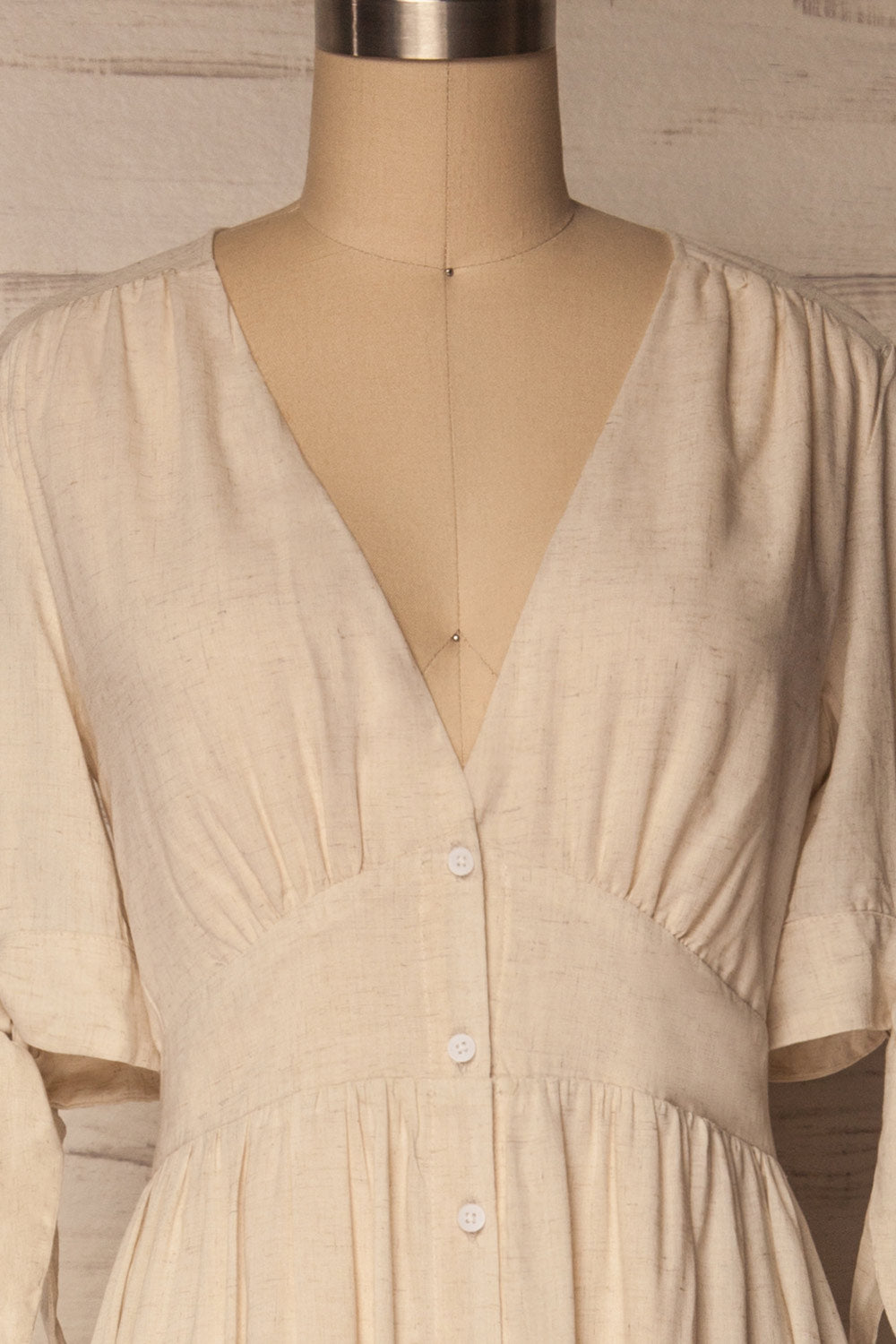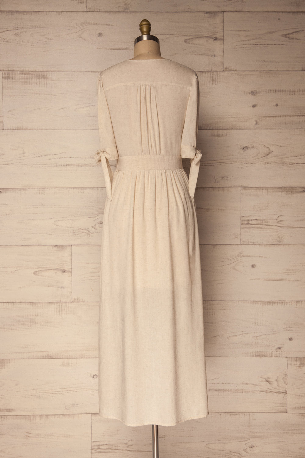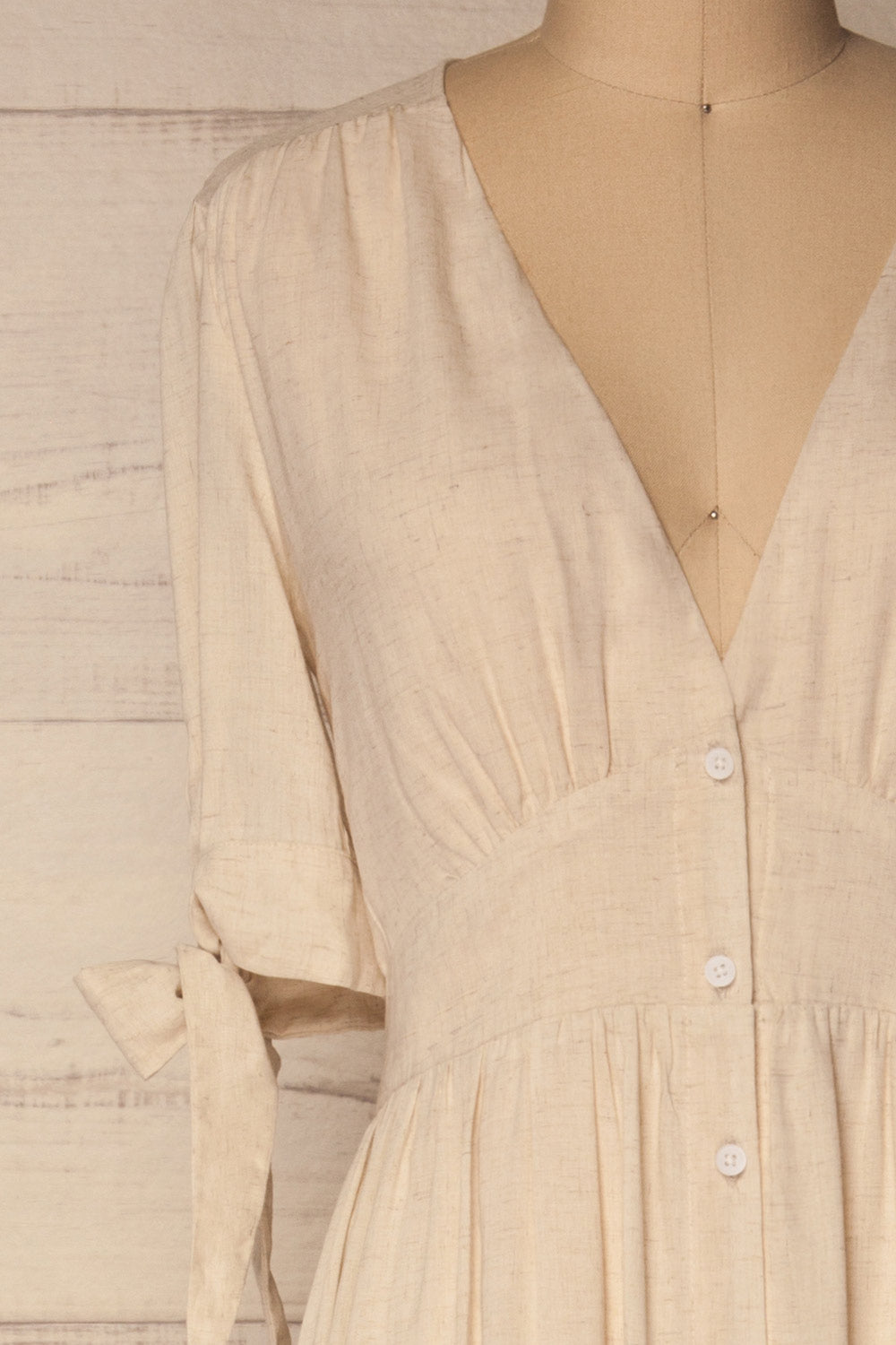Fall under the charm of this superb buttoned maxi dress! You'll adore its flowing A-line cut, as well as its sleeves decorated with pretty bows. Its knee-length lining will keep you comfortable. Pair it with little leather sandals and a hat for a trendy summer outfit!