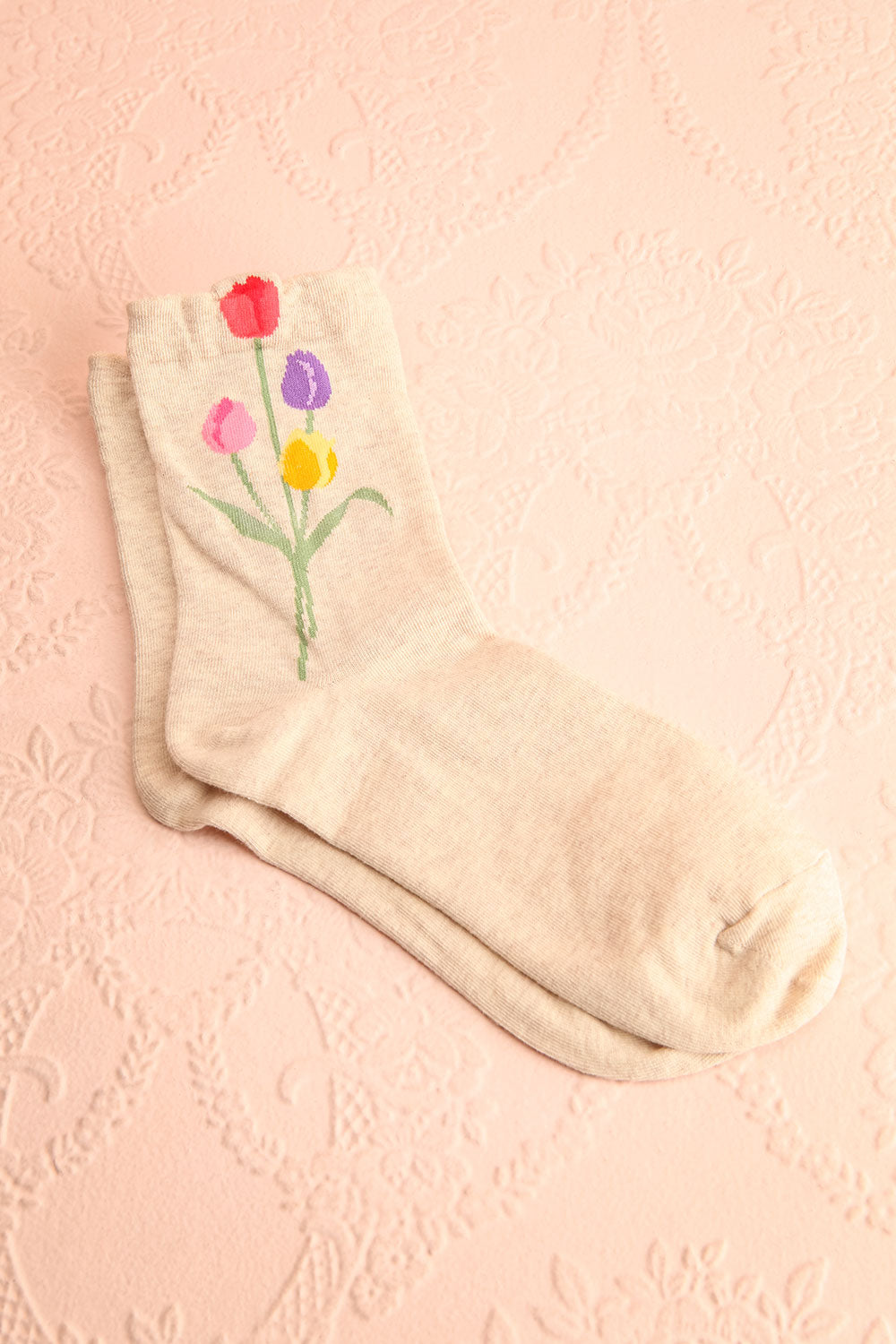 Ces adorables chaussettes mi-hautes beiges vous donneront certainement le sourire! Elles sont ornées d'un joli motif de tulipes colorées à la cheville, ajoutant une touche de couleur à votre tenue tout en vous offrant confort tout au long de la journée!