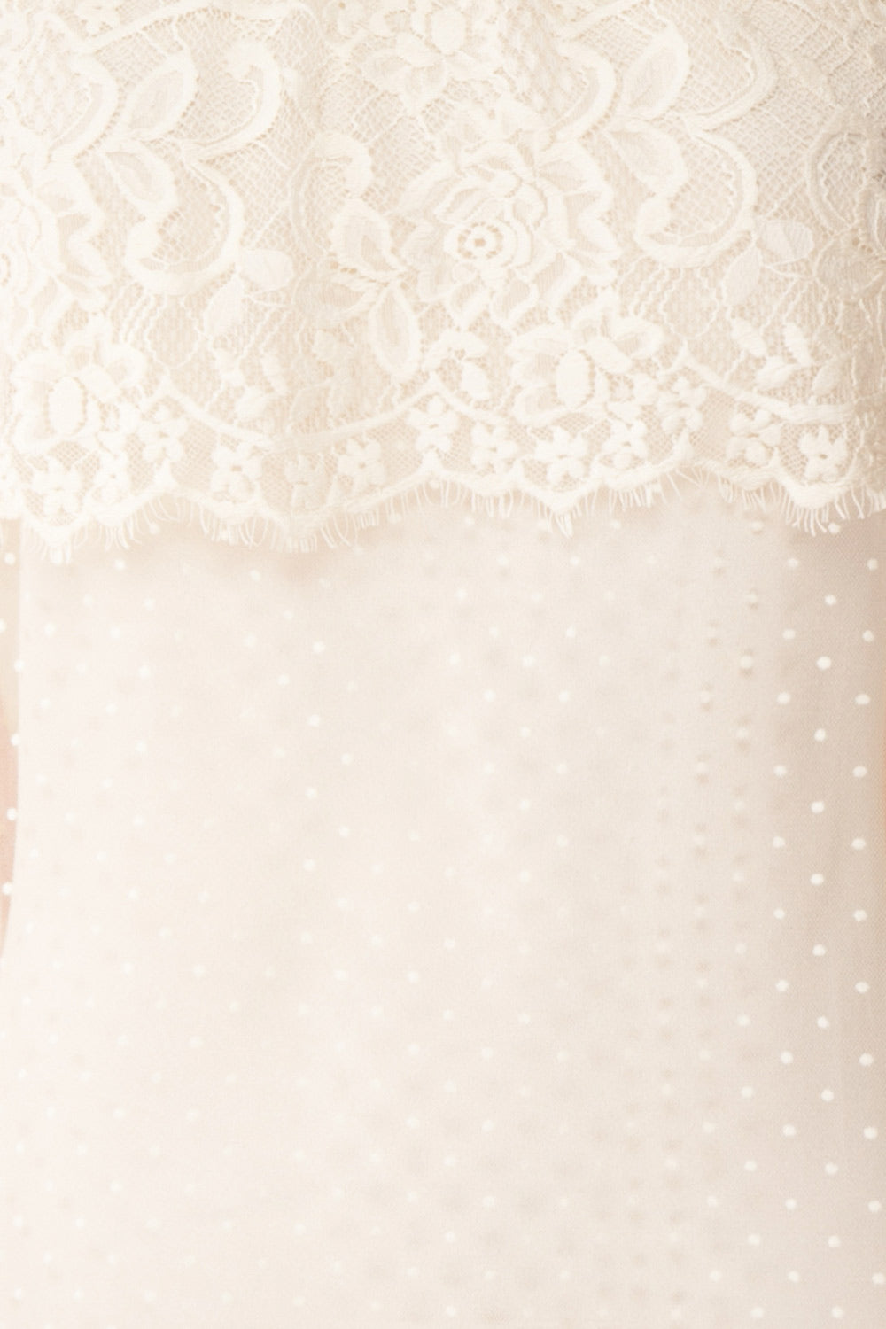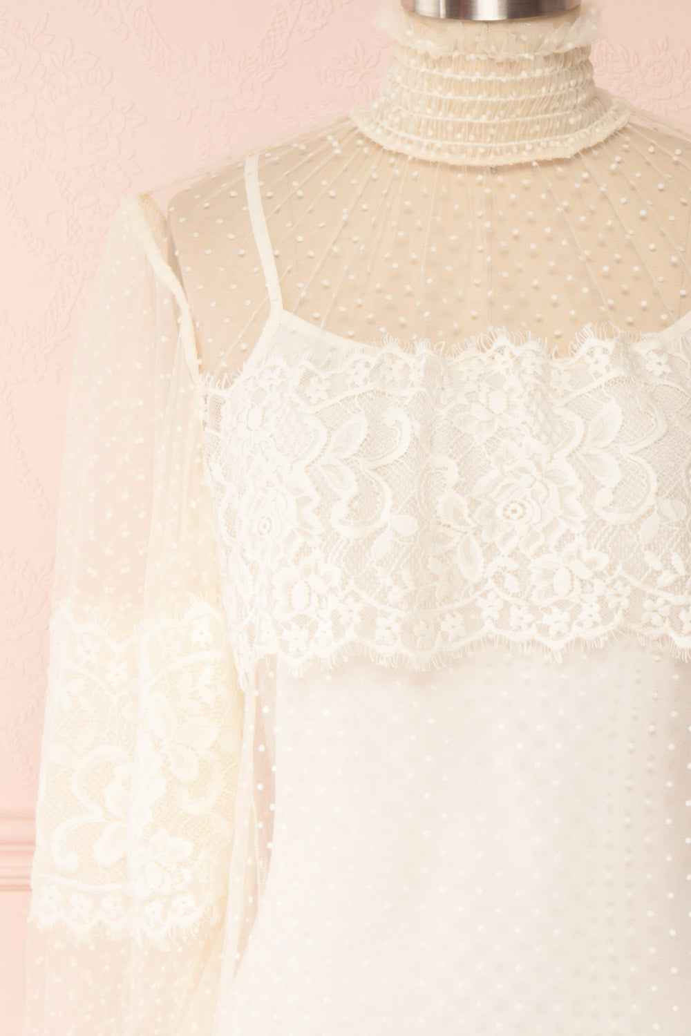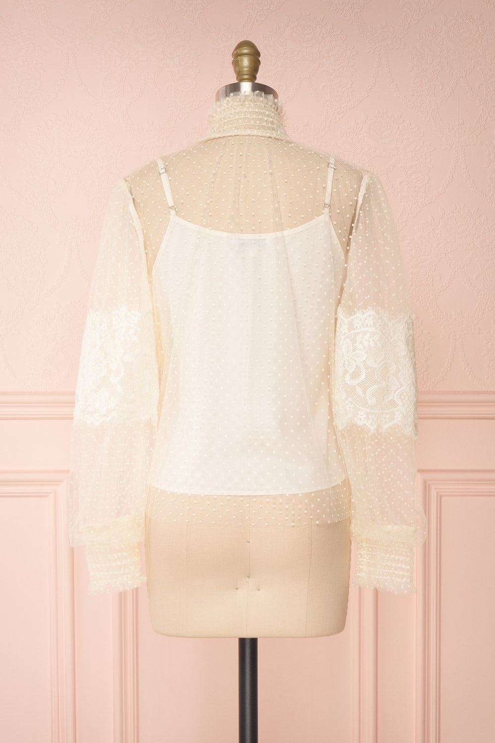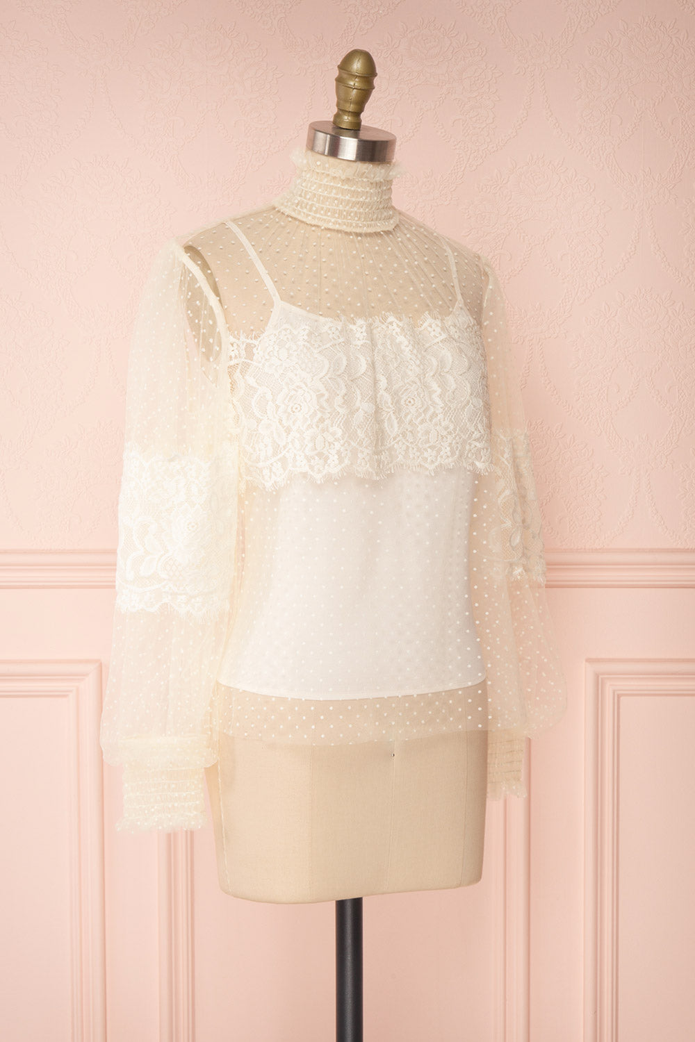 Ce charmant haut de tulle transparent sera la combinaison parfaite entre romance et élégance! Vous adorerez ses manches longues bouffantes et son col montant, tous deux ornés de volants. Votre peau sera dévoilée de façon délicate derrière le tissu léger de la pièce alors que sa doublure de camisole satinée à bretelles ajustables se déposera confortablement sur vous.