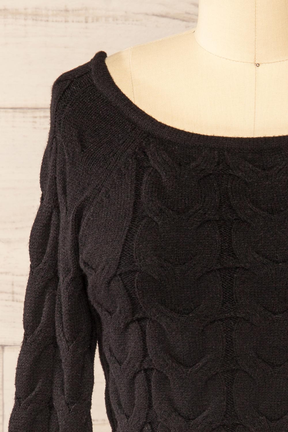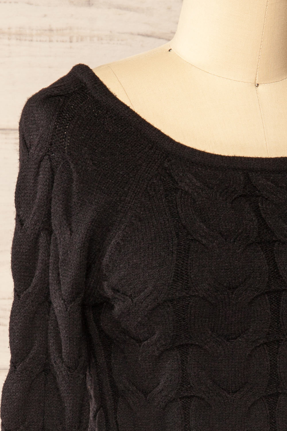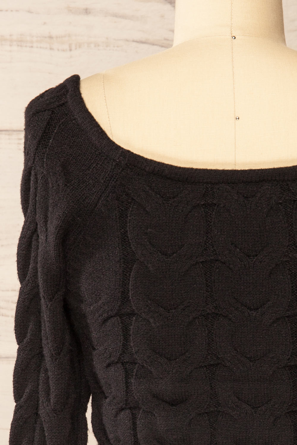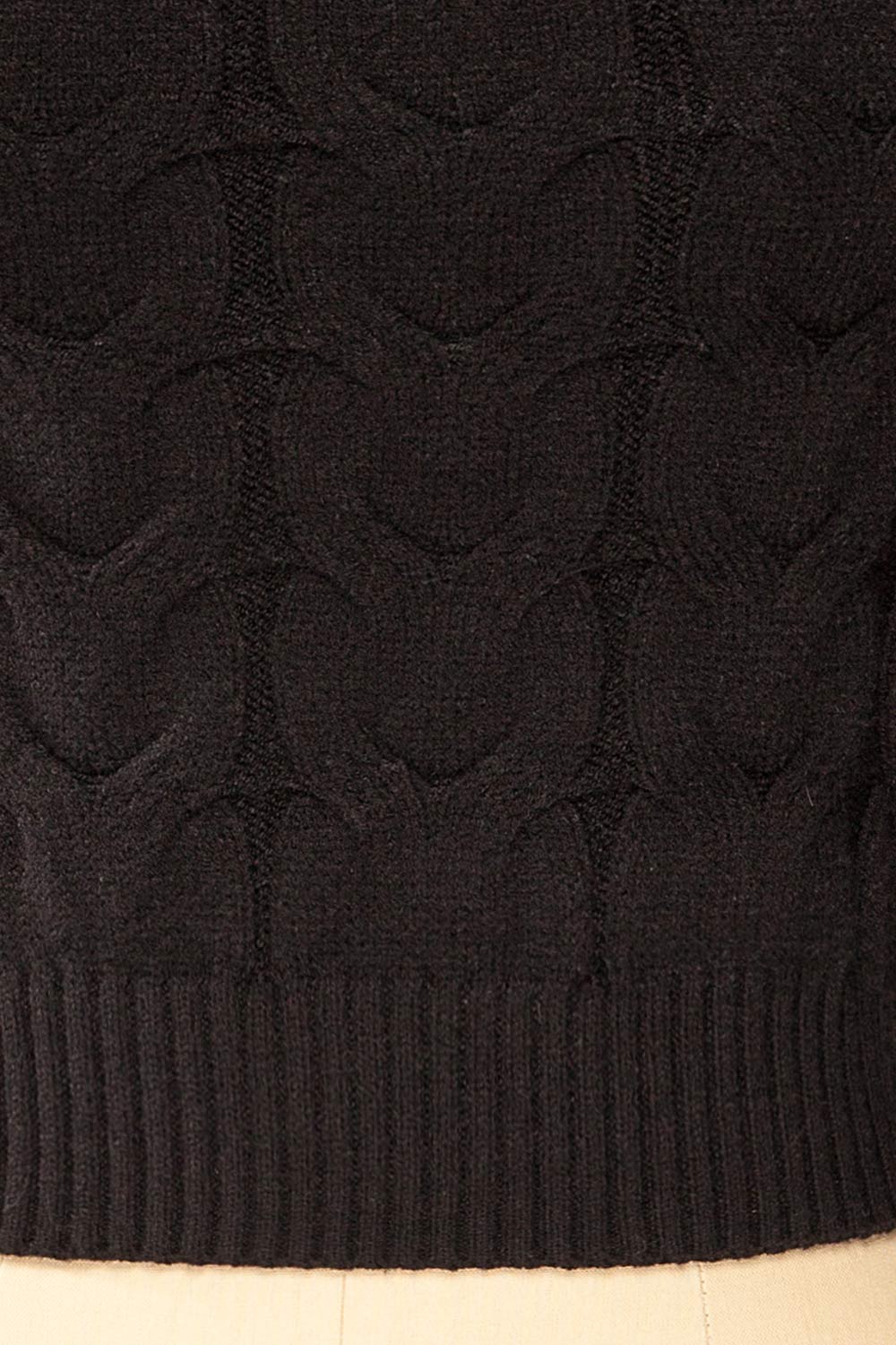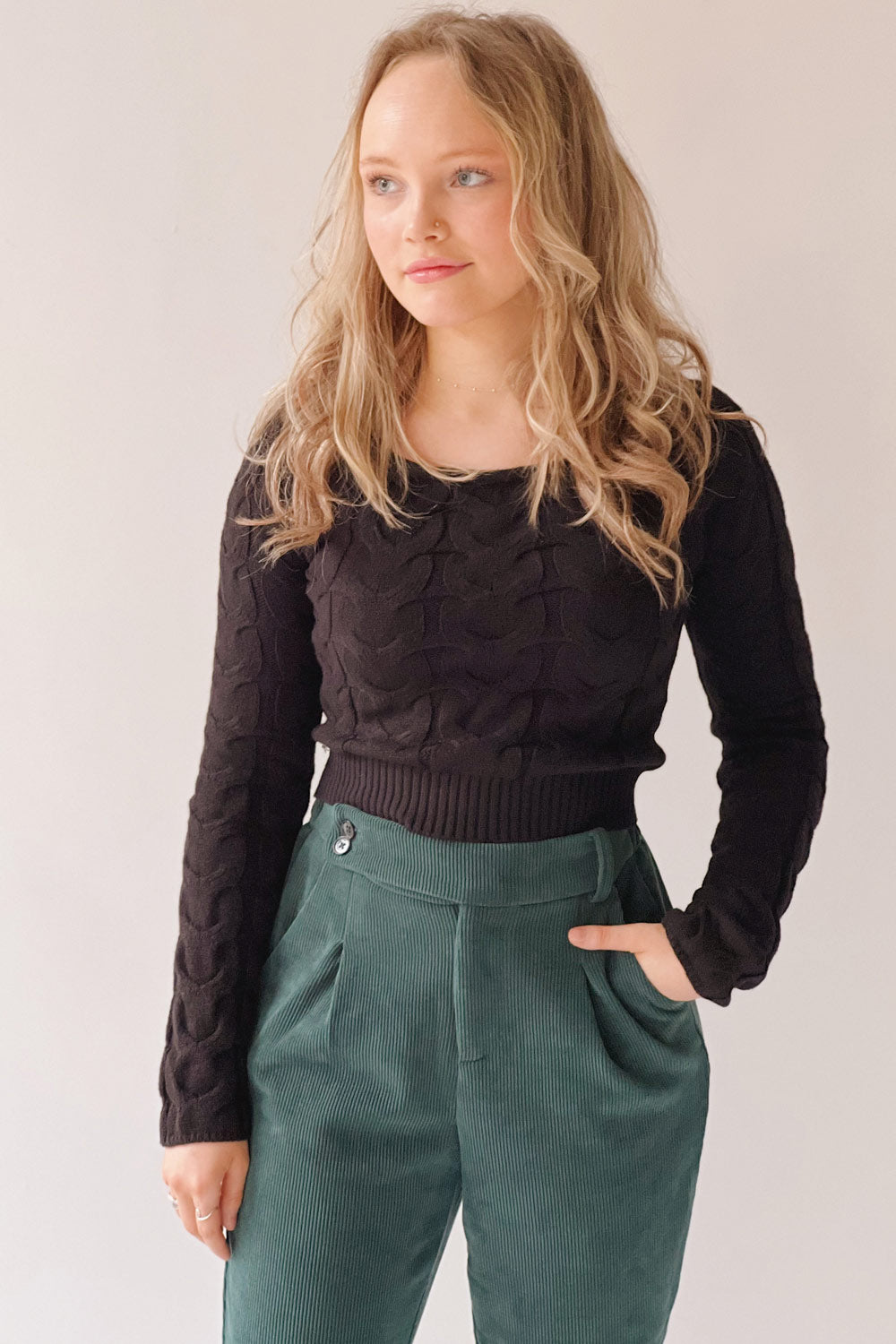Restez confortable et chic dans ce tricot écourté noir! Complètement confortable, ce haut est fait d'une grosse maille torsadée et extensible. Parfait pour rester stylée, portez-le avec un jean taille haute et des bottes à talons pour une jolie tenue de tous les jours!
