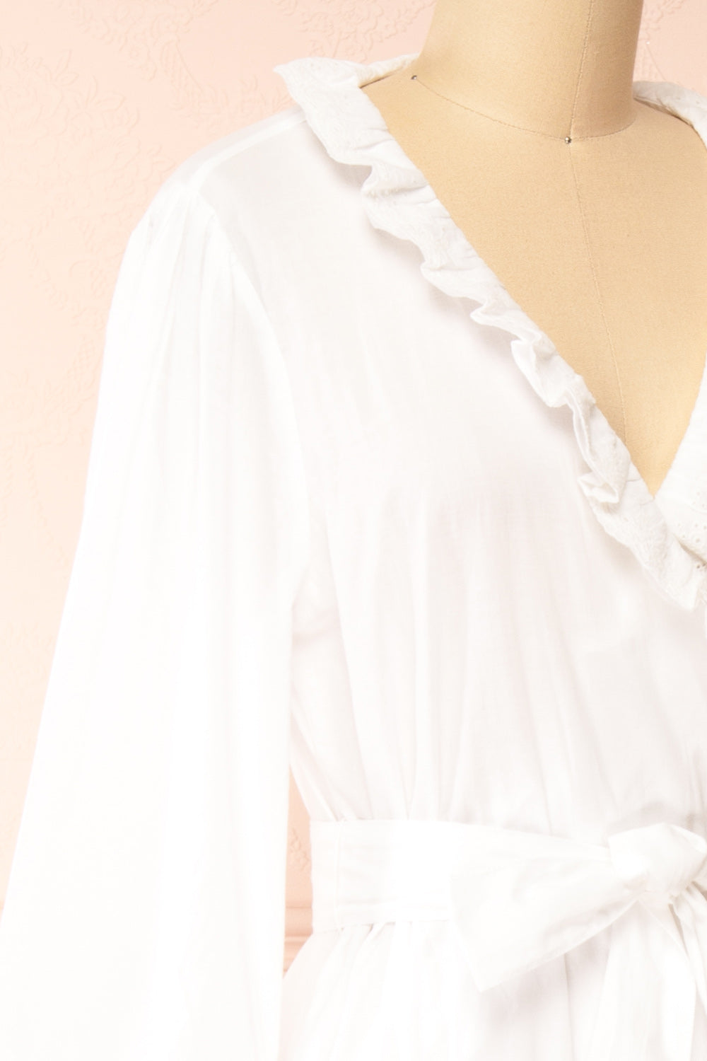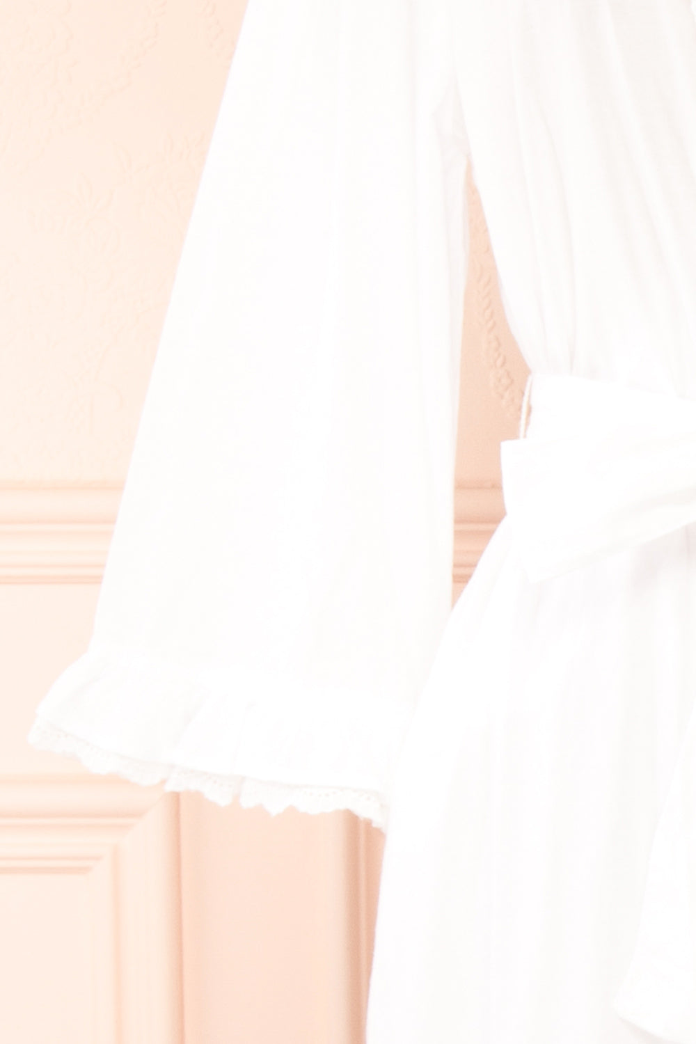 Profitez des moments de pure détente dans cette ravissante longue robe de chambre blanche, ornée de volants délicats pour une touche de charme fantaisiste. Les manches 3/4 ajoutent une allure gracieuse, vous enveloppant dans une aura d'élégance intemporelle. Une ceinture en tissu cintre la taille, créant une silhouette flatteuse qui incarne à la fois confort et beauté. Vous adorerez les poches qui s’avèreront pratiques lors du réveil.