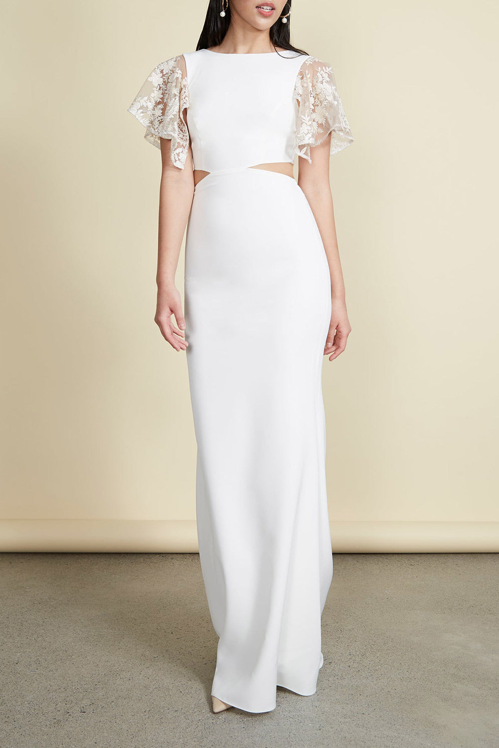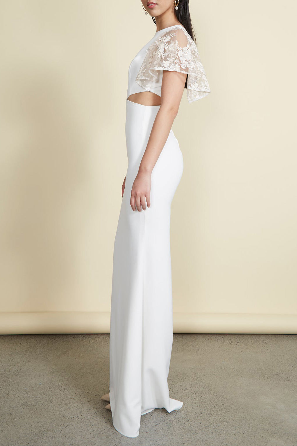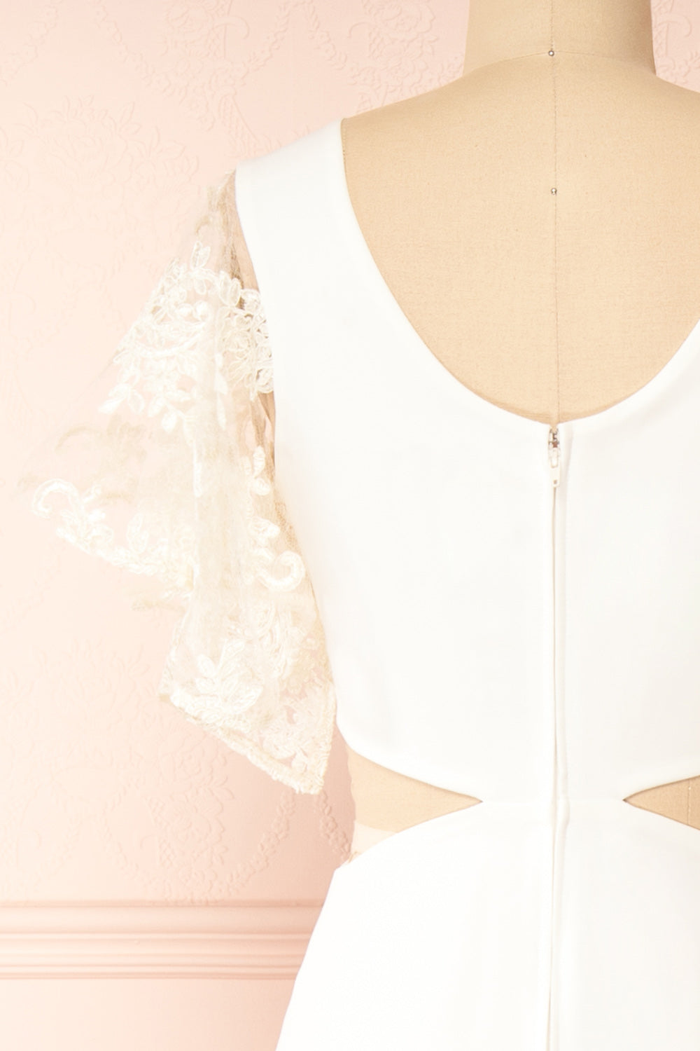 L'élégance intemporelle de cette robe maxi ivoire possède une touche de modernité sophistiqué! Faite à Montréal par Arti Gogna, sa coupe sirène épousera votre silhouette et tombera avec fluidité jusqu'au sol. Les manches papillon ornées de dentelle et les découpes au niveau de la taille vous démarqueront. Une fermeture éclair dissimulée au dos vous permettra de l'enfiler avec facilité.