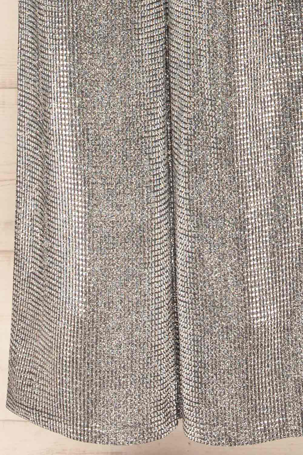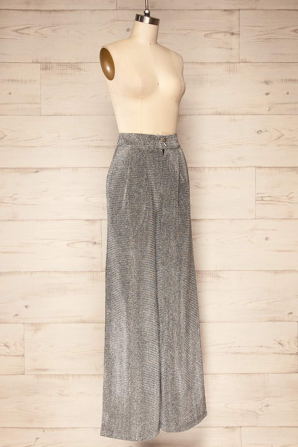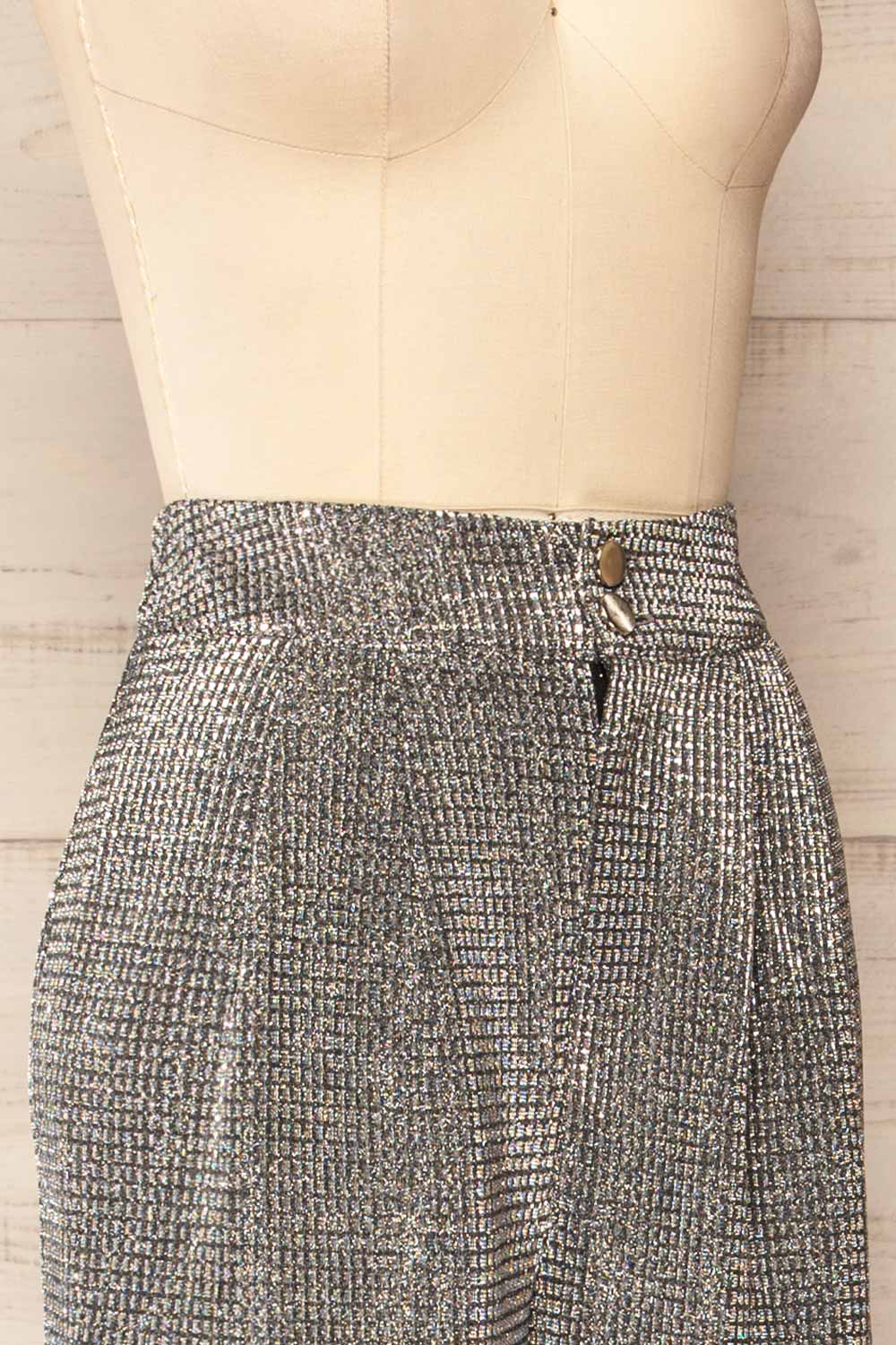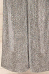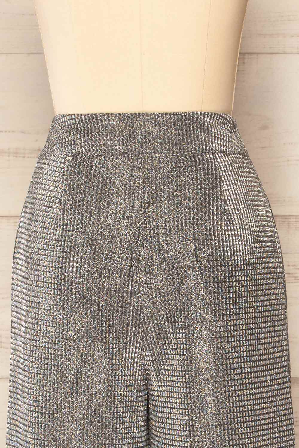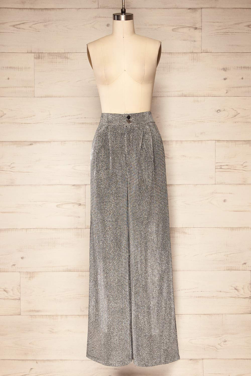 Vous brillerez comme un diamant vêtue de ce superbe pantalon à taille haute! Son tissu texturé à fibres métalliques lui donne son aspect scintillant, tandis que sa doublure lisse et sa coupe à jambe large vous garderont confortable. Ses poches latérales vous permettront d'y ranger vos essentiels et vous apprécierez ses détails tels que ses pinces à l'avant et ses deux boutons argentés à la taille.