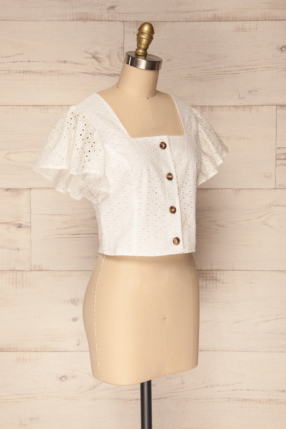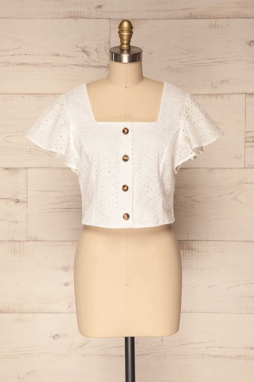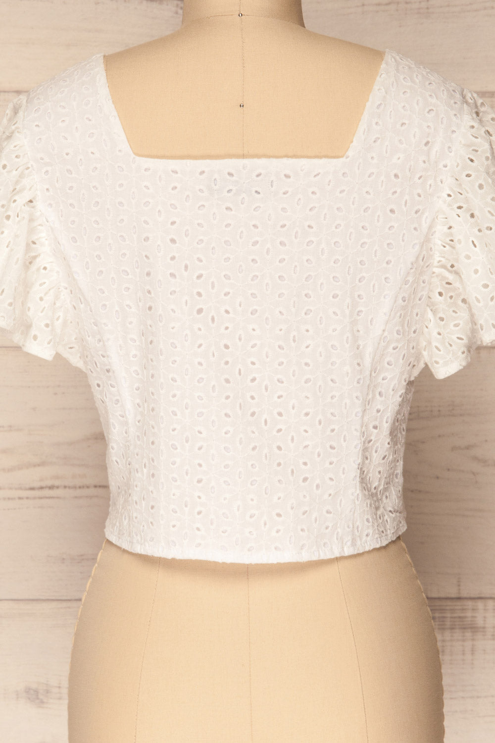 On sand dune beaches or a festive soirée, this crop top will accompany you with a summer breeze! Its lightweight and openwork material will be comfortable to wear under the sun, while its smooth lining will offer you the necessary coverage. Button details and butterfly sleeves are charming elements.