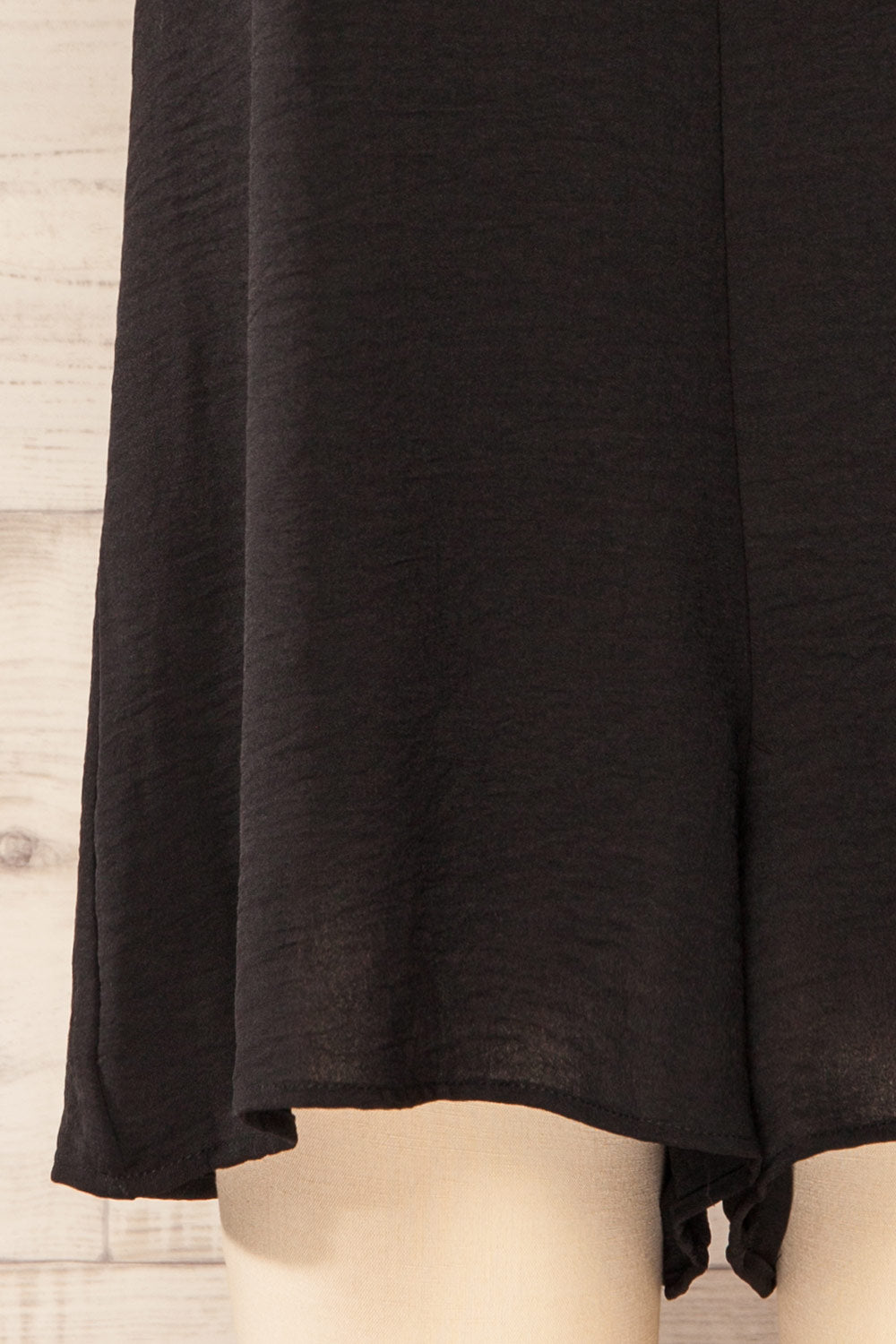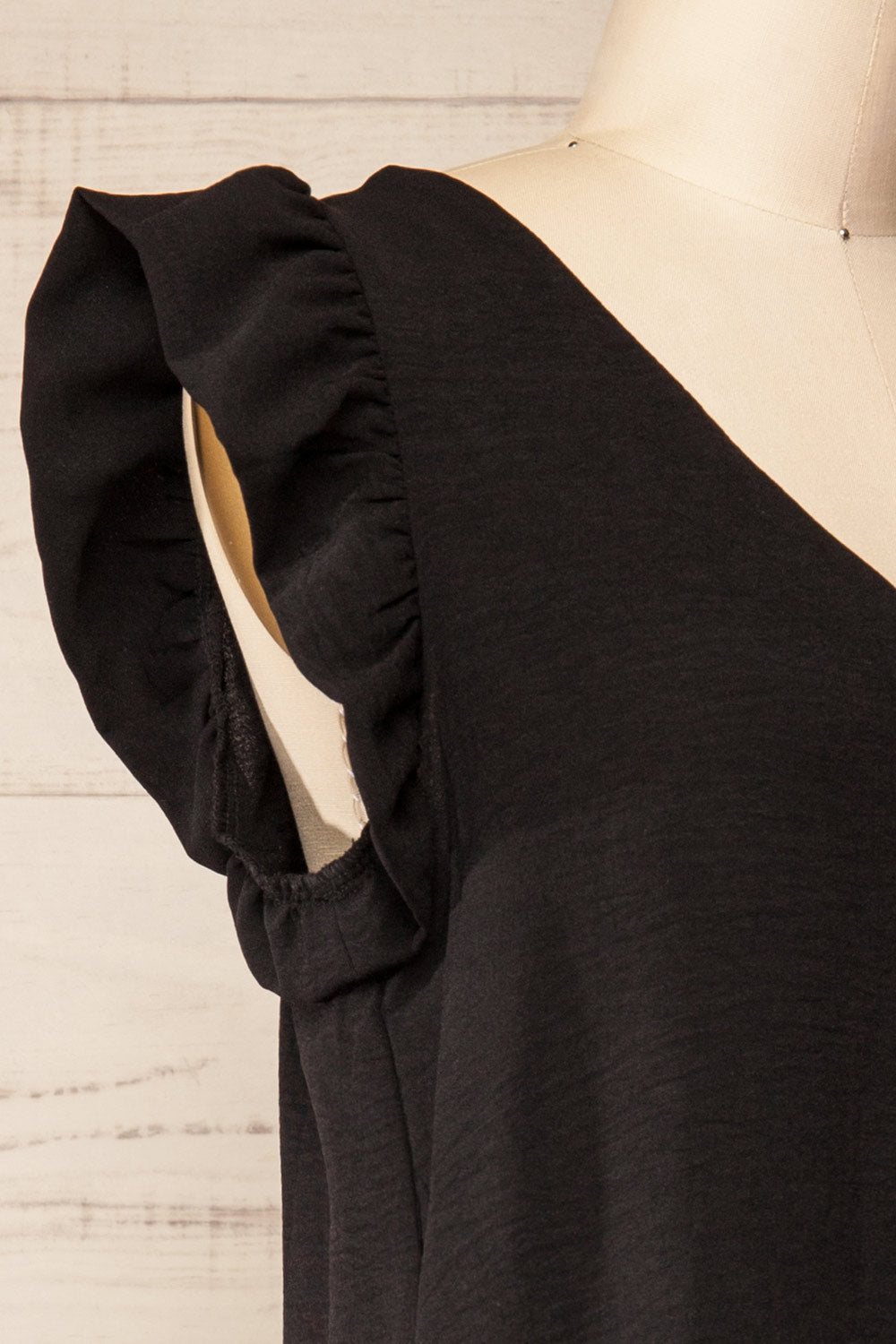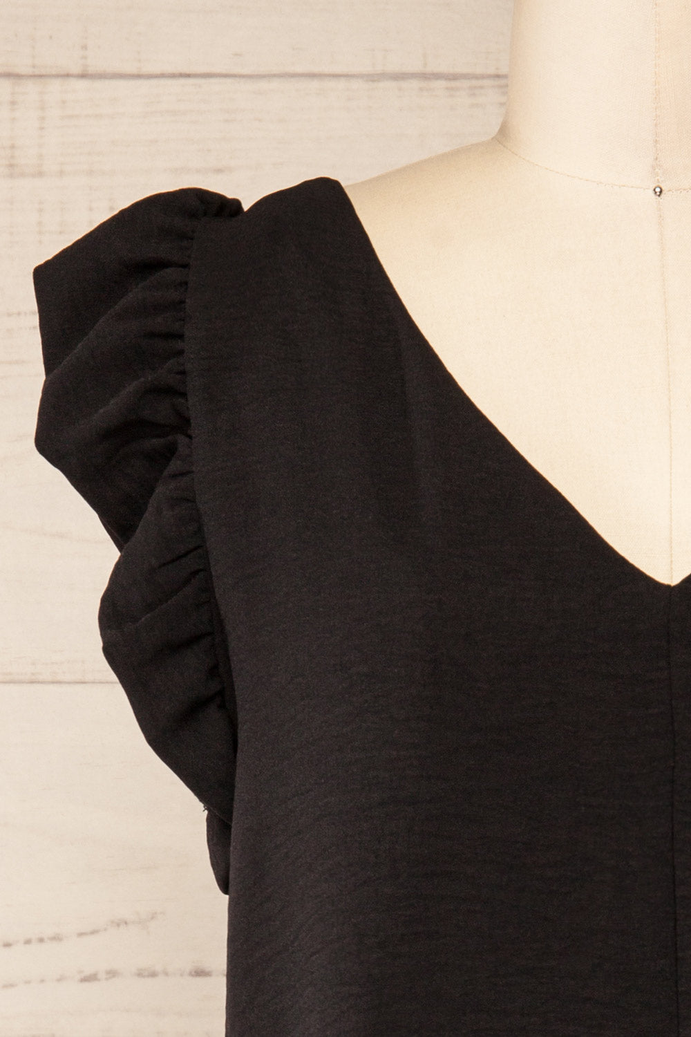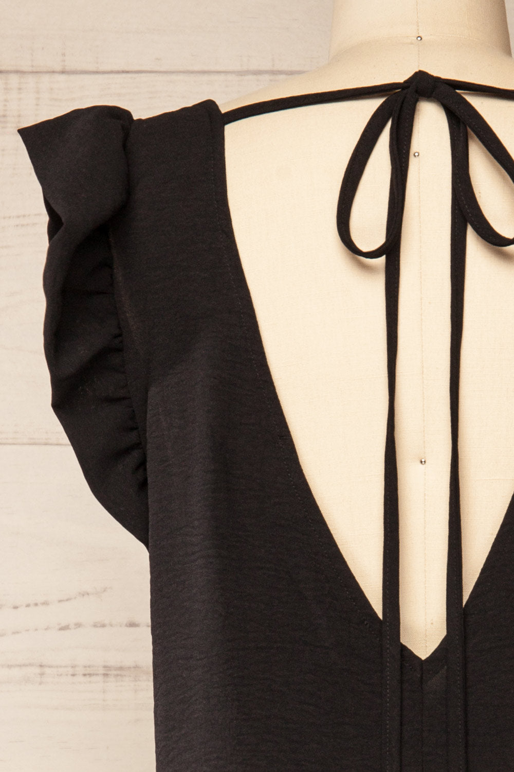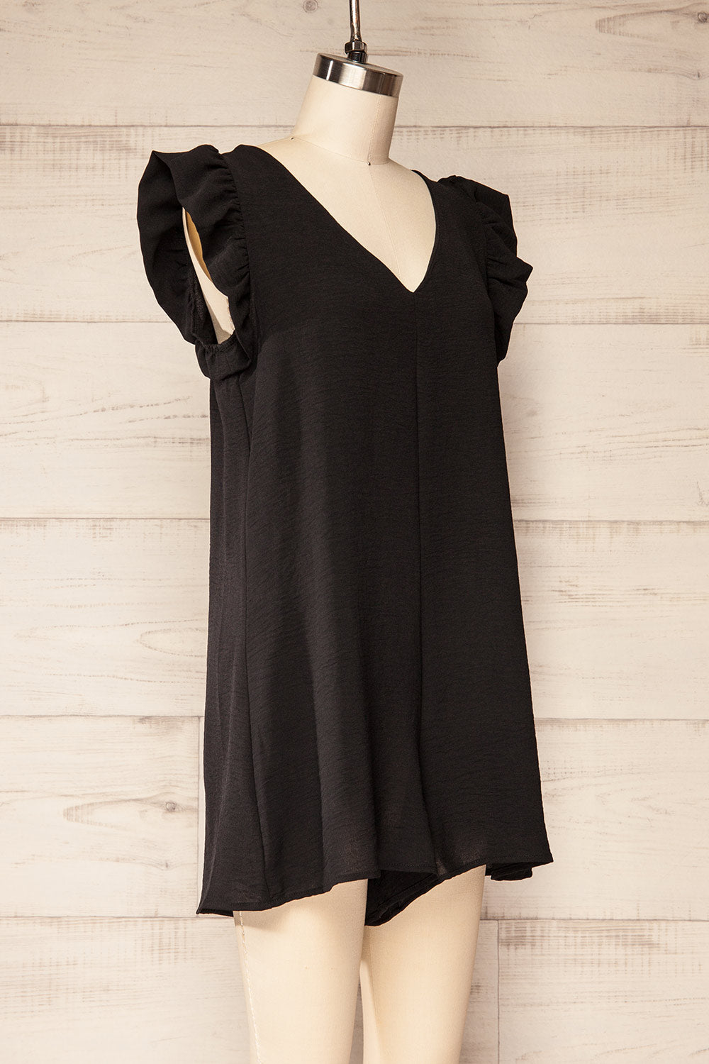 Évadez-vous dans un état d'esprit estival avec ce combishort noir à la coupe décontractée, un compagnon idéal pour les journées au bord du lac et les dimanches paresseux. Le tissu léger se drape sans effort sur le corps, tandis que l'encolure en V et le dos ouvert avec une attache donnent une touche de souplesse. La petite manche à volants ajoute une touche de fantaisie, alors que la coupe droite et le short ample garantissent votre confort!