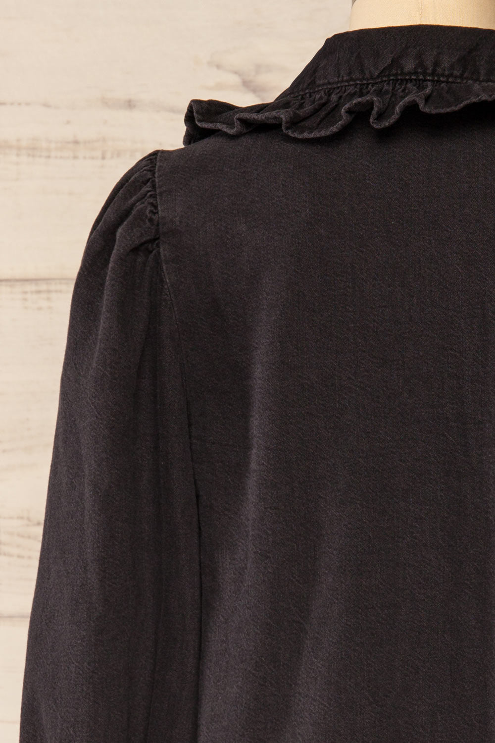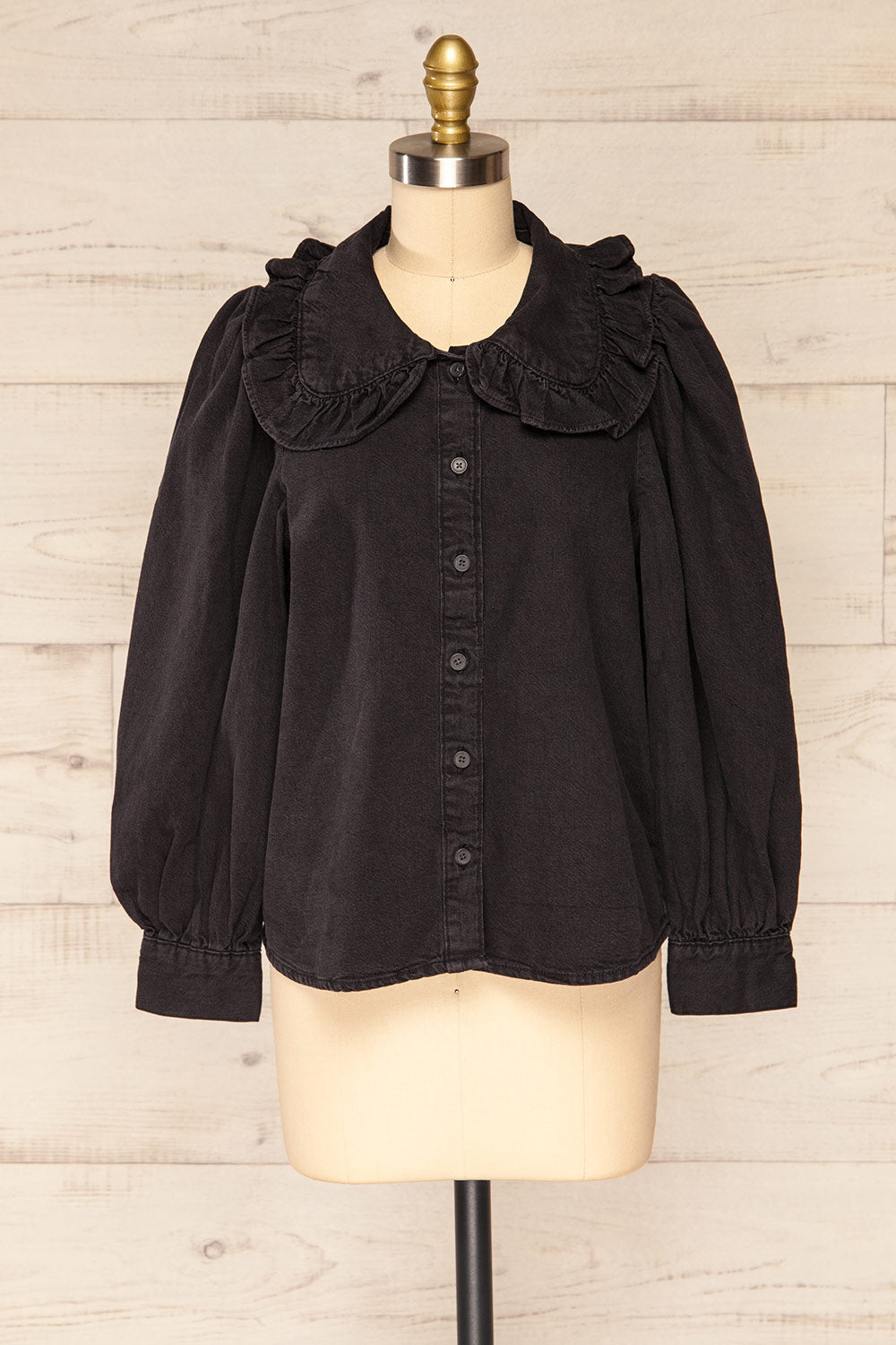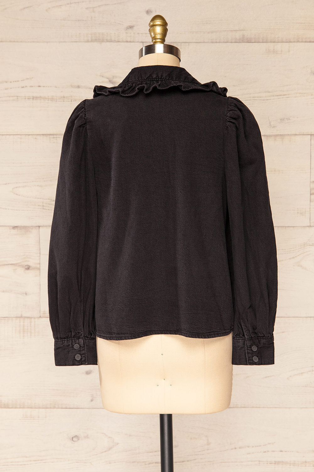 Cette chemise en denim noir est une version originale d'un classique favori! Son col à volants et ses manches bouffantes donnent une dimension vintage à cette pièce moderne. Ses boutons sont une caractéristique utile qui lui ajoutent polyvalence et style. Portez-là telle qu'elle ou avec un haut en dessous afin de créer une jolie tenue superposée.