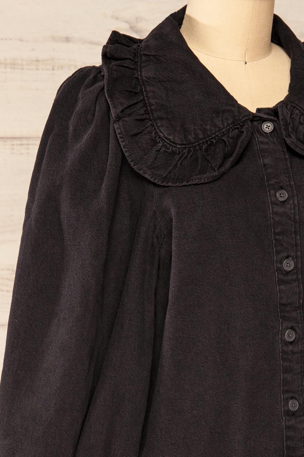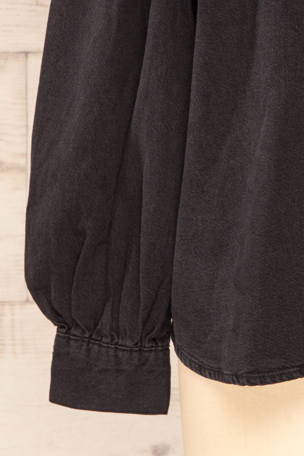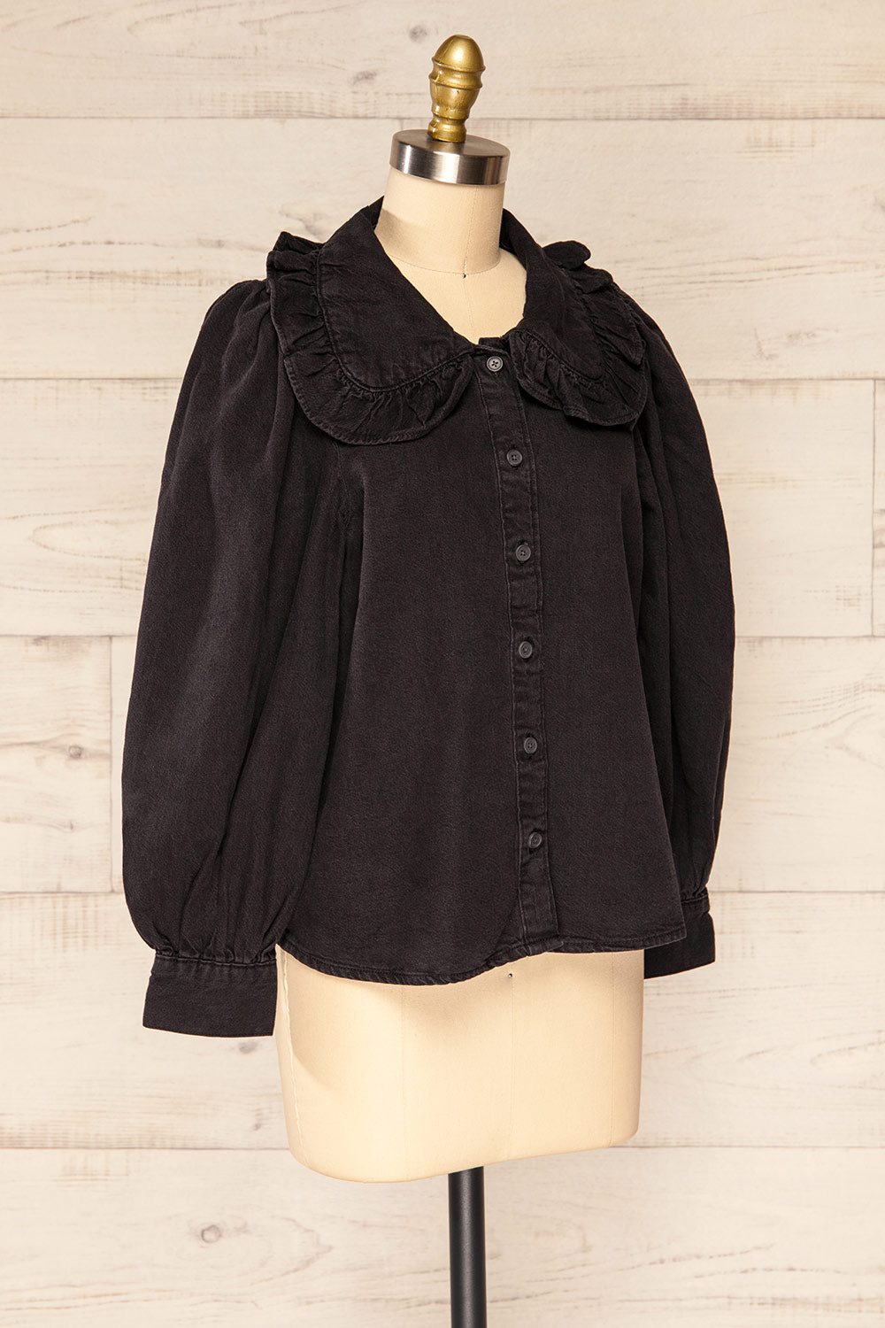 Cette chemise en denim noir est une version originale d'un classique favori! Son col à volants et ses manches bouffantes donnent une dimension vintage à cette pièce moderne. Ses boutons sont une caractéristique utile qui lui ajoutent polyvalence et style. Portez-là telle qu'elle ou avec un haut en dessous afin de créer une jolie tenue superposée.