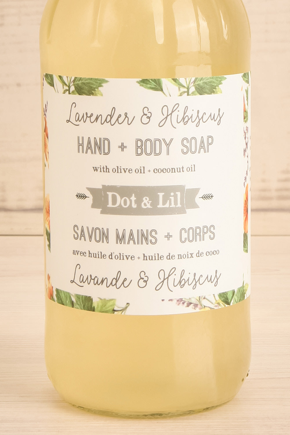 Vous adorerez ce savon liquide pour les mains et le corps! Fait à Montréal par Dot & Lil, il est composé d'huile d'olive et d'huile de noix de coco. Sa mousse riche et hydratante laissera un agréable parfum aux notes de lavande et d'hibiscus sur votre peau. Sa délicate bouteille de verre complimentera à merveille votre décor!