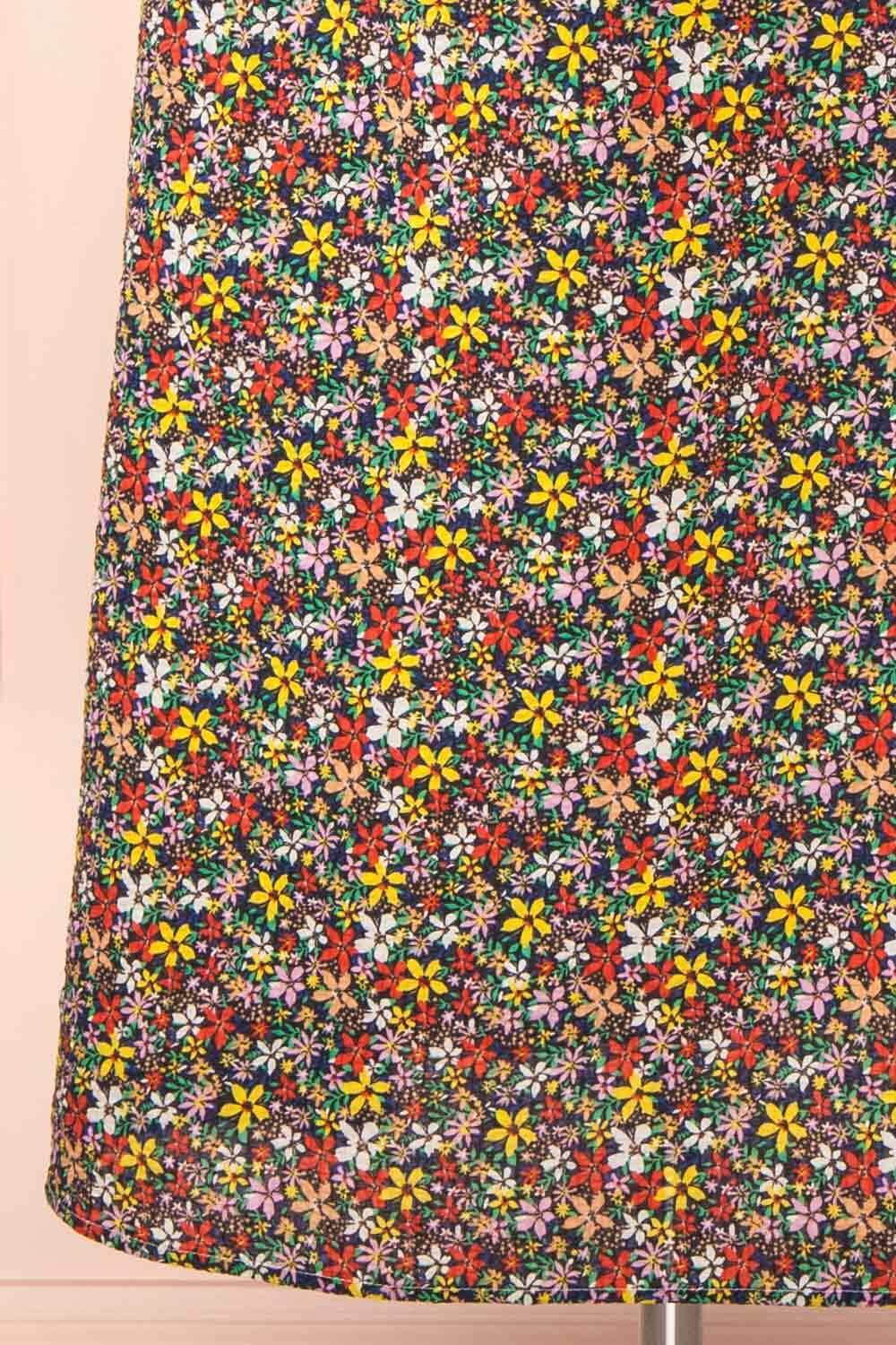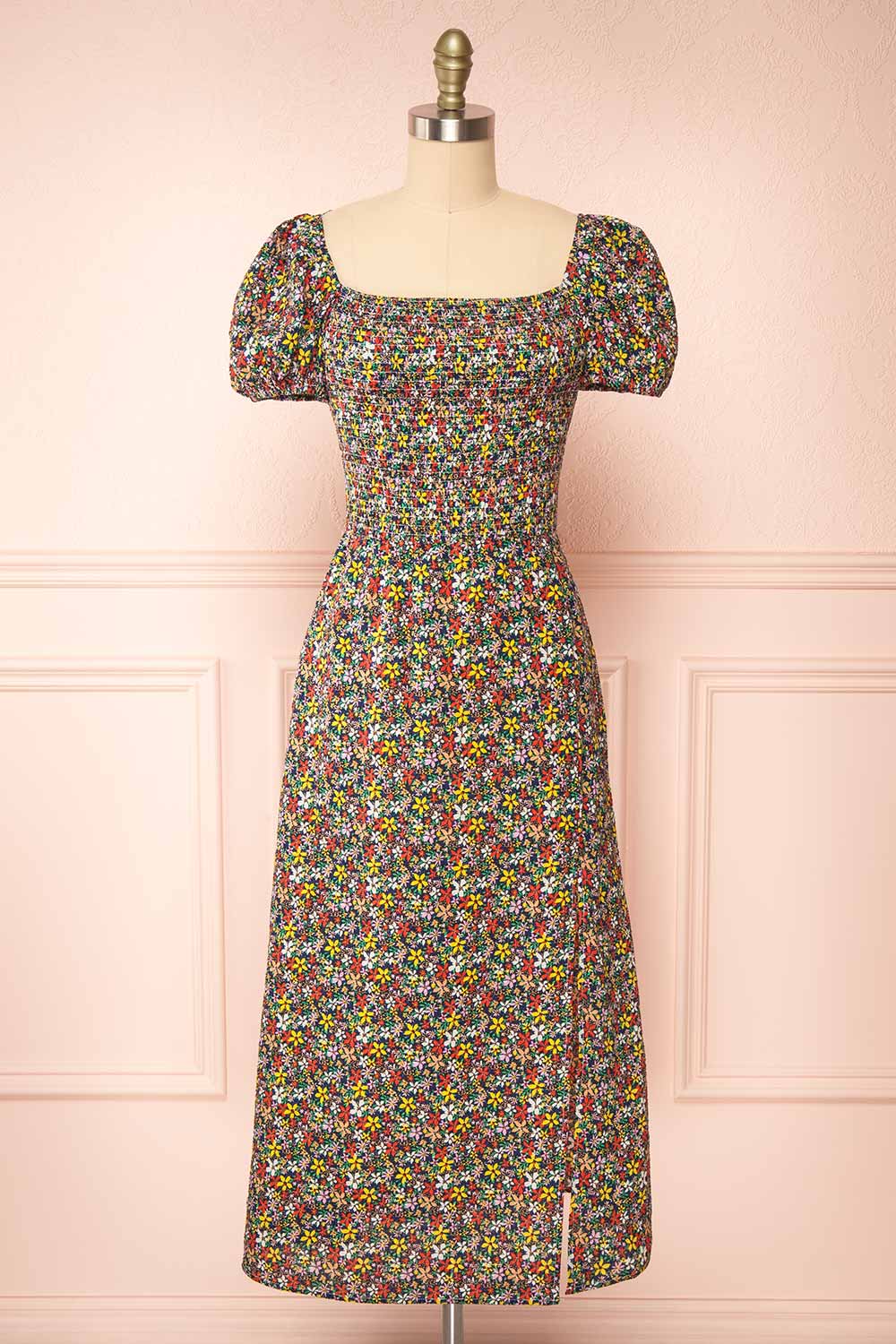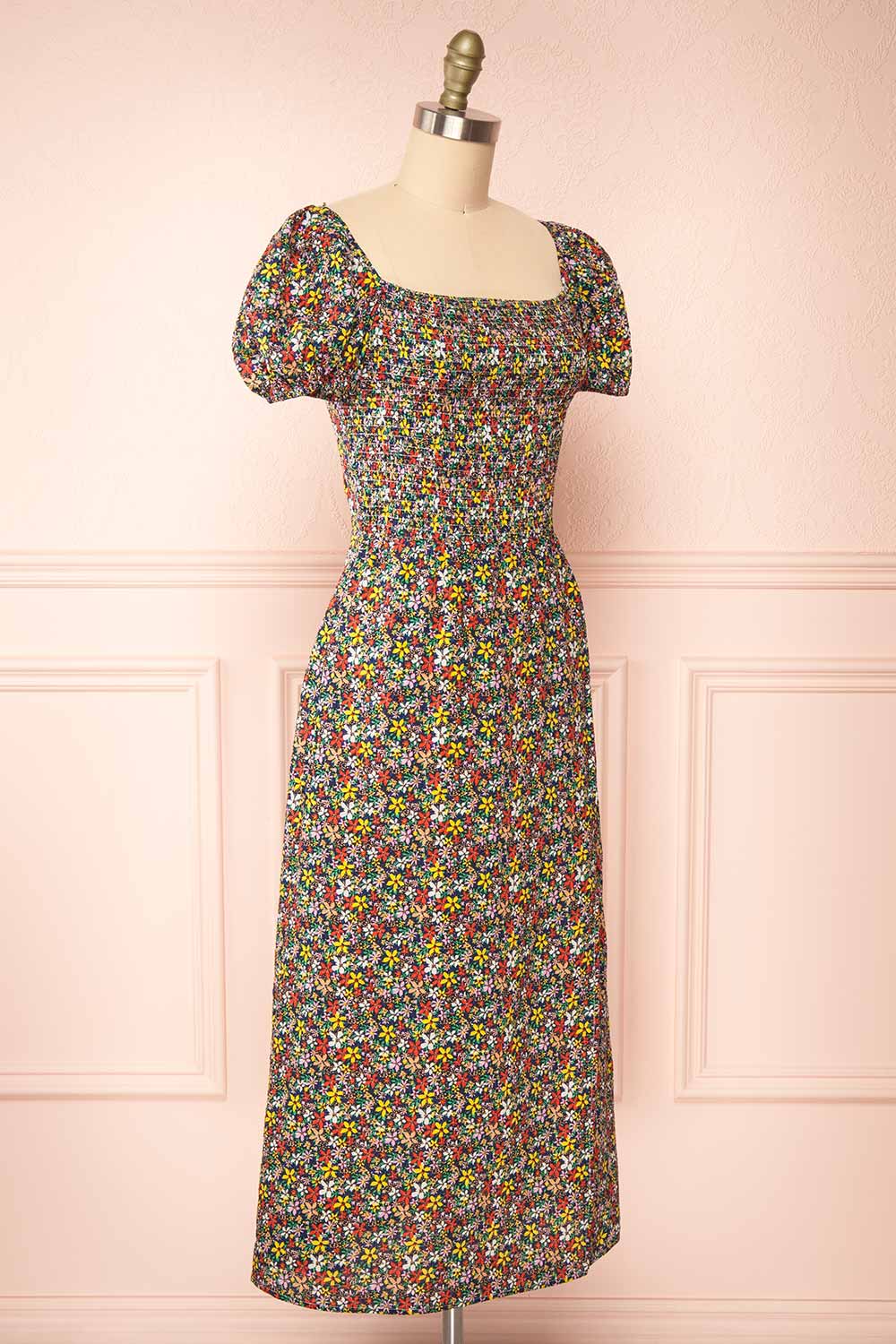 Syrniki | Robe Midi Noire Fleurie à Manches Bouffantes