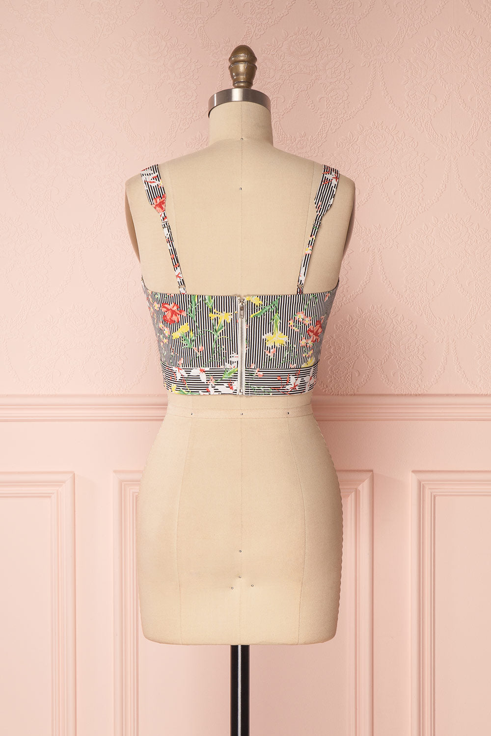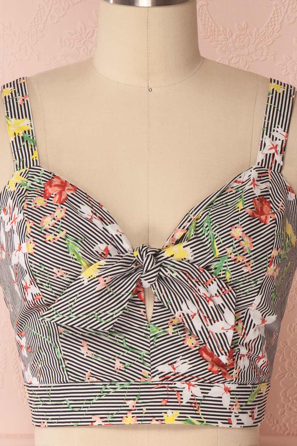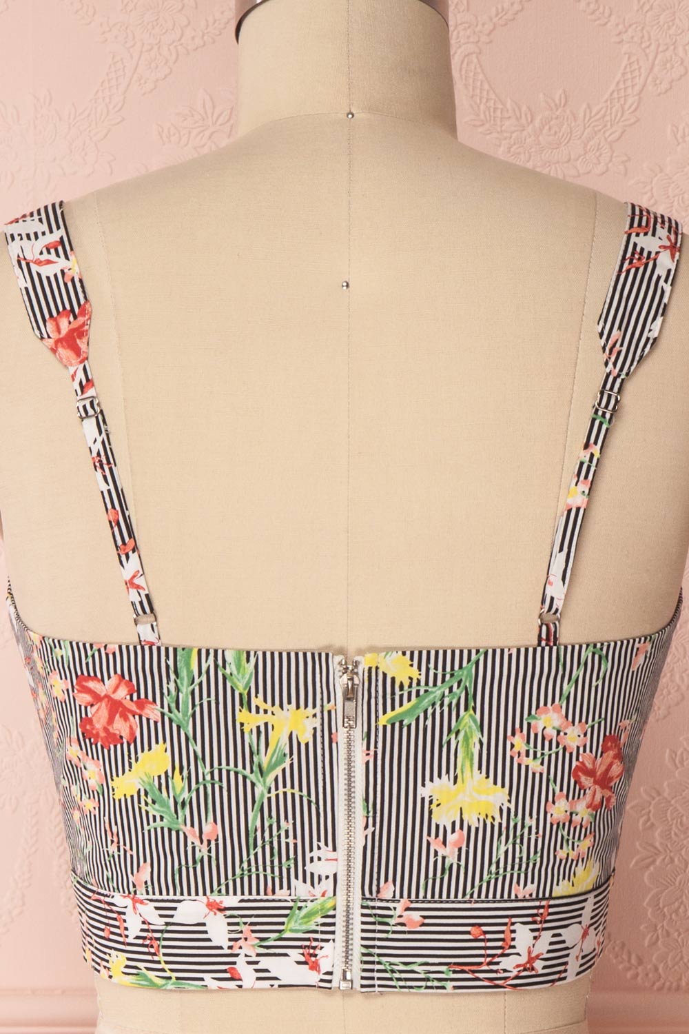 If you welcome spring flowers with radiant joy, you'll adore this beautiful crop top! The mix of stripes and colourful patterns will enchant you, as will the retro knotted sweetheart neckline. A zipper in back will prove practical, as will the adjustable straps. Pair it with the matching skirt GRISELL for a festive and adorable outfit!