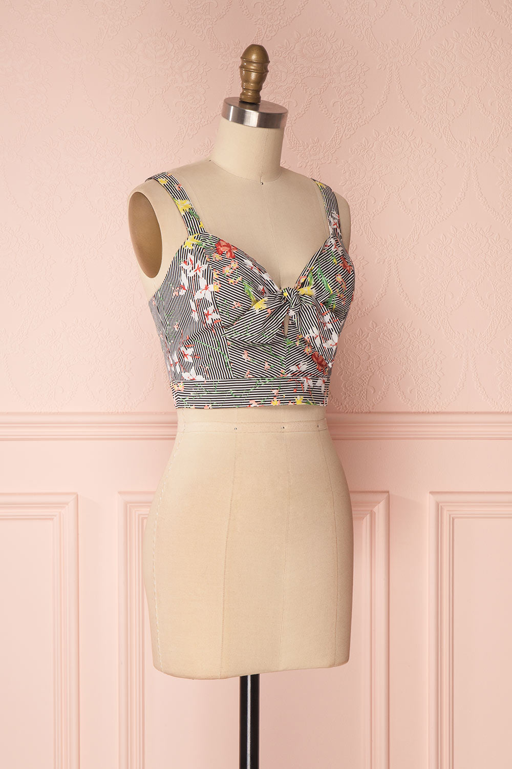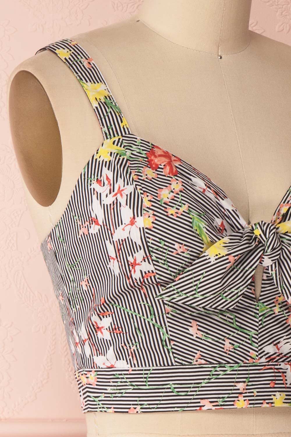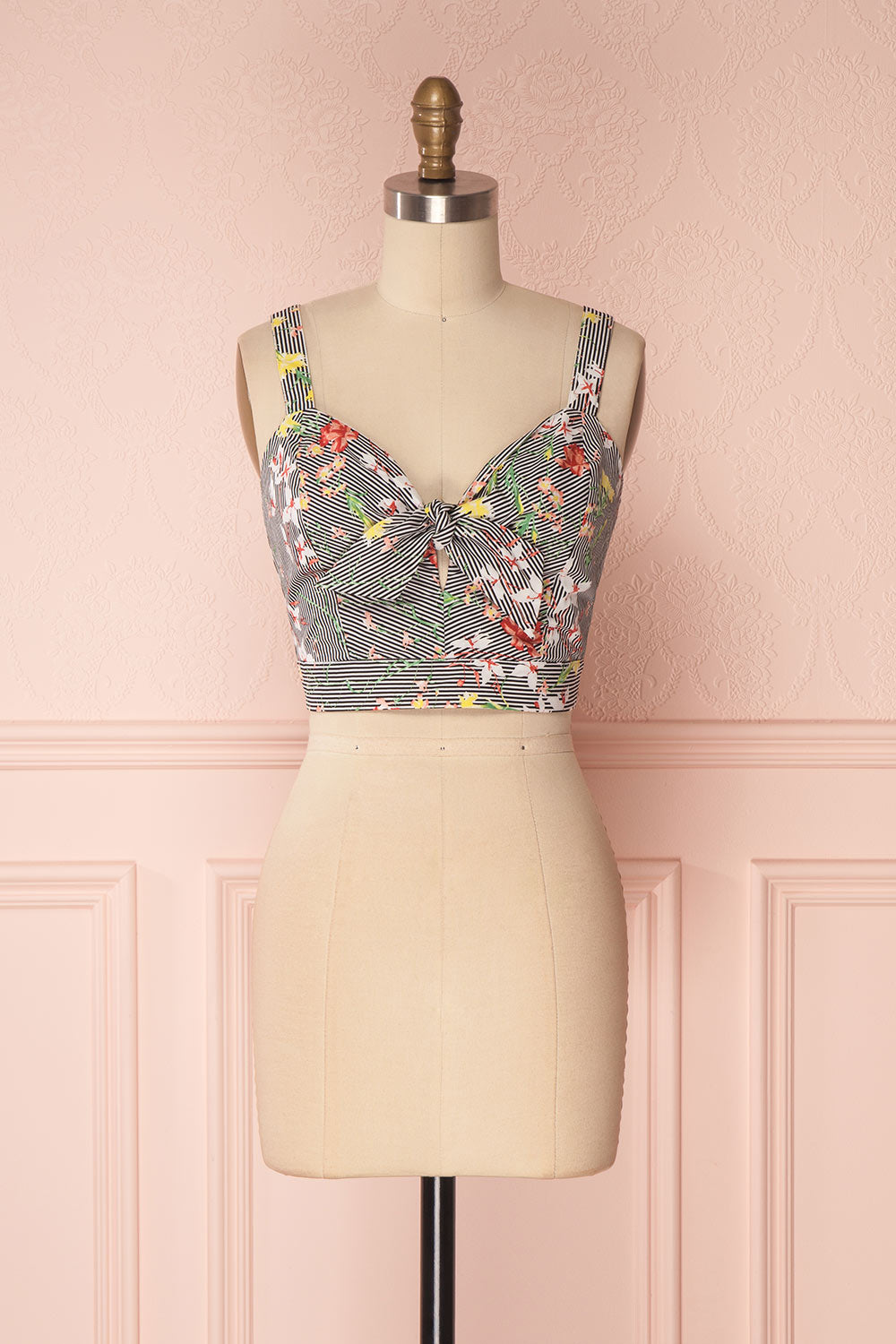 If you welcome spring flowers with radiant joy, you'll adore this beautiful crop top! The mix of stripes and colourful patterns will enchant you, as will the retro knotted sweetheart neckline. A zipper in back will prove practical, as will the adjustable straps. Pair it with the matching skirt GRISELL for a festive and adorable outfit!