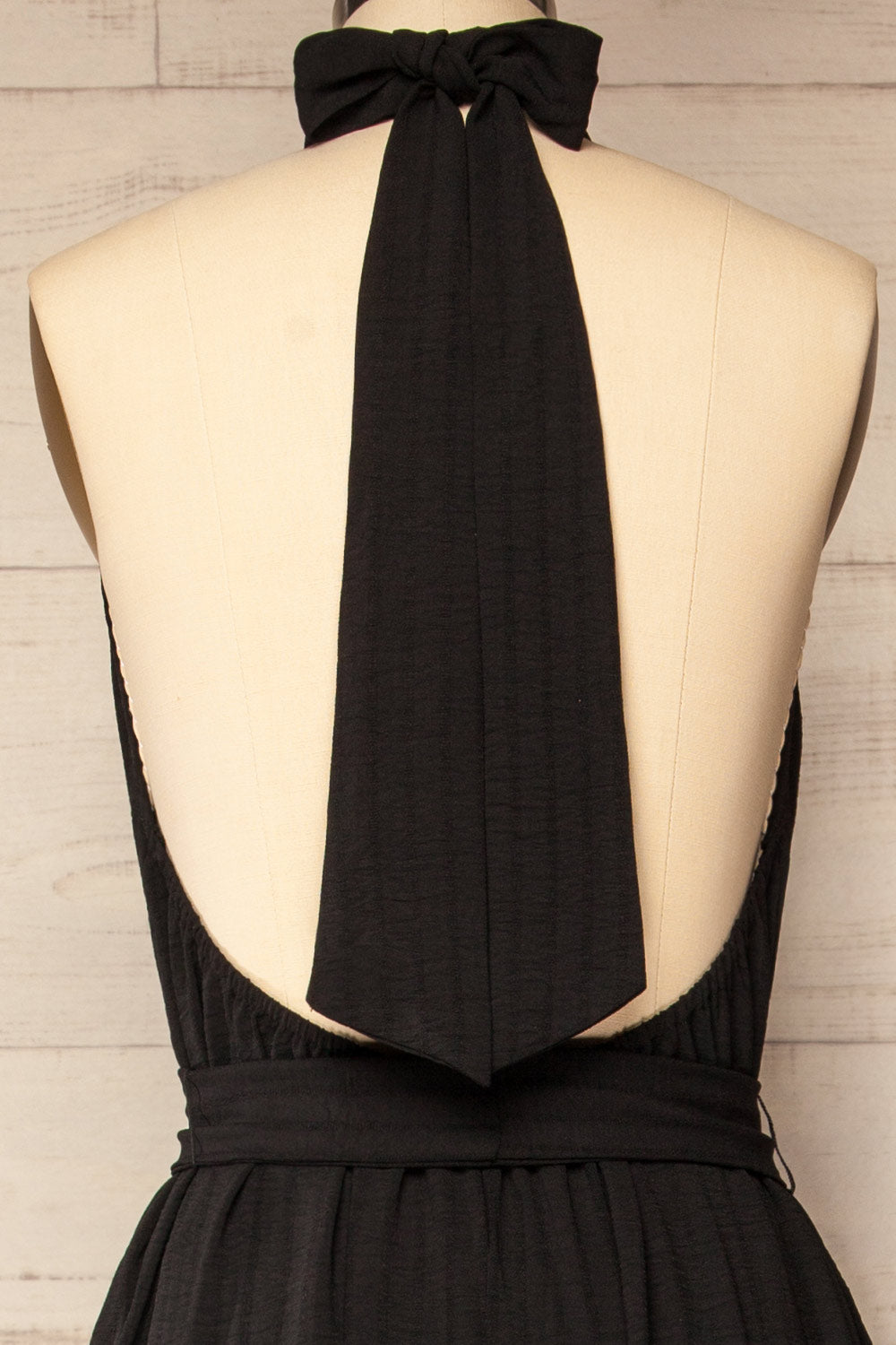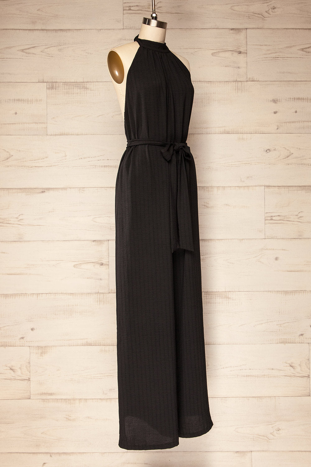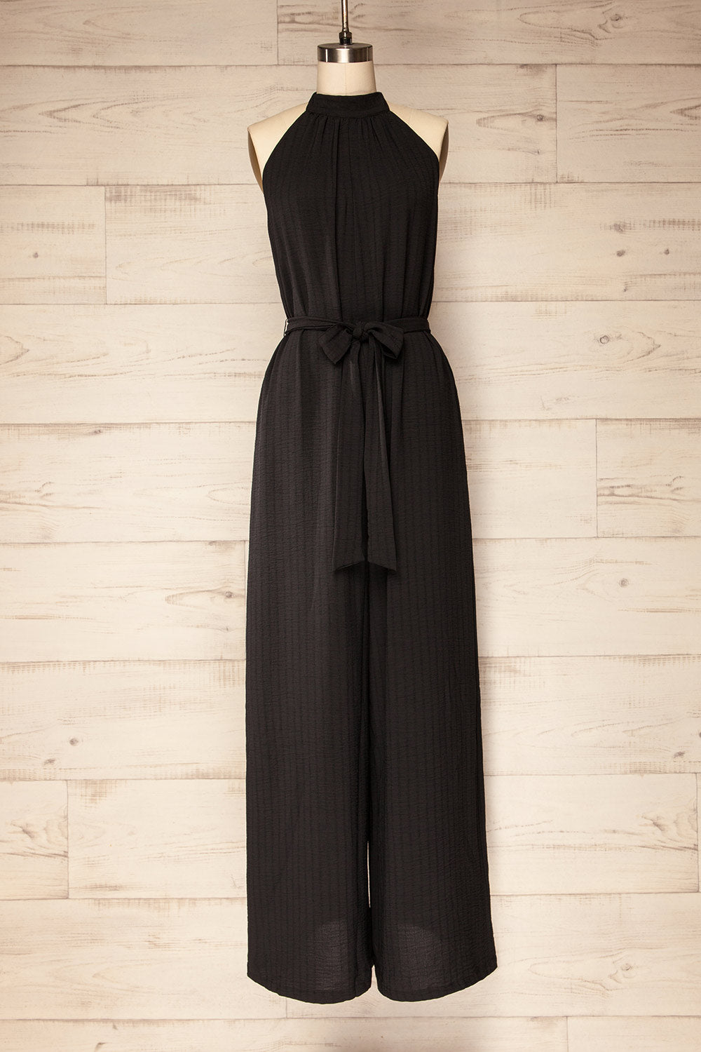Vous adorerez cette combinaison à jambe large! Faite d'un tissu léger noir à subtiles rayures monochromes, cette pièce vous gardera confortable tout en étant tendance. Son encolure licou peut être nouée en une jolie boucle afin de complimenter son dos ouvert qui révèlera votre peau. Sa coupe ample est ajustable grâce à sa ceinture de tissu qui vous permettra de cintrer la silhouette selon vos désirs. L'élastique au bas du dos assurera votre confort!