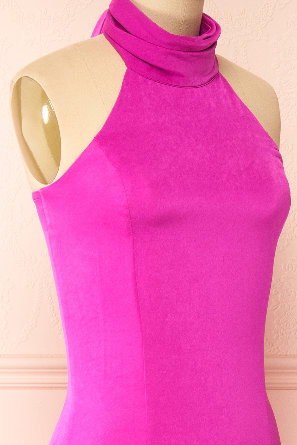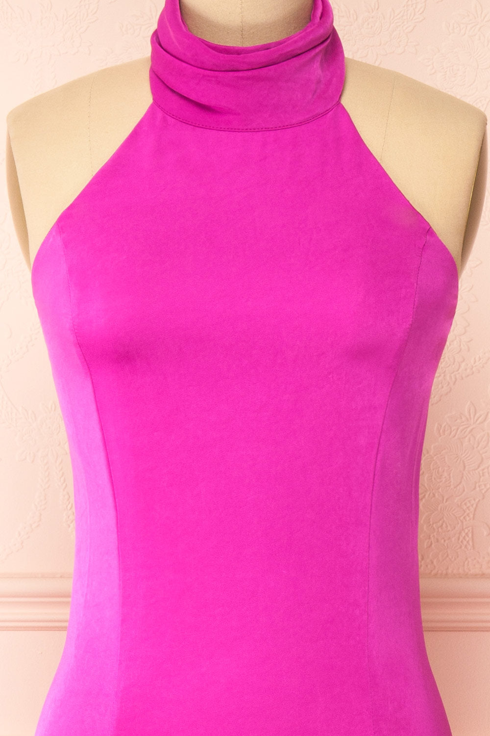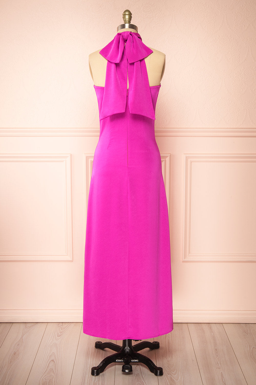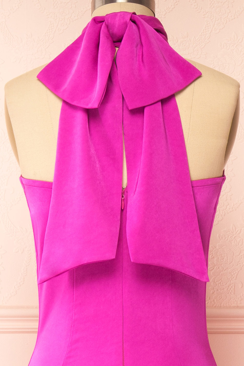 Faites une entrée spectaculaire dans cette superbe robe en satin fuchsia, un long chef-d'œuvre ravissant qui respire l'élégance et la sophistication. Le col licou s’attache avec des boutons délicats, mais la pièce de résistance est le nœud surdimensionné à la nuque qui ajoute une touche de fantaisie à ce modèle déjà incroyable. Avec son corsage ajusté, sa fente mi-longue et sa fermeture éclair au dos, cette robe vous fera certainement sentir comme une vedette, prête à occuper le devant de la scène dans n'importe quelle pièce.