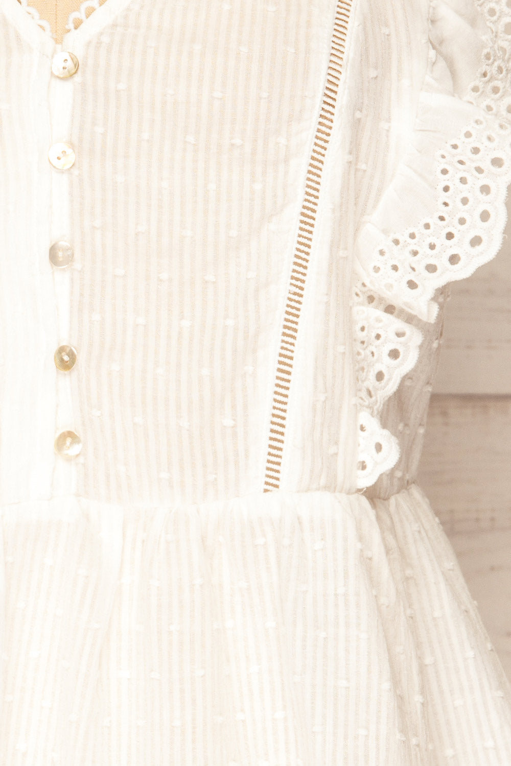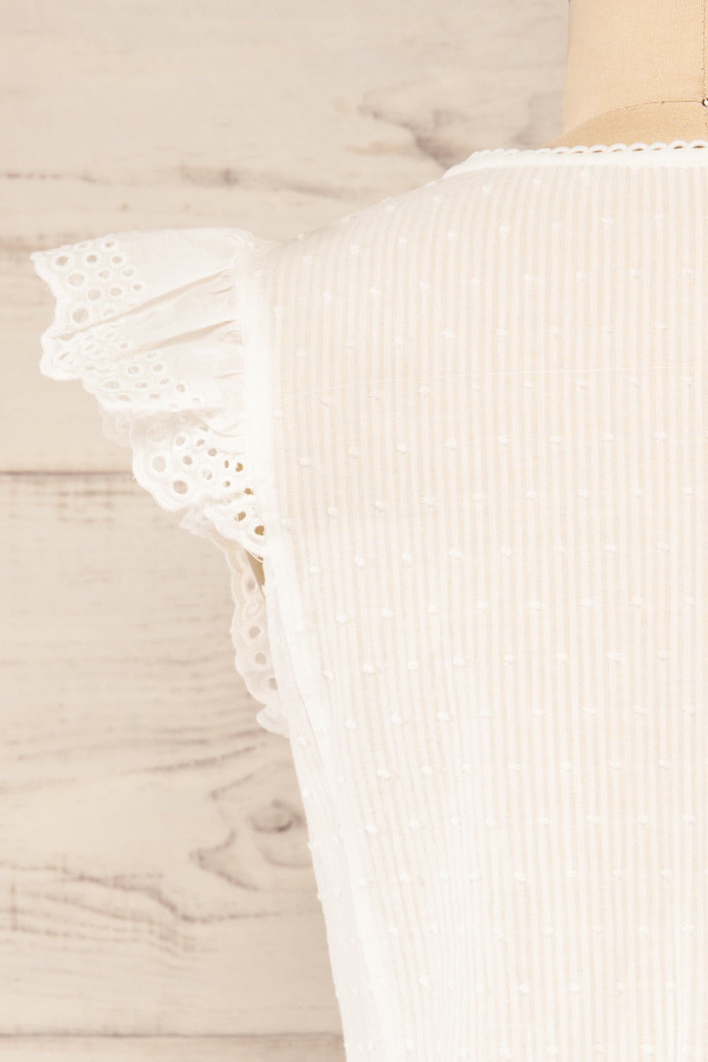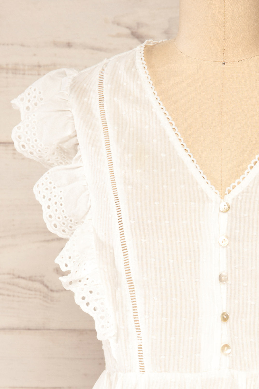 Cette charmante blouse en dentelle ajourée sera un coup de coeur assuré! Les volants placés aux épaules sauront ajouter du volume à la pièce, alors que son tissu texturé lui donnera une allure élégante. Son col en v plongeant complimenté par les boutons dévoilera votre peau de façon délicate. Accompagné d’une jupe courte en denim ou d’un pantalon léger, ce ravissant haut vous garantira une tenue des plus adorables.