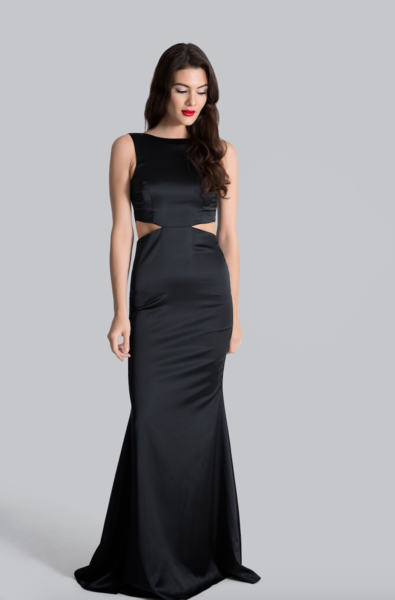 Vous serez une sublime vision en arborant cette robe de soirée faite à Montréal à l'élégance indéniable. La coupe sirène classique contraste avec l'audace des découpes au niveau de la taille, offrant ainsi un ensemble unique et mémorable. Affichez un style distingué en choisissant des bijoux dorés et des escarpins noirs.