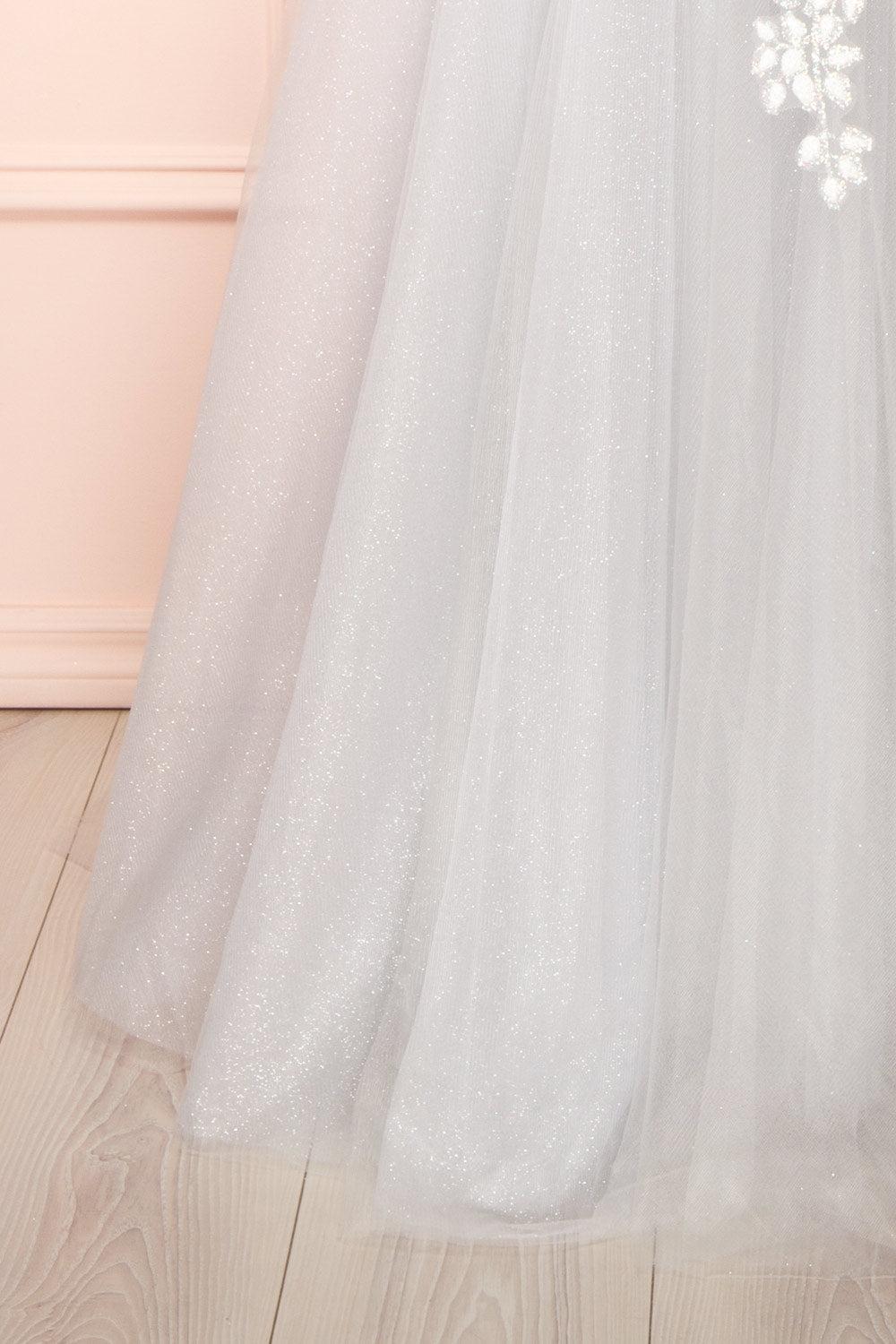 Laissez cette robe suivre vos pas gracieusement lorsque vous danserez au son de votre ballade romantique préférée! Sa coupe ligne A et sa fente à l'avant vous permettront d'être tout simplement magnifique. Son buste rembourré vous offrira tout le support nécessaire tandis que sa tulle brillante et ses broderies perlées au buste feront tourner les regards lorsque vous entrerez la pièce. Mettez vos bijoux préférés et profitez de votre soirée!